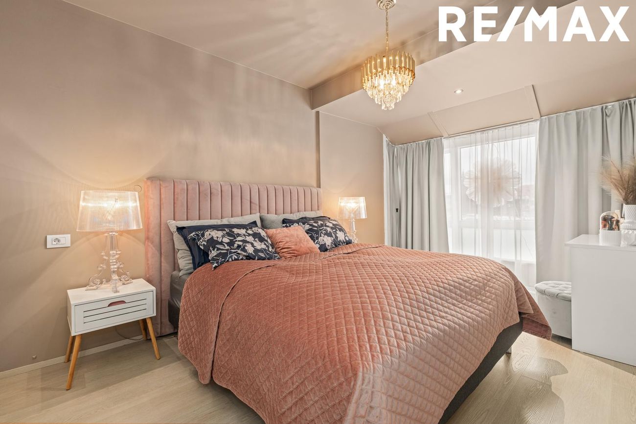 4 svefnherbergi með parketgólfi. Hjónaherbergi með sólskála í suðurátt, herbergi sameinuð úr tveimur rýmum.