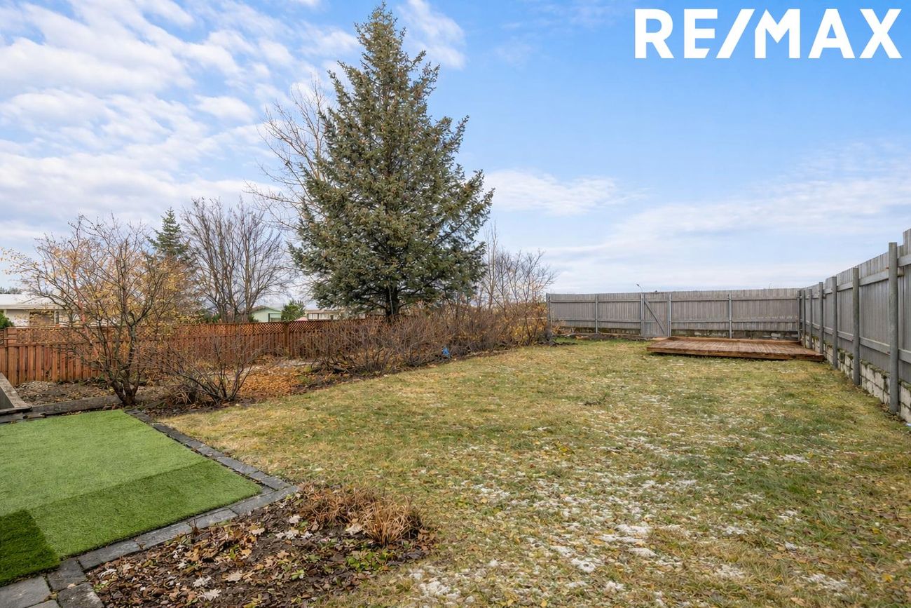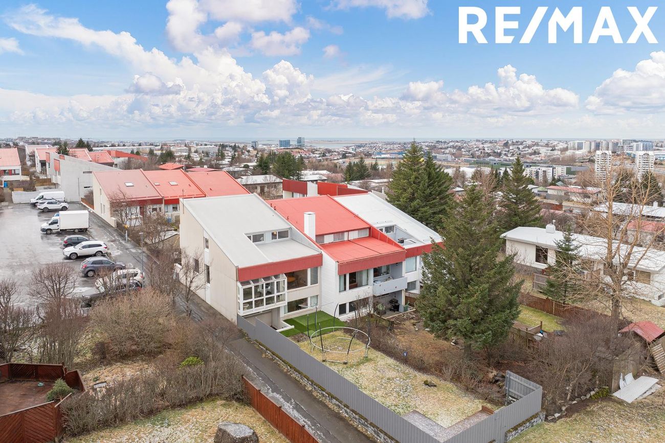 Stór gróin lóð með skjólríkum garði, fallegu fjallaútsýni og samgesta svæði í U-lögun.