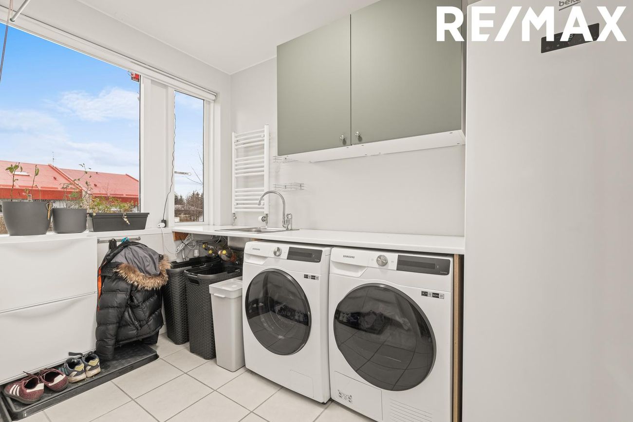 Rúmgott þvottahús með plássi fyrir þvottavél, þurrkara, ísskáp og handklæðaofn.