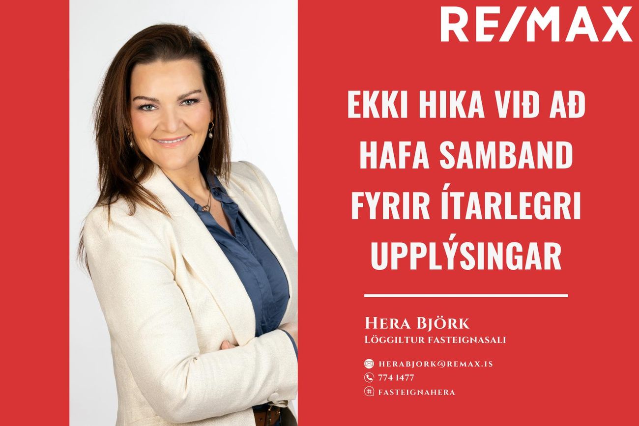 Bílskúr (19,5 m²) með heitu/köldu vatni, hurðaopnara, rafhleðslu, millilofti og geymslu.