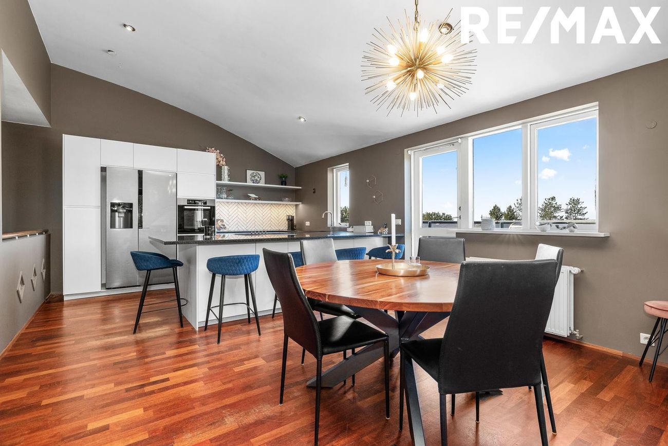 Borðstofa og stofa: Stórt alrými með góðri lofthæð, parketi og stórum gluggum. Hér er hjarta heimilisins.