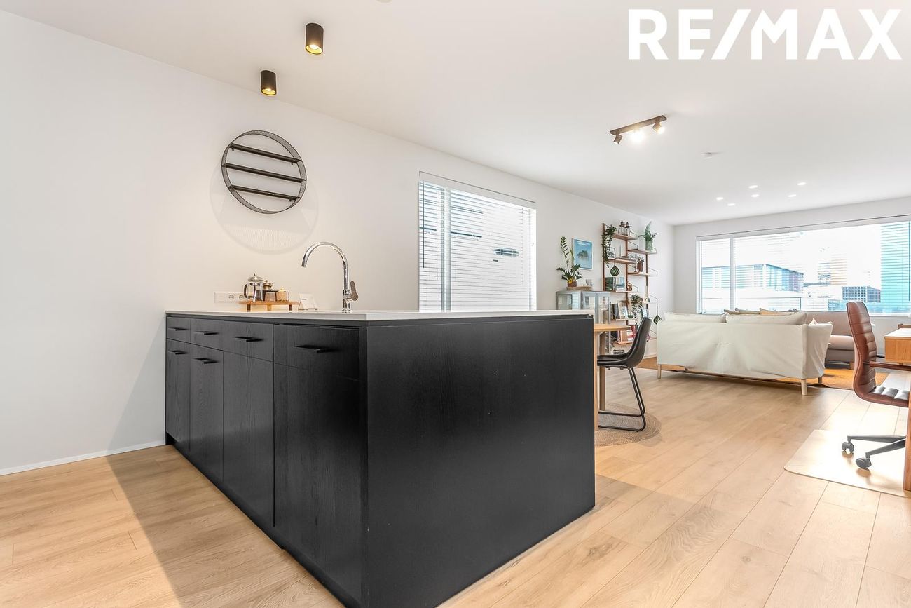 Eldhús: er opið með sérsmíðuðum innréttingum upp að lofti, öll tæki eru frá viðurkenndum aðila. Ísskápur, spanhelluborð, ofn og uppþvottavél eru öll frá AEG. Stór eyja með miklu borðplássi. Hvítur kvartssteinn er á yfirborði eldhússins.