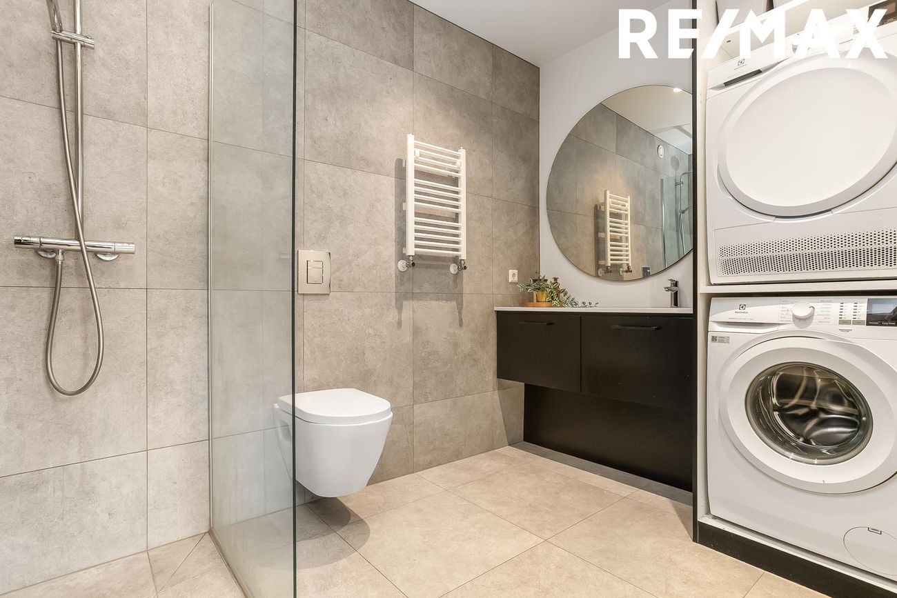 Flísalagt baðherbergi með vönduðum tækjum, sérsmíðuðum innréttingum og þvottaaðstöðu.