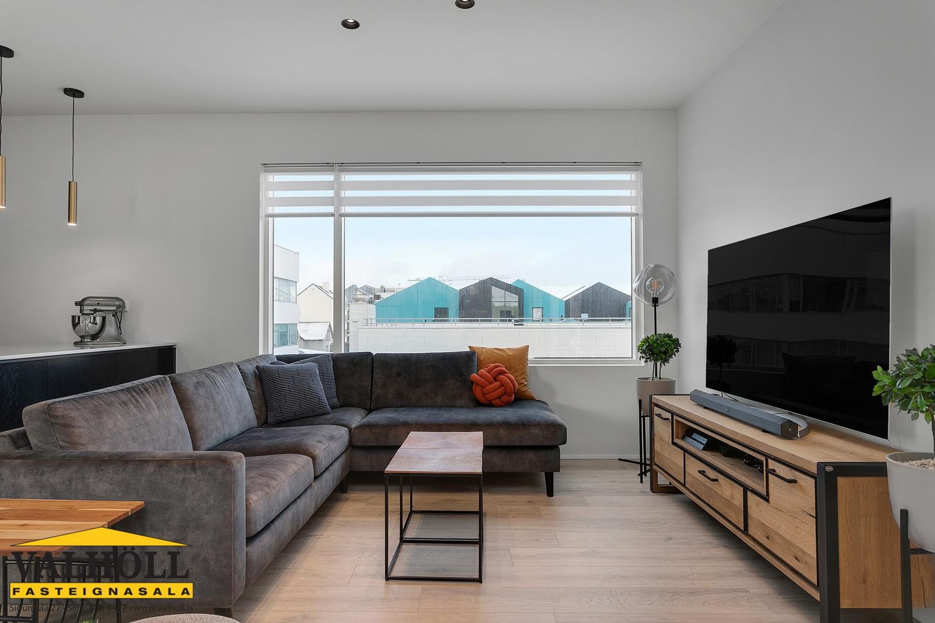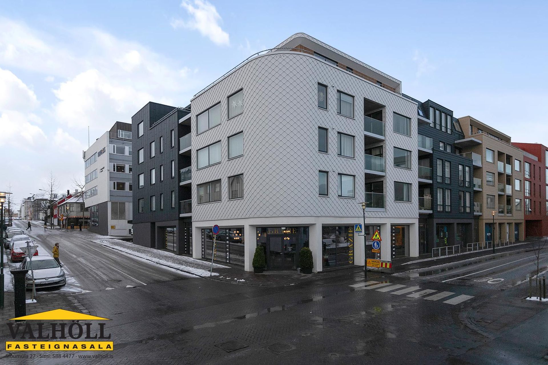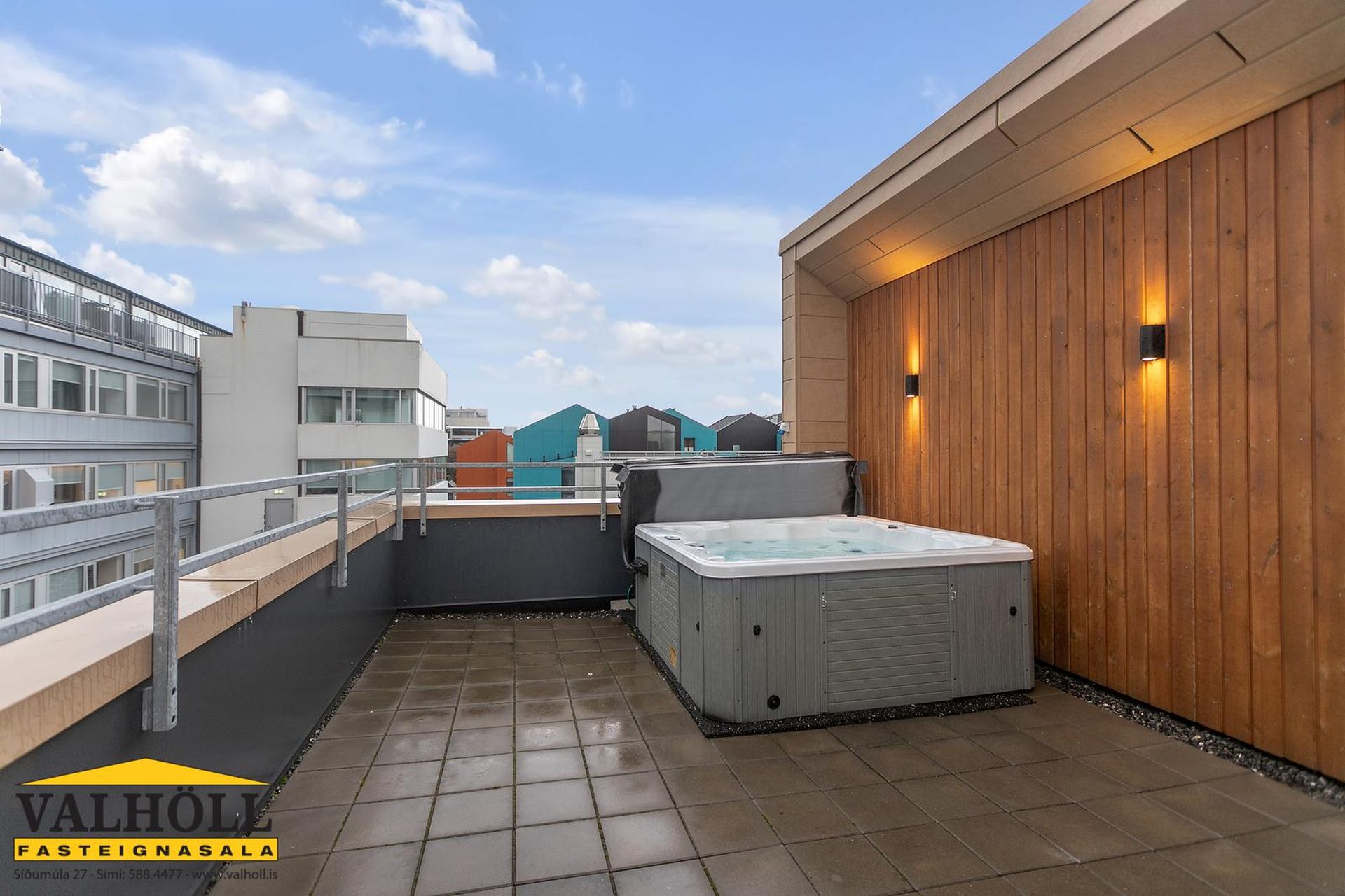 Valhöll fasteignasala kynnir nýlega og stórglæsilega 3ja herbergja hönnunaríbúð á efstu hæð, “penthouse stíl”, með einstökum 45,6 fm þaksvölum til suðurs með heitum potti ásamt stæði í bílageymslu á besta stað í bænum á horni Hverfisgötu og Barónstígs í miðbæ Reykjavíkur. Í heildina er eignin skráð 106,6 fm á stærð sem skiptist í 97,5 fm íbúð og 9,1 fm geymslu í kjallara. Þaksvalirnar eru umfram skráða fermetra. Eignin er sérlega vönduð og allt efnisval smekklega hannað og valið af Berglindi Berndsen og Helgu Sigurbjarnar innanhúshönnuðum, Rut Káradóttir hannaði anddyri hússins. Það eru eingöngu tvær íbúðir á hæðinni. Í eldhúsi og baðherbergi eru borðplötur úr ljósu kvarts efni og vaskar undirlímdir. Innréttingar og fataskápar eru sérsmíðaðar með svartlökkuðum viðarspón og ná upp að lofti. Innihurðir eru sömuleiðis úr svartlökkuðum viðarspón sem gefur fallegan heildarsvip yfir íbúðina. Ljóst harðparket er á gólfum og flísar á baðherbergi. Gólfhiti er íbúðinni með stýringum fyrir hvert herbergi.Þaksvalirnar eru hellulagðar og viðarklæðning á veggjum við svalirnar gefur hlýlegt og fágað yfirbragð. Þær eru afar sólríkar, snúa mót suðri en njóta einnig austur og vestur sólar. Heitur pottur er á svölunum. Húsið er einangrað og klætt að utan með sérlega fallegri læstri álklæðningu frá Prefa í Þýskalandi sem er með mismunandi litum og áferð og gerir húsið sérlega glæsilegt og einstakt. Öll hönnun hússins miðar að því að frágangur verði vandaður og viðhaldsléttur.Íbúðir eru á 2. - 5. hæð og verslunar- og veitingarými á jarhæð. Opnunartími atvinnurýma á jarðhæð er eingöngu til 23:00.Myndavélakerfi er í sameign hússins ásamt talnakóðastýringu á helstu aðgangsrýmum. Þetta er glæsileg íbúð á besta stað í miðbæ Reykjavíkur, íbúðin er í mikilli nálægð við menningu miðbæjarins en nógu fjarri til að vera laus við óæskilegan nið sem getur fylgt næturlífinu. Nánari lýsing:Anddyri: með fataskáp.Svefnherbergi I: með fataskáp og fallegum gólfsíðum glugga með útsýni yfir á Perluna.Svefnherbergi II: með fataskáp.Baðherbergi með innréttingu, aðstöðu fyrir þvottavél og þurrkara inn í innréttingu, upphengdu og innbyggðu salerni, “walk in” sturtu og handklæðaofni.Eldhús: með stórri eyju, AEG spanhelluborði og innbyggðri viftu, AEG blástursofni, uppþvottavél, tvöföldum LG ísskáp með klakavél sem fylgir.Stofa og borðstofa: í opnu og stóru alrými með eldhúsinu, með innfelldri lýsingu í lofti, gólfsíðum og björtum gluggum og útgengi á þaksvalir.Sameiginleg hjólageymsla: í kjallara með góðri líkamsræktaraðstöðu.Sérgeymsla: upphituð í kjallara inn af bílageymslu.Sérbílastæði í bílageymslu: Hleðsla er komin fyrir rafmagnsbíl. Mögulegt er að leigja auka bílastæði á Vitatorgi fyrir 9000kr á mánuði.Sameiginlegur garður: Lokaður, á annarri hæð.Nánari upplýsingar veitir:Óskar H. Bjarnasen fasteignasali / lögmaður í síma 691-1931 eða á netfanginu Um skoðunar- og aðgæsluskyldu:Í lögum um fasteignakaup nr. 40/2002 er kveðið á um ríka skoðunarskyldu kaupenda á fasteignum. Valhöll fasteignasala bendir væntanlegum kaupendum á að kynna sér vel ástand fasteigna við skoðun og fyrir tilboðsgerð og ef þurfa þykir að leita til sérfræðinga um nánari ástandsskoðun.Forsendur söluyfirlits:Söluyfirlit er samið af fasteignasala í samræmi við ákvæði laga nr. 70/2015. Þær upplýsingar sem fram koma í söluyfirliti þessu eru sóttar í opinberar skrár, til seljanda sjálfs og eftir atvikum til húsfélags. Seljandi veitir upplýsingar um eign í samræmi við upplýsingaskyldu laga um fasteignakaup nr. 40/2002. Fasteignasali sannreynir að þær upplýsingar séu réttar með sjónskoðun á eigninni. Fasteignasali getur ekki fullyrt um ástand og eiginleika þeirra hluta fasteigna sem ekki eru aðgengilegir og sjást ekki berum augum, t.d. lagnir, dren, skólp og þak.Gjöld sem kaupandi þarf að standa straum af vegna kaupanna:Stimpilgjald af kaupsamningi sem er hlutfall af fasteignamati. Stimpilgjald er 0,8% fyrir einstaklinga og 1,6% fyrir lögaðila.Þinglýsingargjald af kaupsamningi, veðskuldabréfum, veðleyfum o.fl. Þinglýsingargjald er kr. 2.700,- fyrir hvert skjal.Lántökugjald lánastofnunar. Um lántökugjald vísast í gjaldskrá viðkomandi lánveitanda.Umsýsluþóknun fasteignasölu skv. gjaldskrá.Ef um nýbyggingu er að ræða greiðir kaupandi skipulagsgjald, 0,3% af brunabótamáti, þegar það er lagt á.