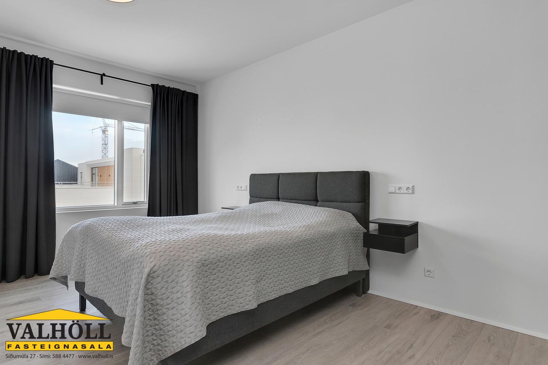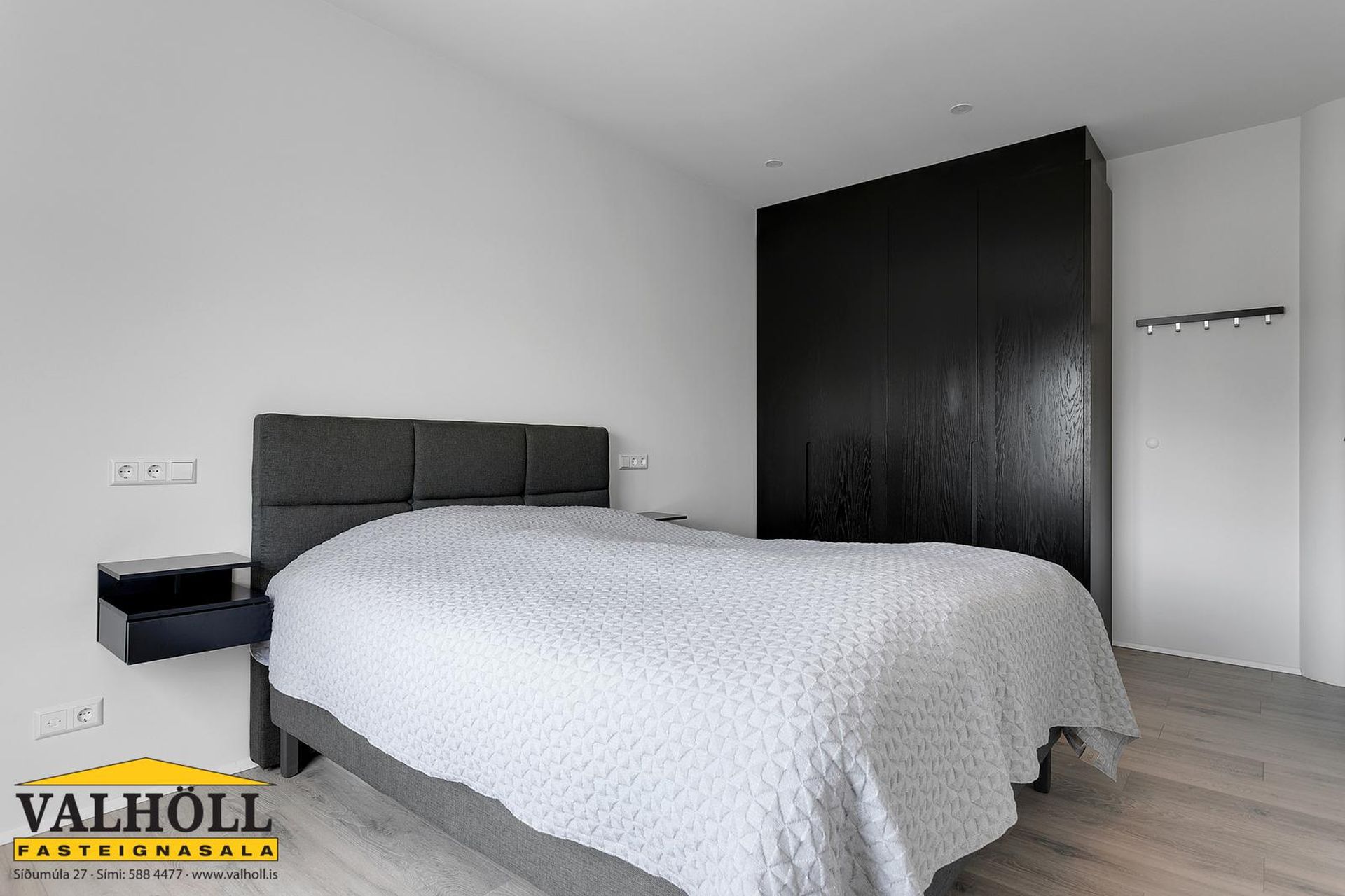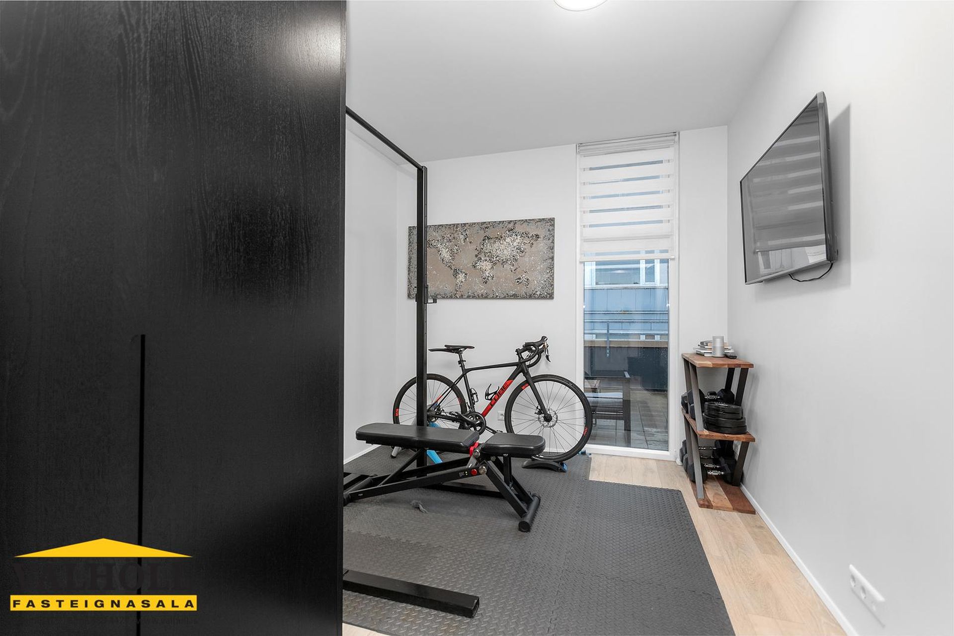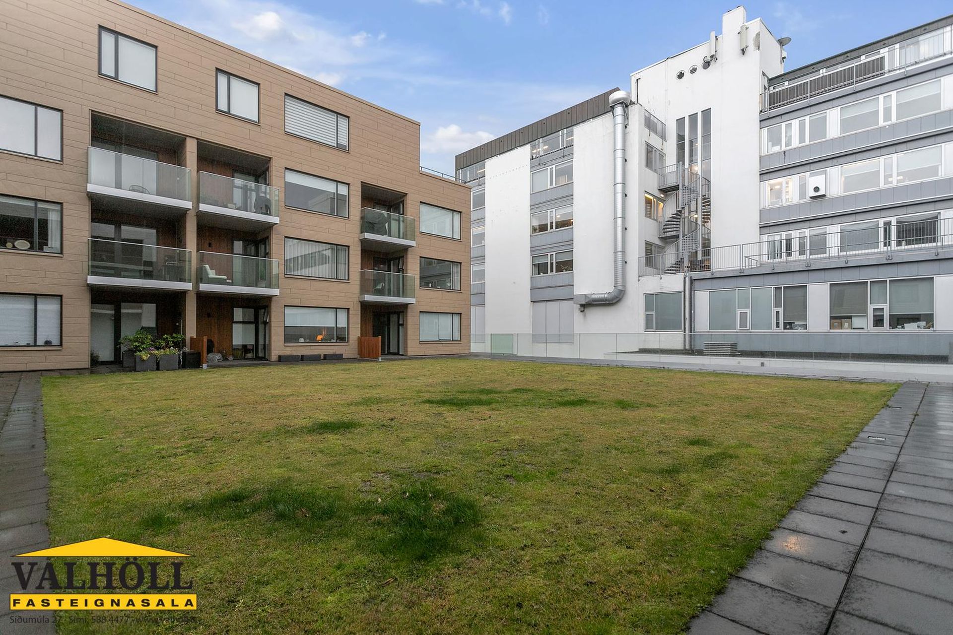 Valhöll fasteignasala kynnir nýlega og stórglæsilega 3ja herbergja hönnunaríbúð á efstu hæð, “penthouse stíl”, með einstökum 45,6 fm þaksvölum til suðurs með heitum potti ásamt stæði í bílageymslu á besta stað í bænum á horni Hverfisgötu og Barónstígs í miðbæ Reykjavíkur. Í heildina er eignin skráð 106,6 fm á stærð sem skiptist í 97,5 fm íbúð og 9,1 fm geymslu í kjallara. Þaksvalirnar eru umfram skráða fermetra. Eignin er sérlega vönduð og allt efnisval smekklega hannað og valið af Berglindi Berndsen og Helgu Sigurbjarnar innanhúshönnuðum, Rut Káradóttir hannaði anddyri hússins. Það eru eingöngu tvær íbúðir á hæðinni. Í eldhúsi og baðherbergi eru borðplötur úr ljósu kvarts efni og vaskar undirlímdir. Innréttingar og fataskápar eru sérsmíðaðar með svartlökkuðum viðarspón og ná upp að lofti. Innihurðir eru sömuleiðis úr svartlökkuðum viðarspón sem gefur fallegan heildarsvip yfir íbúðina. Ljóst harðparket er á gólfum og flísar á baðherbergi. Gólfhiti er íbúðinni með stýringum fyrir hvert herbergi.Þaksvalirnar eru hellulagðar og viðarklæðning á veggjum við svalirnar gefur hlýlegt og fágað yfirbragð. Þær eru afar sólríkar, snúa mót suðri en njóta einnig austur og vestur sólar. Heitur pottur er á svölunum. Húsið er einangrað og klætt að utan með sérlega fallegri læstri álklæðningu frá Prefa í Þýskalandi sem er með mismunandi litum og áferð og gerir húsið sérlega glæsilegt og einstakt. Öll hönnun hússins miðar að því að frágangur verði vandaður og viðhaldsléttur.Íbúðir eru á 2. - 5. hæð og verslunar- og veitingarými á jarhæð. Opnunartími atvinnurýma á jarðhæð er eingöngu til 23:00.Myndavélakerfi er í sameign hússins ásamt talnakóðastýringu á helstu aðgangsrýmum. Þetta er glæsileg íbúð á besta stað í miðbæ Reykjavíkur, íbúðin er í mikilli nálægð við menningu miðbæjarins en nógu fjarri til að vera laus við óæskilegan nið sem getur fylgt næturlífinu. Nánari lýsing:Anddyri: með fataskáp.Svefnherbergi I: með fataskáp og fallegum gólfsíðum glugga með útsýni yfir á Perluna.Svefnherbergi II: með fataskáp.Baðherbergi með innréttingu, aðstöðu fyrir þvottavél og þurrkara inn í innréttingu, upphengdu og innbyggðu salerni, “walk in” sturtu og handklæðaofni.Eldhús: með stórri eyju, AEG spanhelluborði og innbyggðri viftu, AEG blástursofni, uppþvottavél, tvöföldum LG ísskáp með klakavél sem fylgir.Stofa og borðstofa: í opnu og stóru alrými með eldhúsinu, með innfelldri lýsingu í lofti, gólfsíðum og björtum gluggum og útgengi á þaksvalir.Sameiginleg hjólageymsla: í kjallara með góðri líkamsræktaraðstöðu.Sérgeymsla: upphituð í kjallara inn af bílageymslu.Sérbílastæði í bílageymslu: Hleðsla er komin fyrir rafmagnsbíl. Mögulegt er að leigja auka bílastæði á Vitatorgi fyrir 9000kr á mánuði.Sameiginlegur garður: Lokaður, á annarri hæð.Nánari upplýsingar veitir:Óskar H. Bjarnasen fasteignasali / lögmaður í síma 691-1931 eða á netfanginu Um skoðunar- og aðgæsluskyldu:Í lögum um fasteignakaup nr. 40/2002 er kveðið á um ríka skoðunarskyldu kaupenda á fasteignum. Valhöll fasteignasala bendir væntanlegum kaupendum á að kynna sér vel ástand fasteigna við skoðun og fyrir tilboðsgerð og ef þurfa þykir að leita til sérfræðinga um nánari ástandsskoðun.Forsendur söluyfirlits:Söluyfirlit er samið af fasteignasala í samræmi við ákvæði laga nr. 70/2015. Þær upplýsingar sem fram koma í söluyfirliti þessu eru sóttar í opinberar skrár, til seljanda sjálfs og eftir atvikum til húsfélags. Seljandi veitir upplýsingar um eign í samræmi við upplýsingaskyldu laga um fasteignakaup nr. 40/2002. Fasteignasali sannreynir að þær upplýsingar séu réttar með sjónskoðun á eigninni. Fasteignasali getur ekki fullyrt um ástand og eiginleika þeirra hluta fasteigna sem ekki eru aðgengilegir og sjást ekki berum augum, t.d. lagnir, dren, skólp og þak.Gjöld sem kaupandi þarf að standa straum af vegna kaupanna:Stimpilgjald af kaupsamningi sem er hlutfall af fasteignamati. Stimpilgjald er 0,8% fyrir einstaklinga og 1,6% fyrir lögaðila.Þinglýsingargjald af kaupsamningi, veðskuldabréfum, veðleyfum o.fl. Þinglýsingargjald er kr. 2.700,- fyrir hvert skjal.Lántökugjald lánastofnunar. Um lántökugjald vísast í gjaldskrá viðkomandi lánveitanda.Umsýsluþóknun fasteignasölu skv. gjaldskrá.Ef um nýbyggingu er að ræða greiðir kaupandi skipulagsgjald, 0,3% af brunabótamáti, þegar það er lagt á.