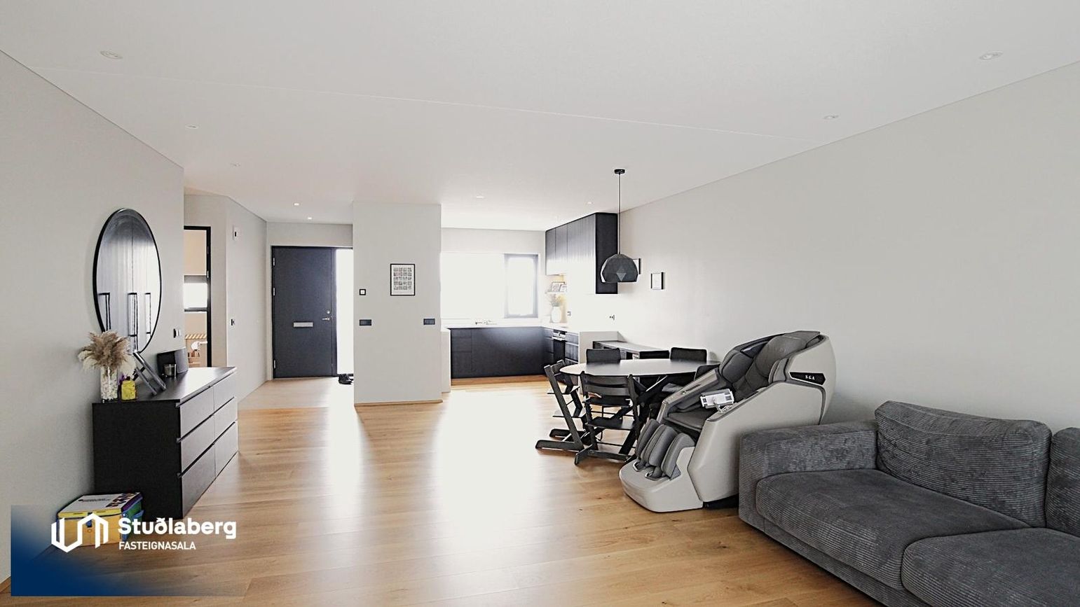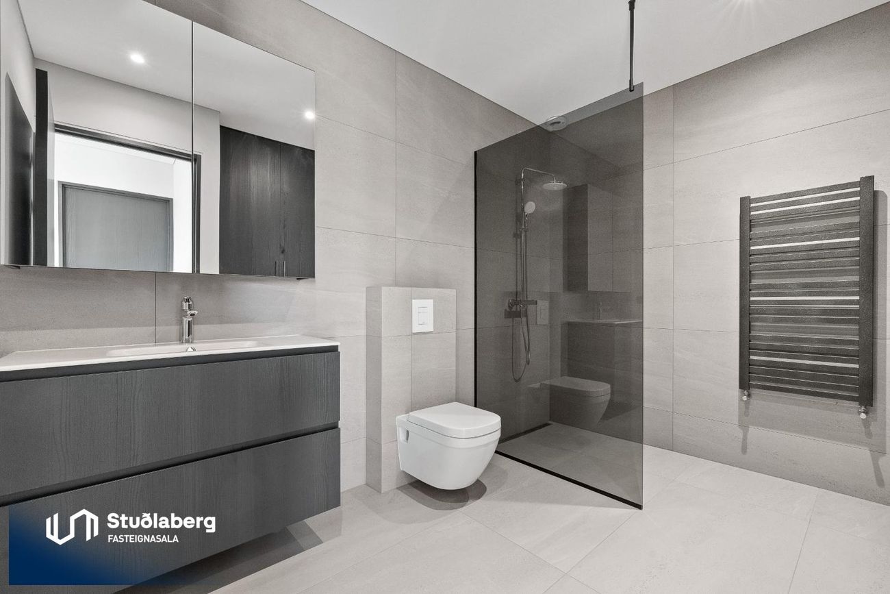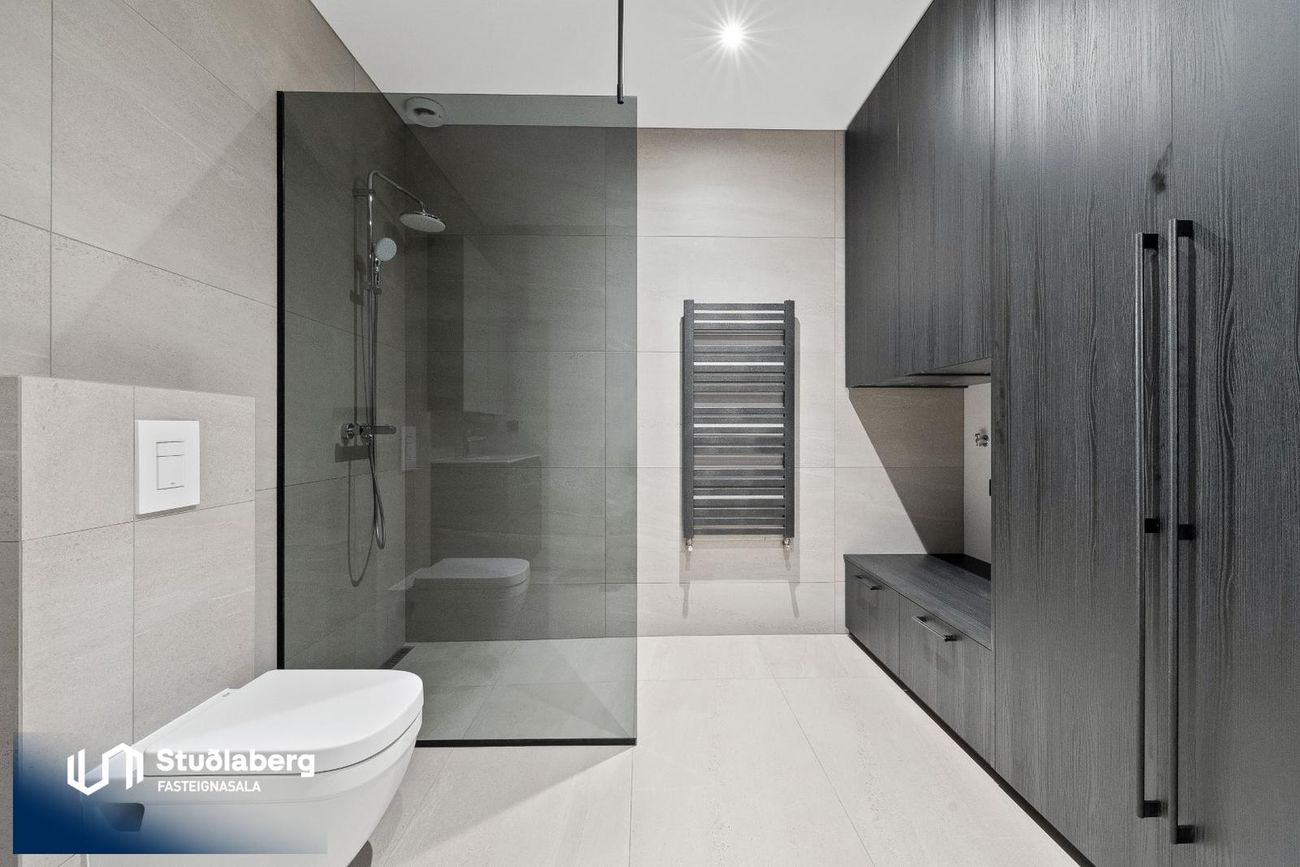 Á baðhebergi eru flísar bæði á gólfi og á veggjum, þar er falleg innrétting og góð aðstaða fyrir þvottavél og þurrkara, upphengt salerni, sturtuaðstaða stúkuð af með gleri og handklæðaofn.