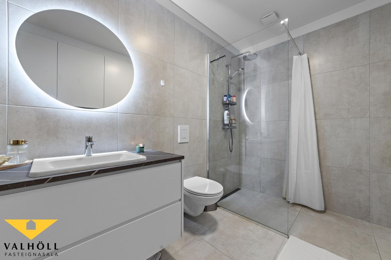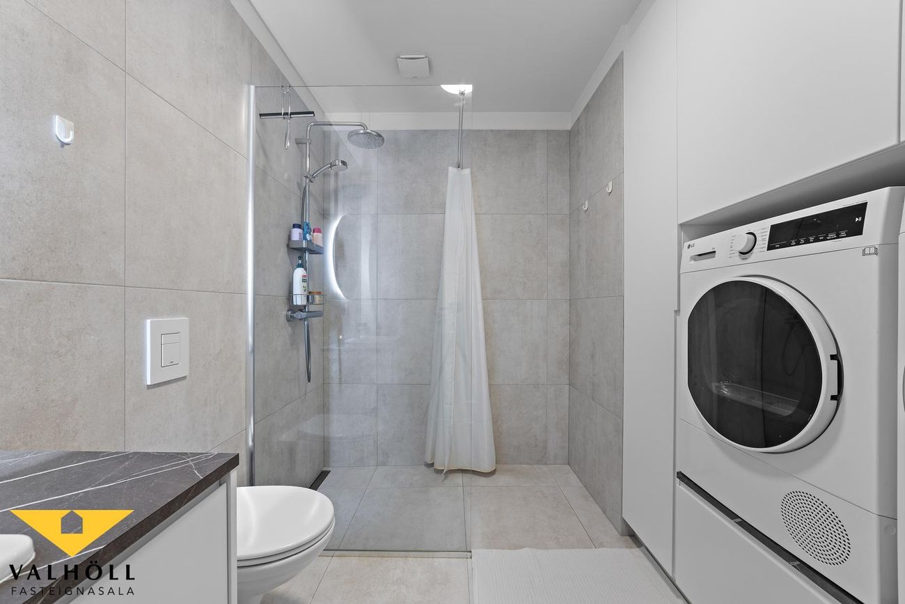 Baðherbergi með walk-in sturtu og upphengt salerni. Þvottavél og þurrkari í innréttingu innan baðherbergis.