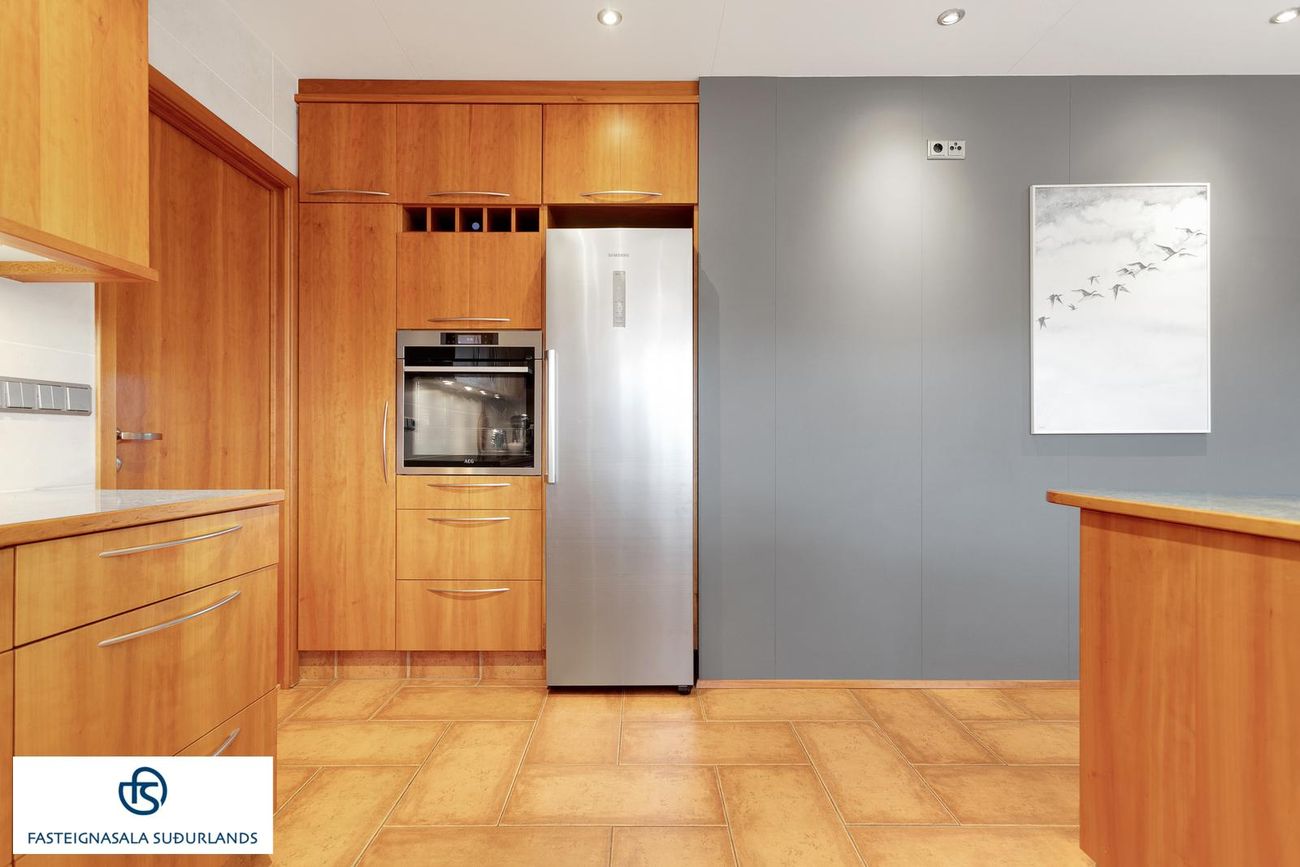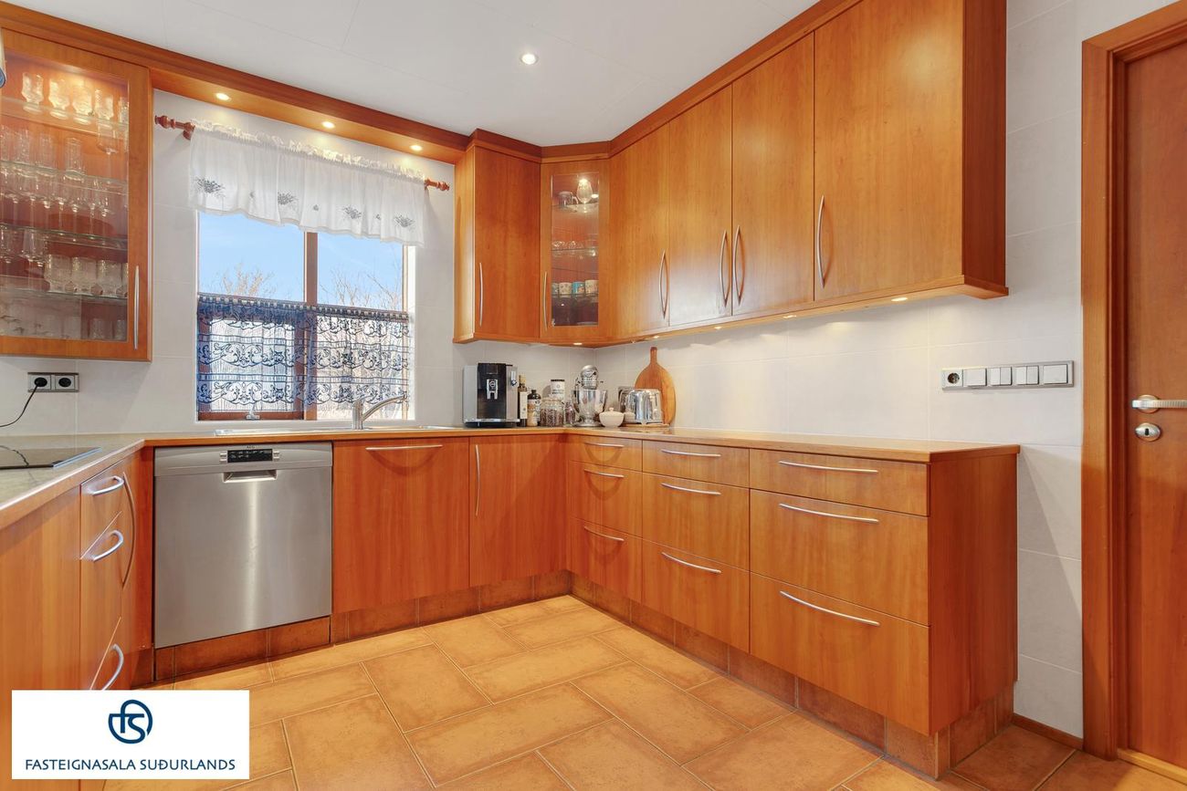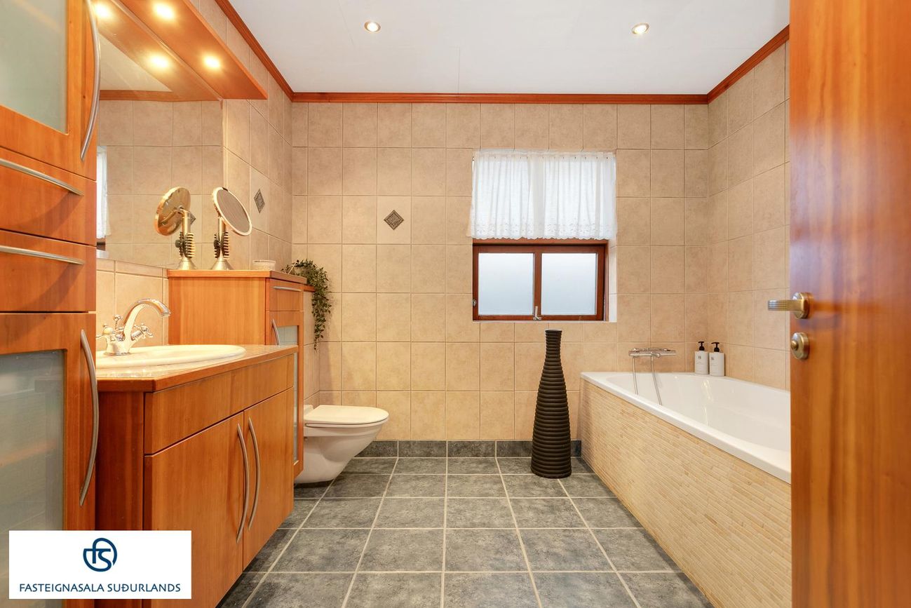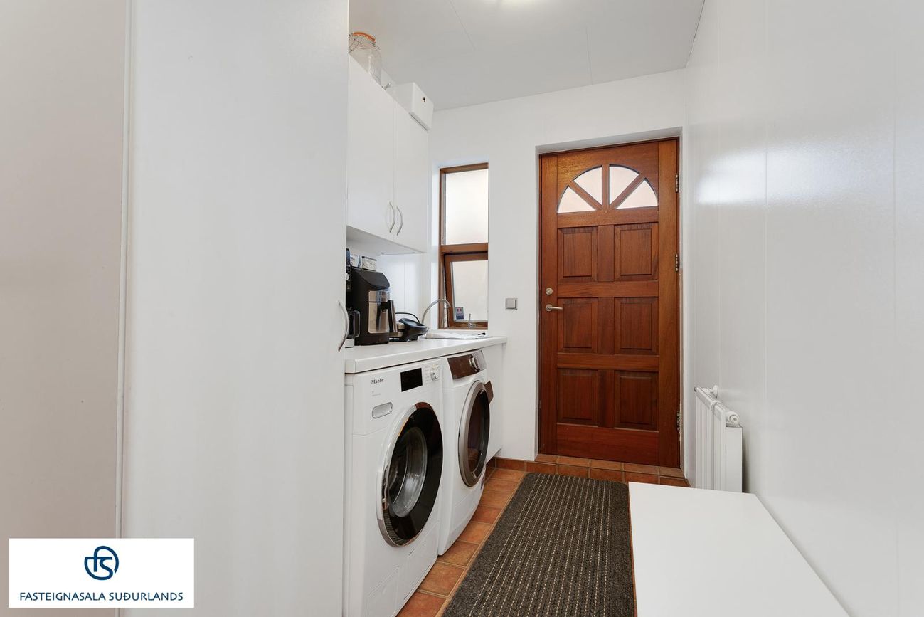* Stórt, flísalagt, þvottahús með innréttingu með skolvask og vinnuborði. Hiti í gólfi. Utangengt er úr þvottahúsinu. Úr þvottahúsinu er innangengt í bílskúrinn.