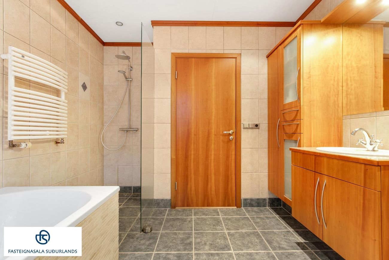 * Glæsilega stofu þaðan sem utangengt er á verönd. Stofan snýr í suður/vestur þannig að birtu nýtur þar alla daginn. * Fallegt baðherbergi með sérsmíðaðri innréttingu, baðkari og sturtu úr glerþili. Flísar á gólfi og veggjum. Hiti í gólfi.