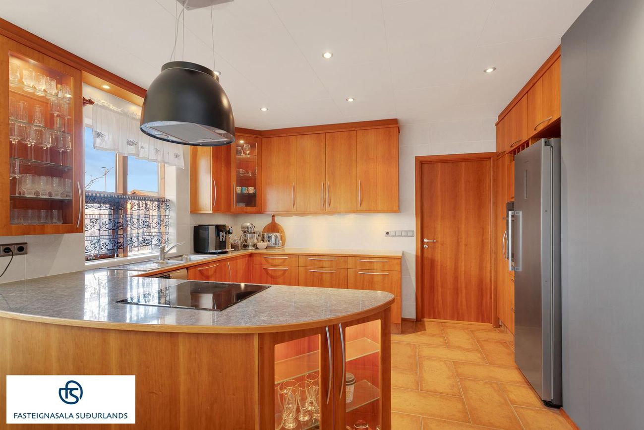 * Afar fallegt eldhús með sérsmíðaðri innréttingu með eyju og góðum borðkrók.