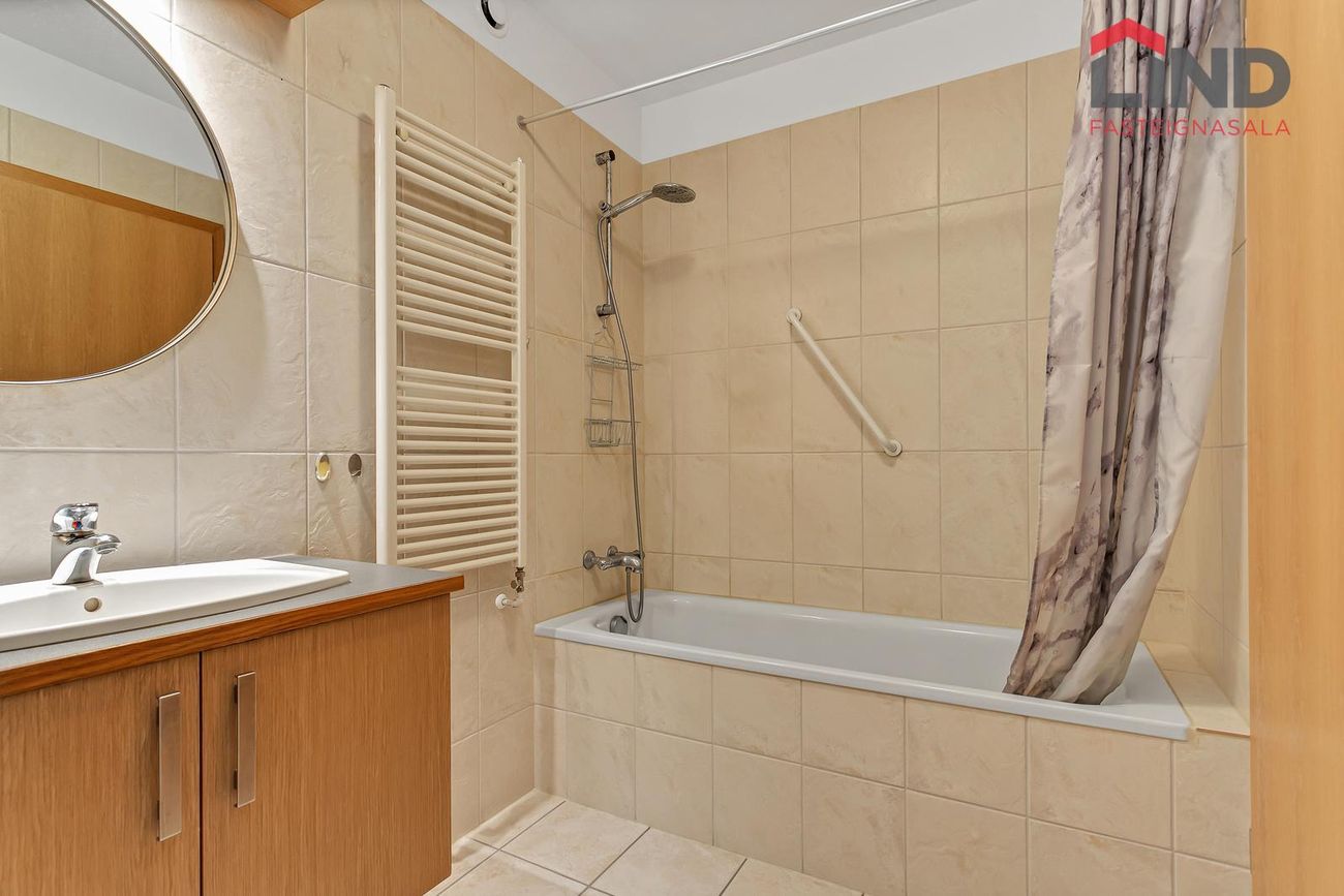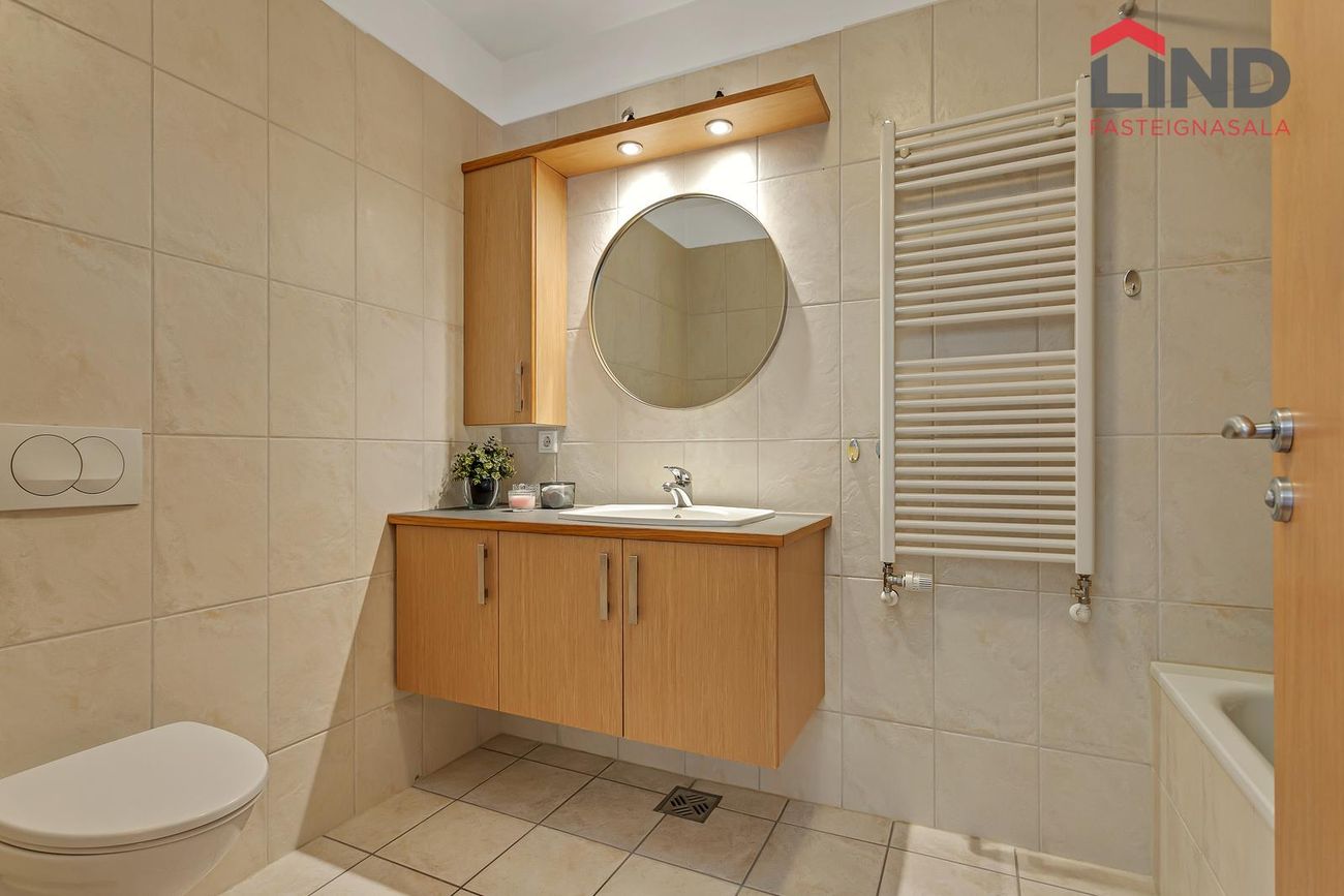 Baðherbergi: Eikarinnrétting með handlaug. Flísar á gólfi og veggjum, baðkar með sturtuaðstöðu, upphengt salerni, handklæðaofn.