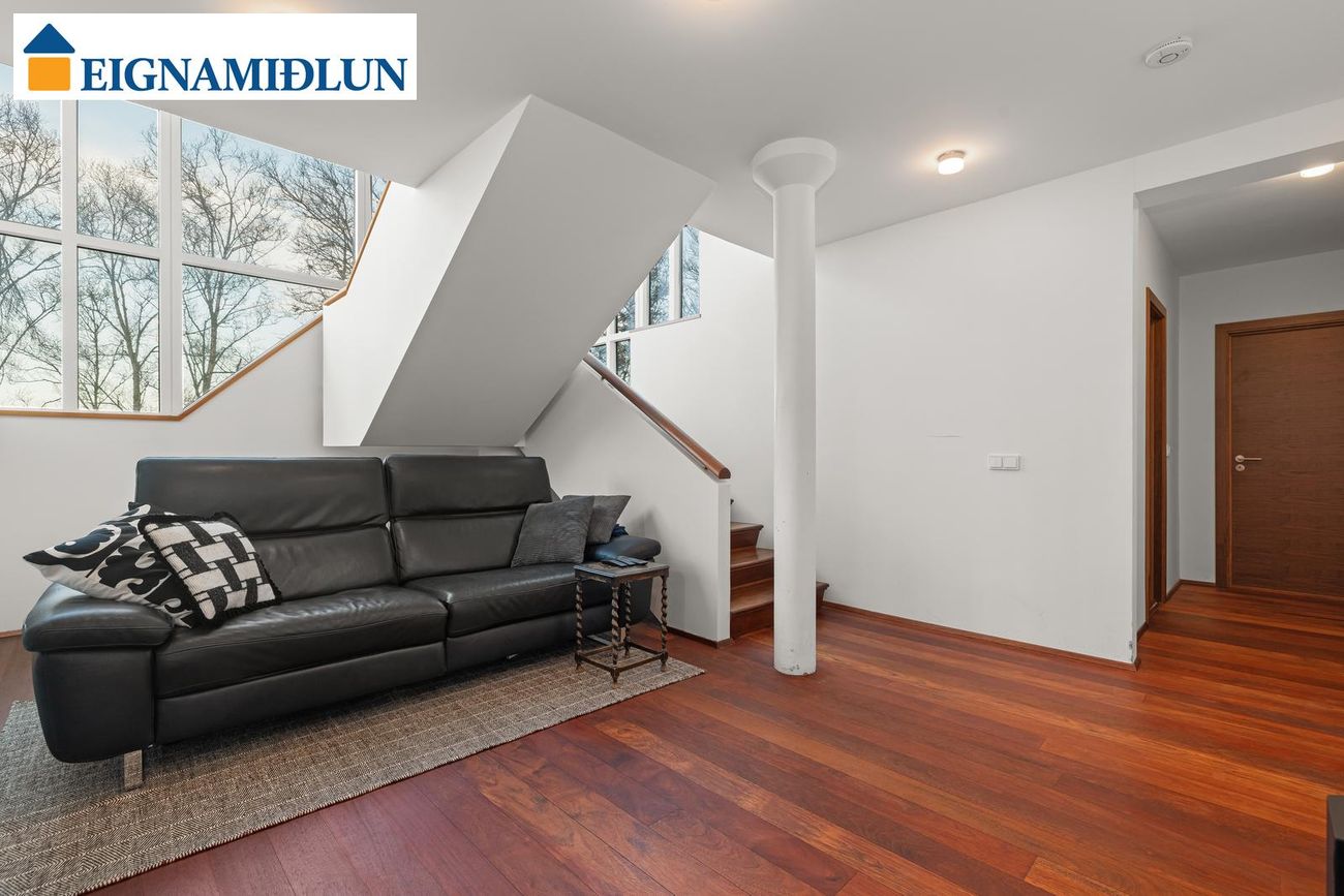 Fallegur stigi á milli hæða með parketi. Full lofthæð í ósamþykktu rýminu.