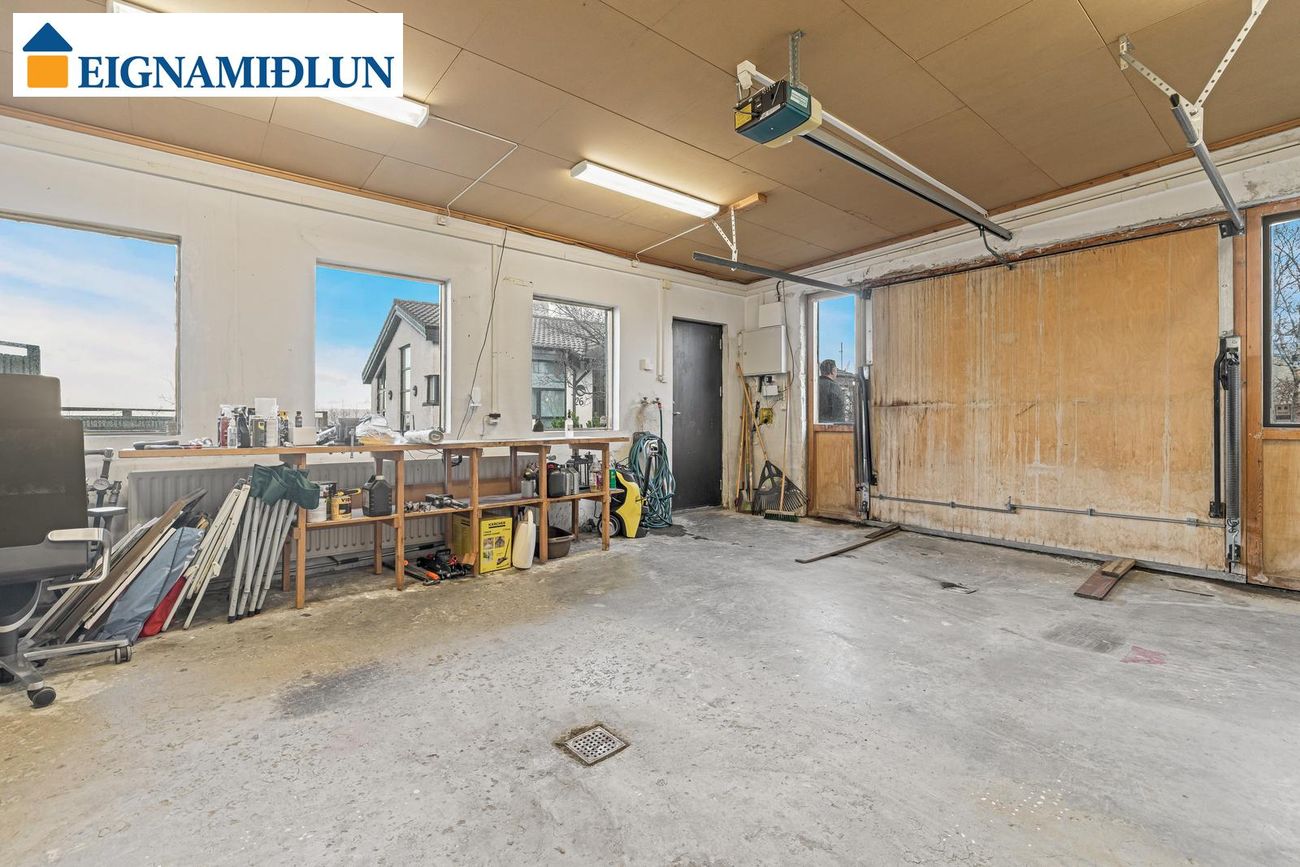 Stór bílskúr (42 fm) með steyptri plötu, heitu og köldu vatni, þriggja fasa rafmagni og rafmagnsopnara hurð.