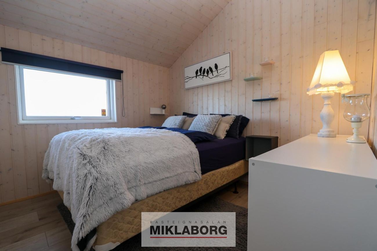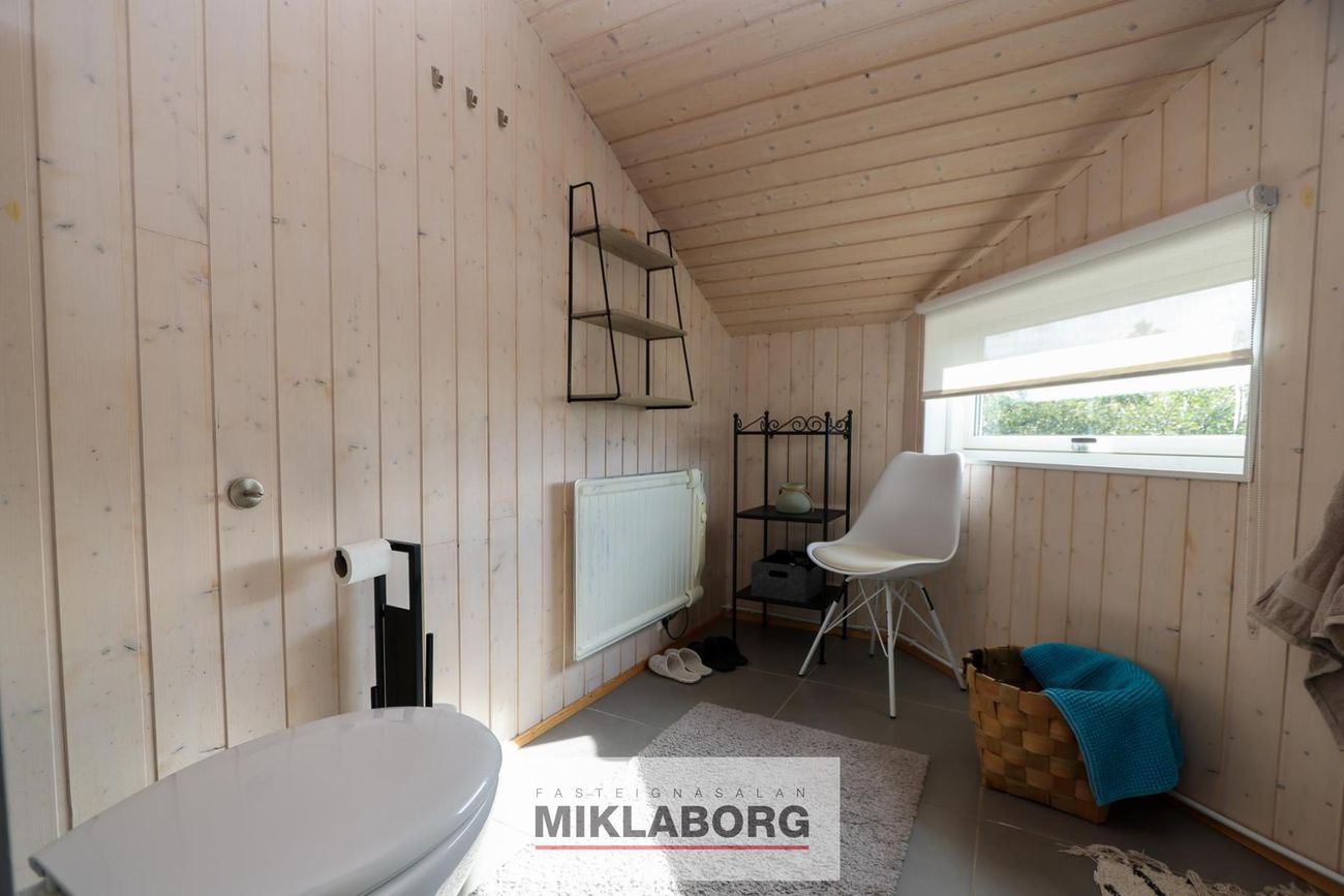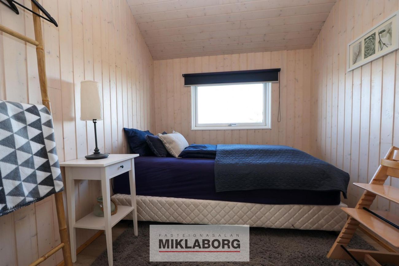Danskt EBK-hús á steyptri plötu, svart með svörtu þaki. Tveir inngangar: bakdyramegin inn á svefnherbergisgang og framdyramegin beint inn í stofu. Hvíttuð fura í loftum og á veggjum. Fallegt harðparket á öllum gólfum nema í geymslu og á baði. Ofnar og hagkvæm varmadæla fyrir hitun.