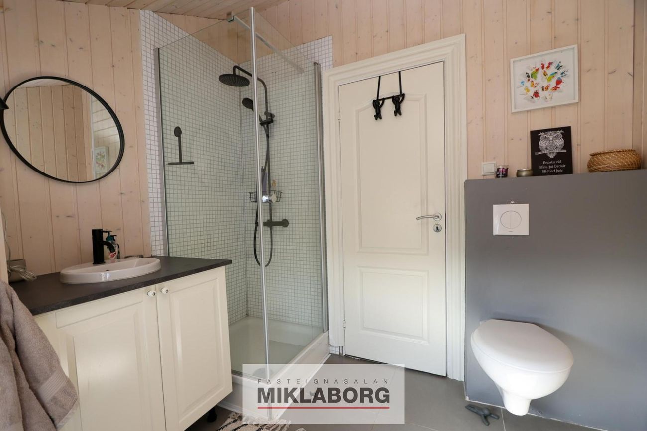 Eitt baðherbergi með sturtu, upphengt salerni og lítilli snyrtilegri innréttingu við vask. Flísar á gólfi.