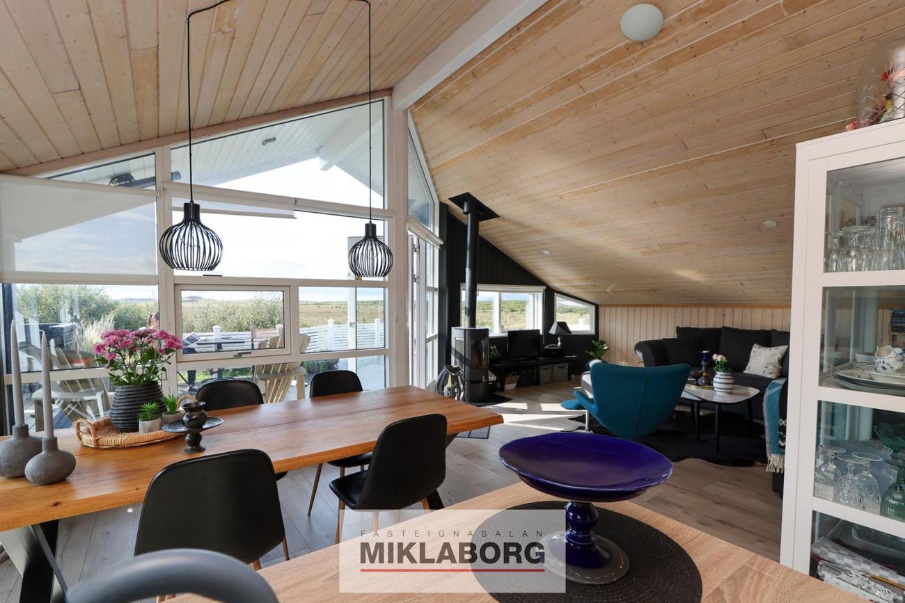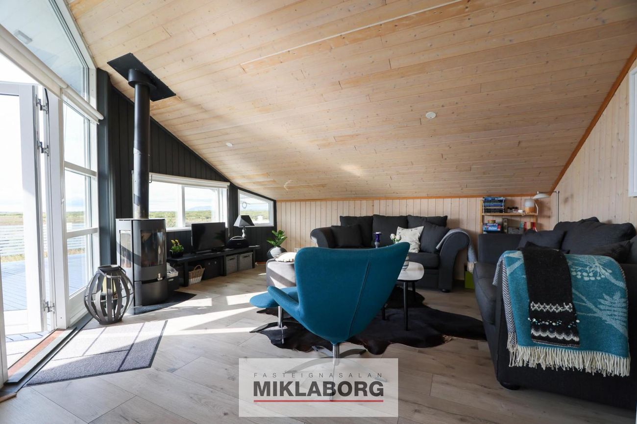 Mjög rúmgóð stofa með notalegri kamínu. Borðstofuhluti fyrir framan eldhús. Útgengt út á pall.