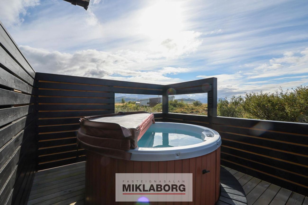 Pallur liggur kringum húsið. Heitur pottur í skjóli skjólveggja á pallinum.