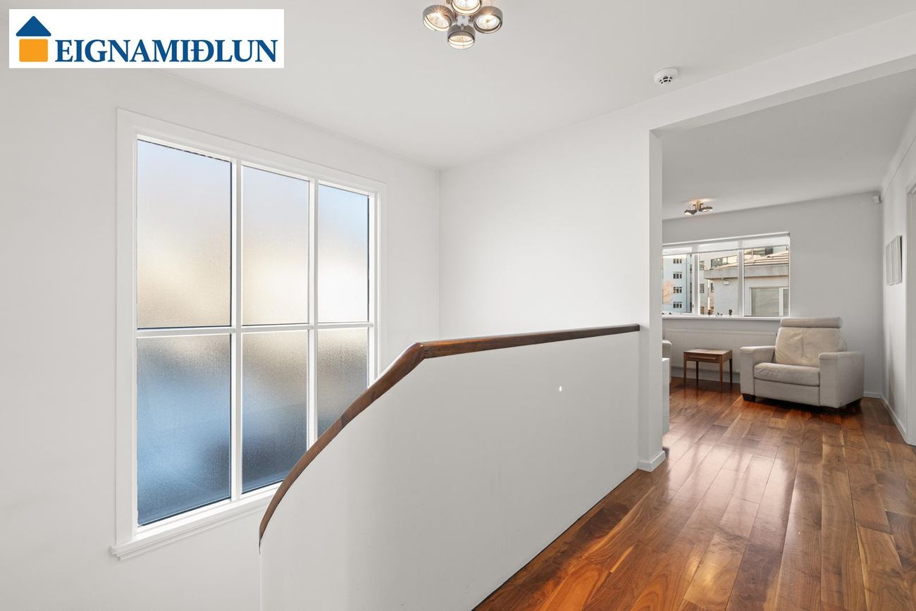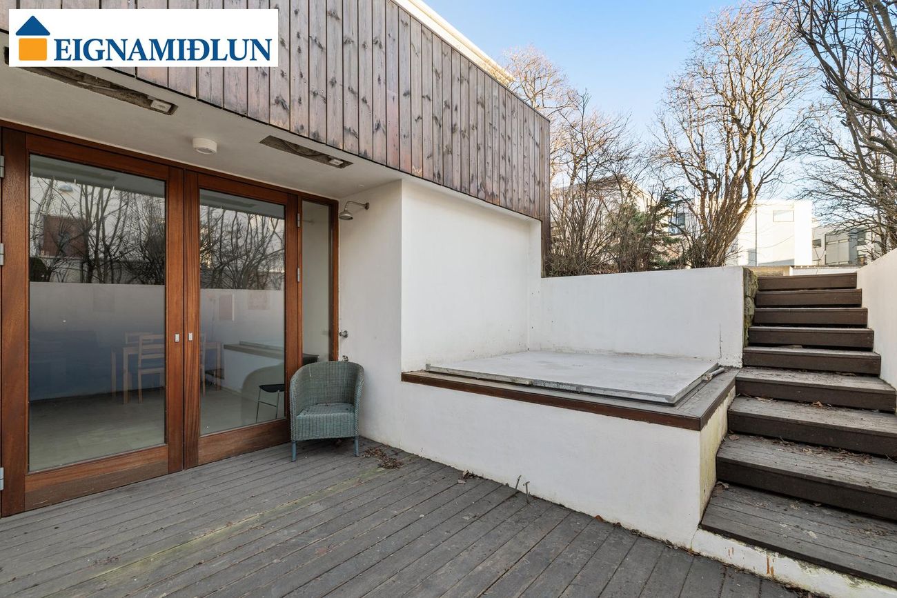 Tvær hæðir og kjallari með opnu rými, háum lofti og flísalögðum gólfum. Húsið hefur verönd með heitum potti og gróinn suðurgarð.