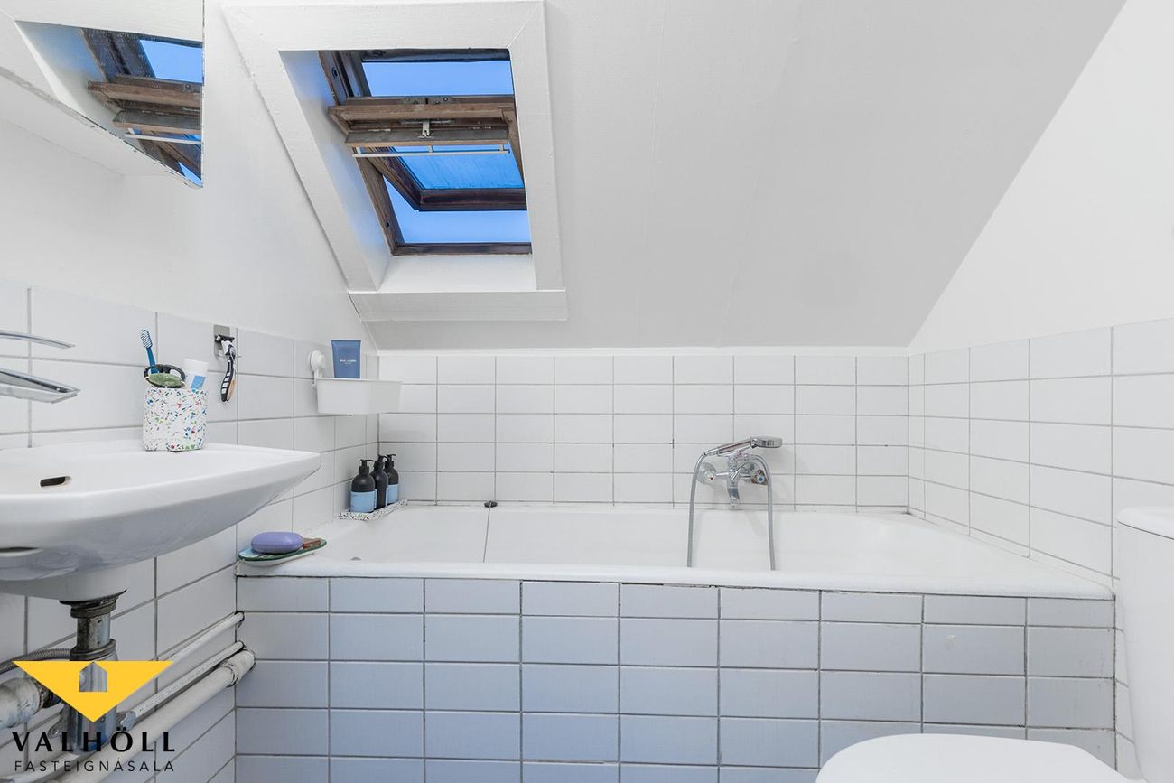 Baðherbergi: Salerni, vaskur og baðkar. Opnanlegur gluggi.