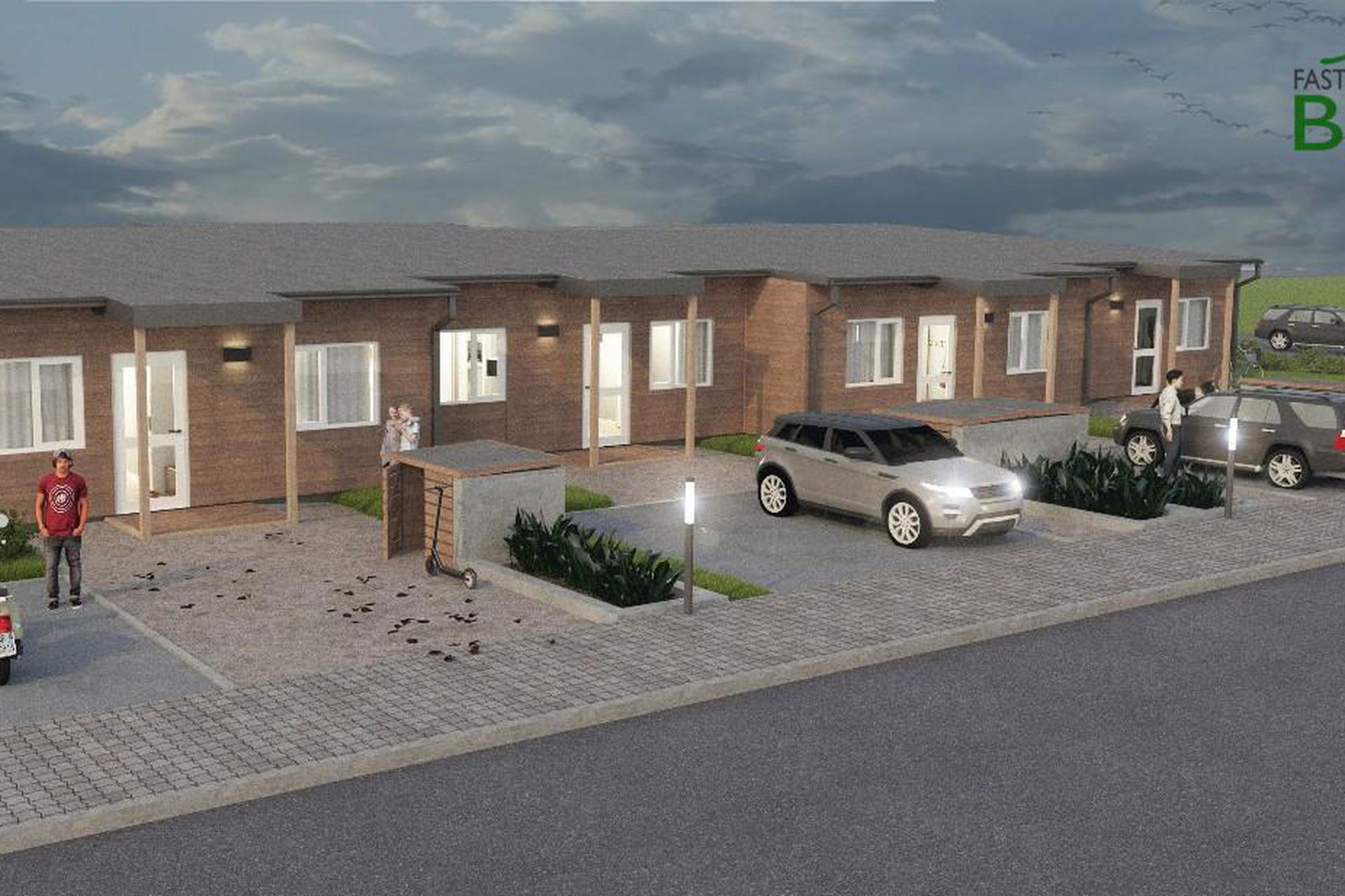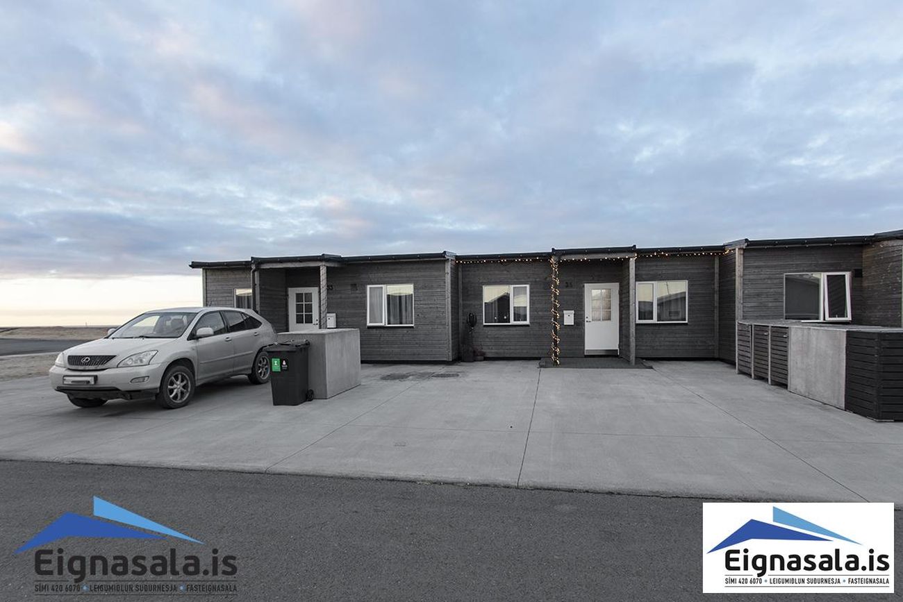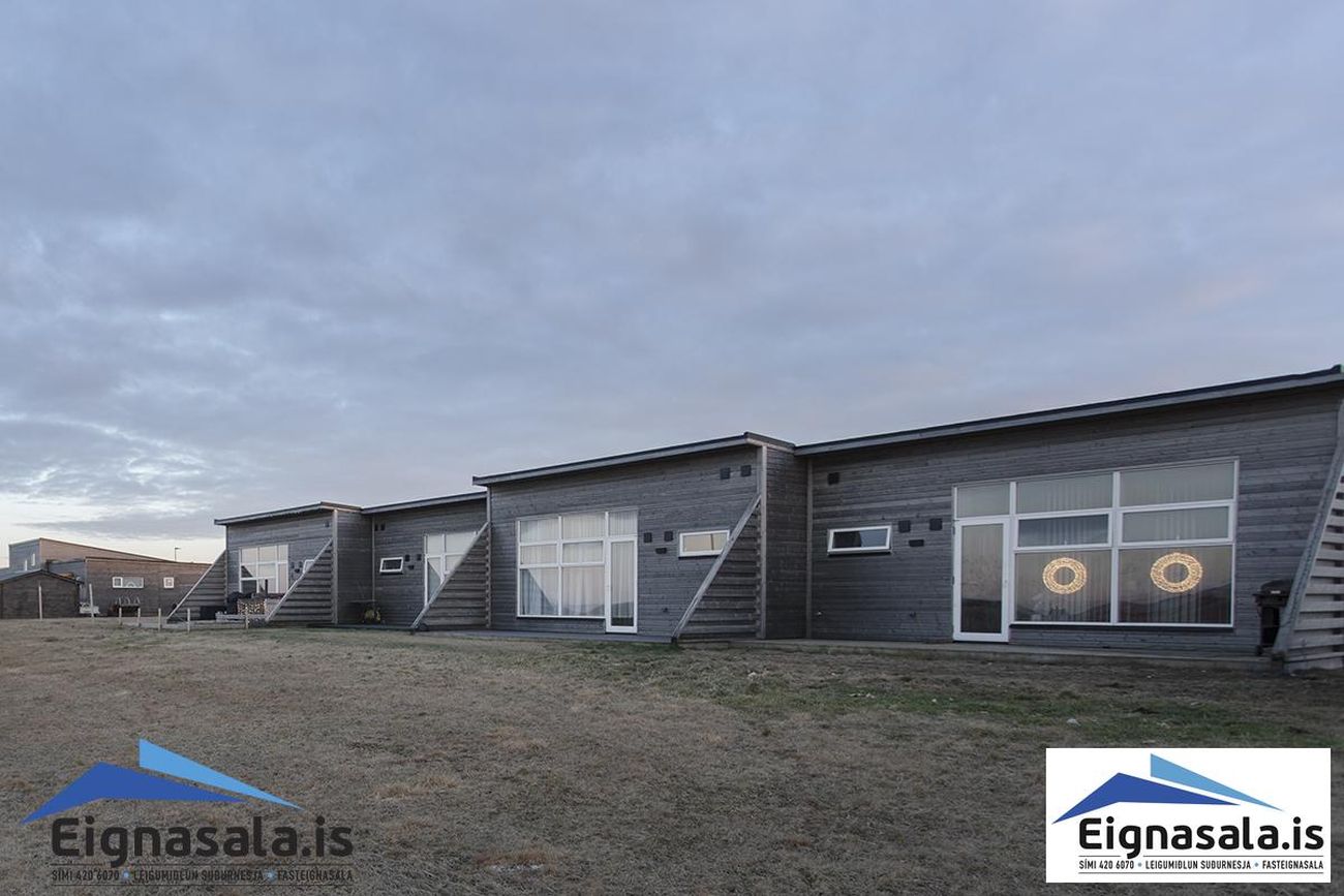 Timburklæðning á útveggjum, PVC gluggar/hurðir, harðparket á gólfum, steinflísar í baðherbergi.