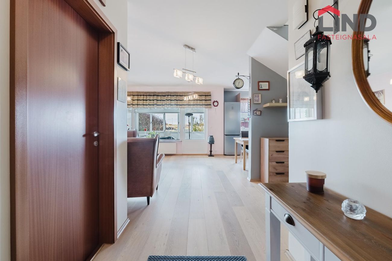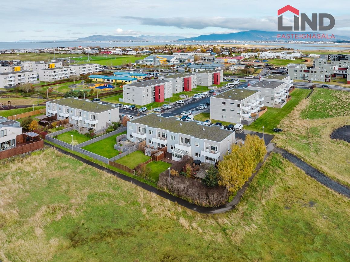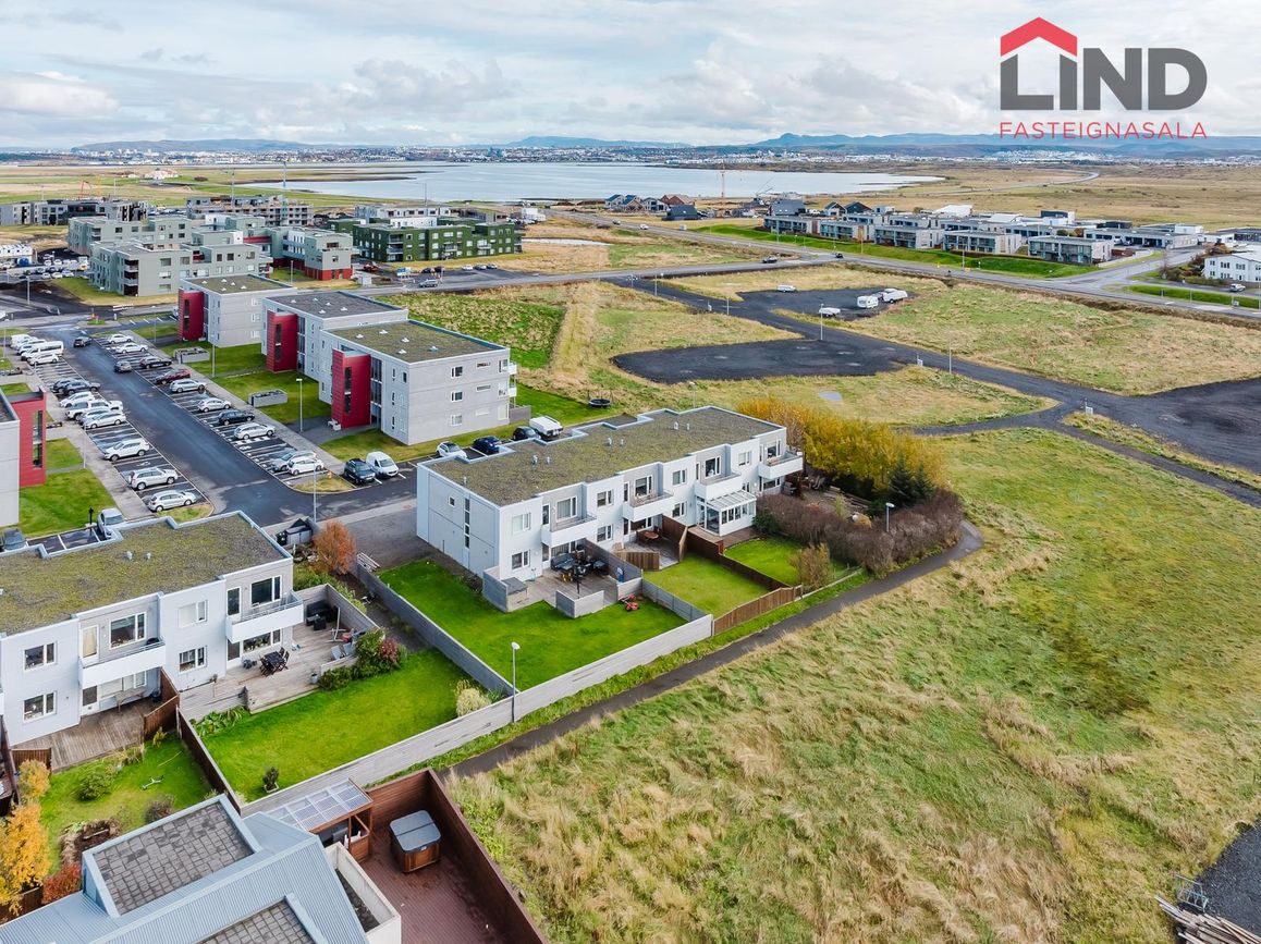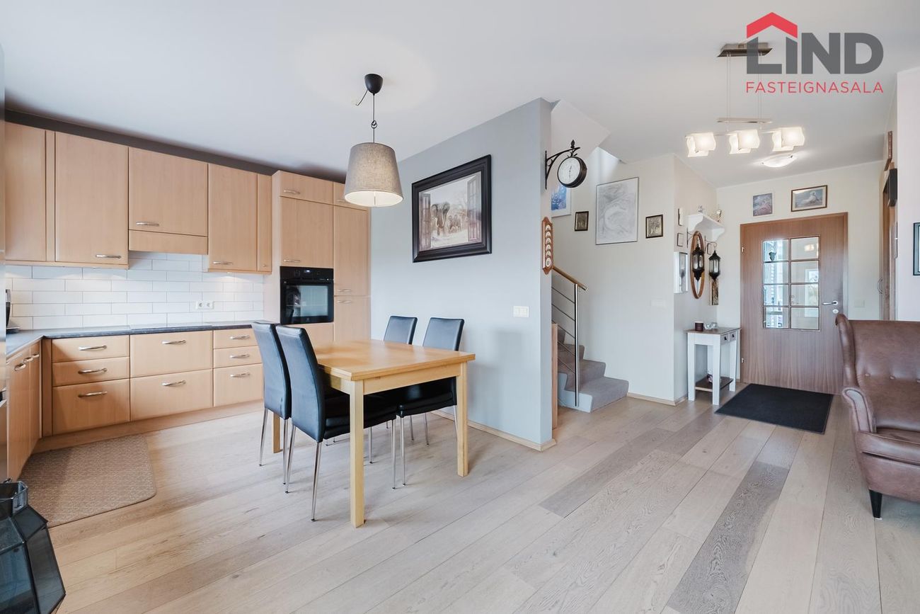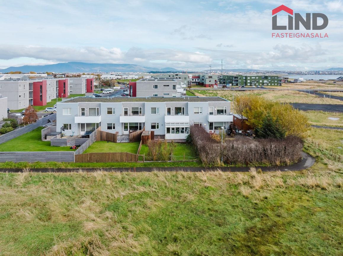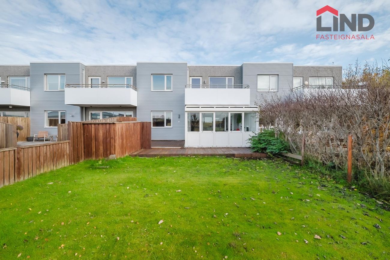 Atli á Lind fasteignasölu kynnir í einkasölu þetta fallega og bjarta 180,9 fm raðhús á tveimur hæðum með bílskúr. Í húsinu er virkilega fallegt útsýni af tvennum svölum sem snúa annars vegar í suður og hinsvegar í norður. Stór afgirtur garður með timburverönd sem snýr í suður ásamt notalegum sólskála með hita í gólfi. Bílskúr með hleðslustöð fyrir rafbíl.