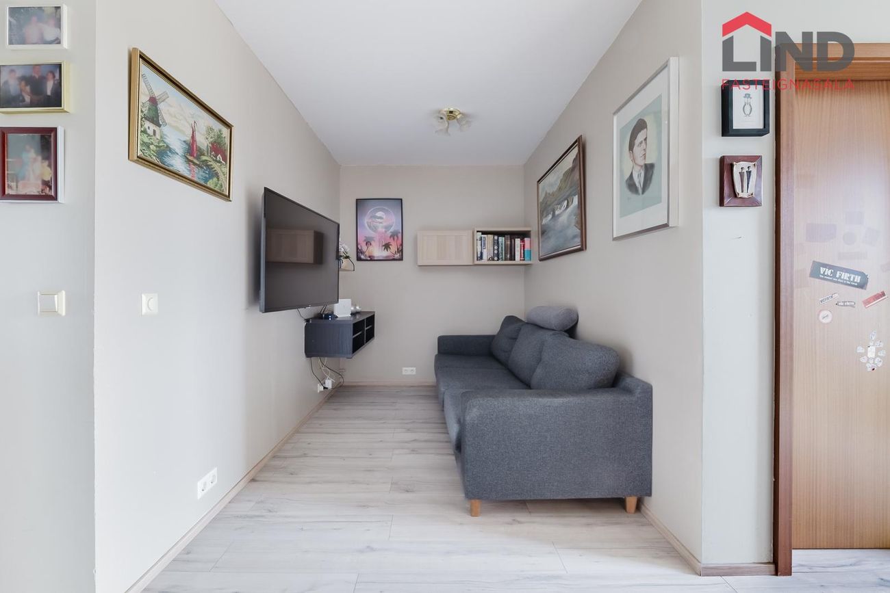 Sjónvarpshol á gangi með parketi á gólfi.