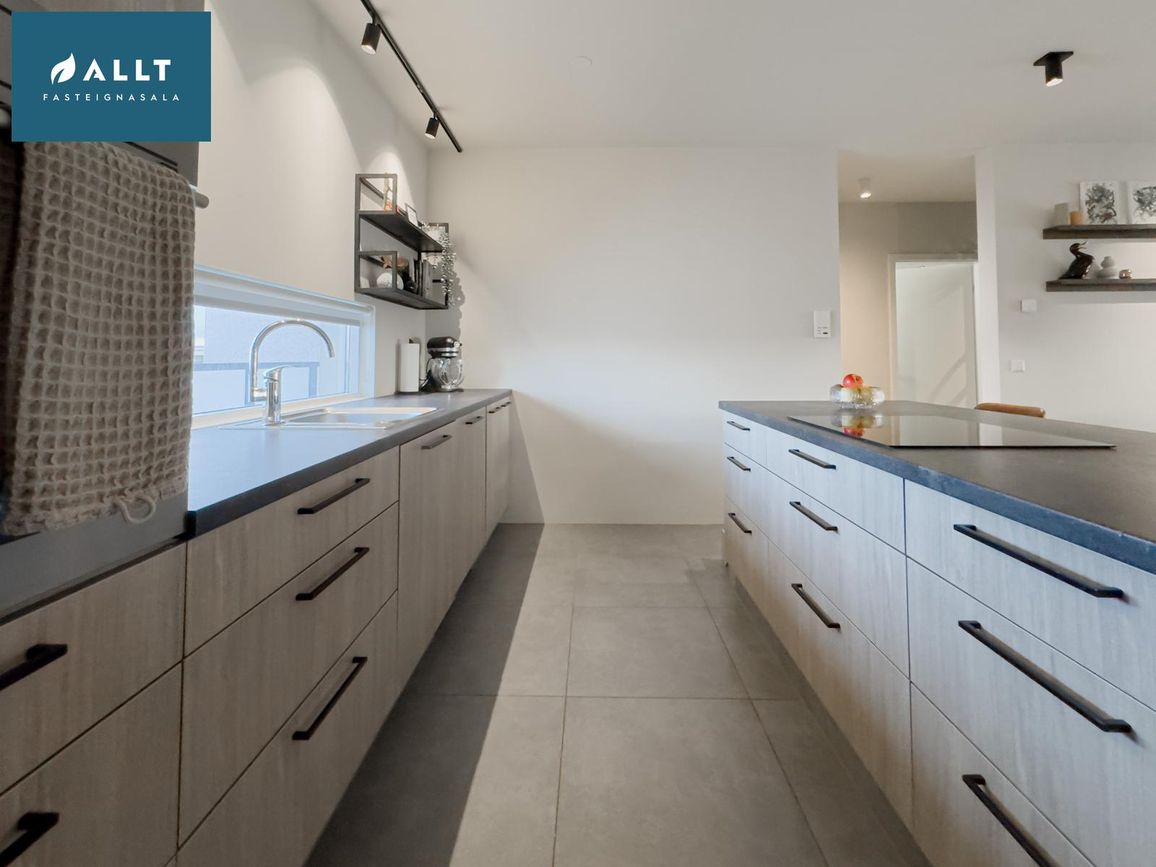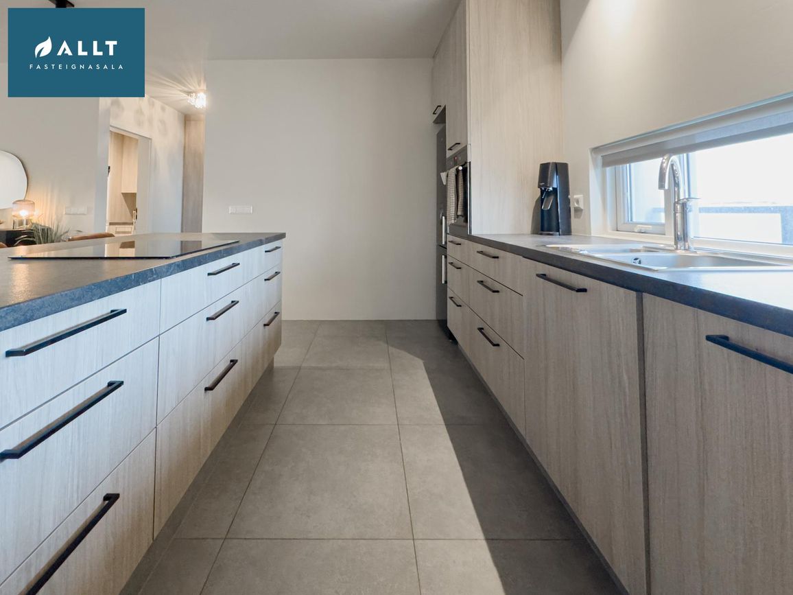 Eldhús: Stílhrein innrétting, innbyggð uppþvottavél og eyja með helluborði. Flísar á gólfi