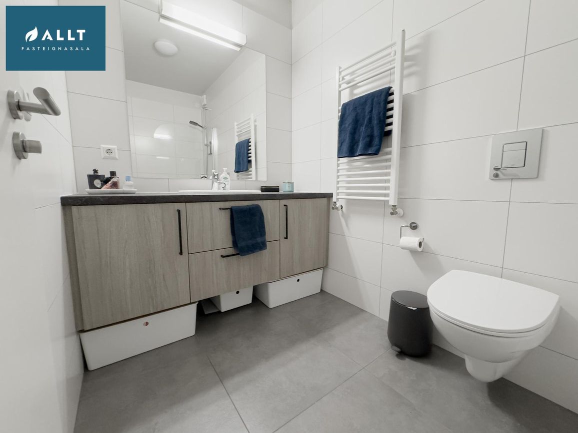 Baðherbergi: Flísalagt í hólf og gólf, með baðkari og sturtuaðstöðu, handklæðaofn og snyrtilegri innréttingu