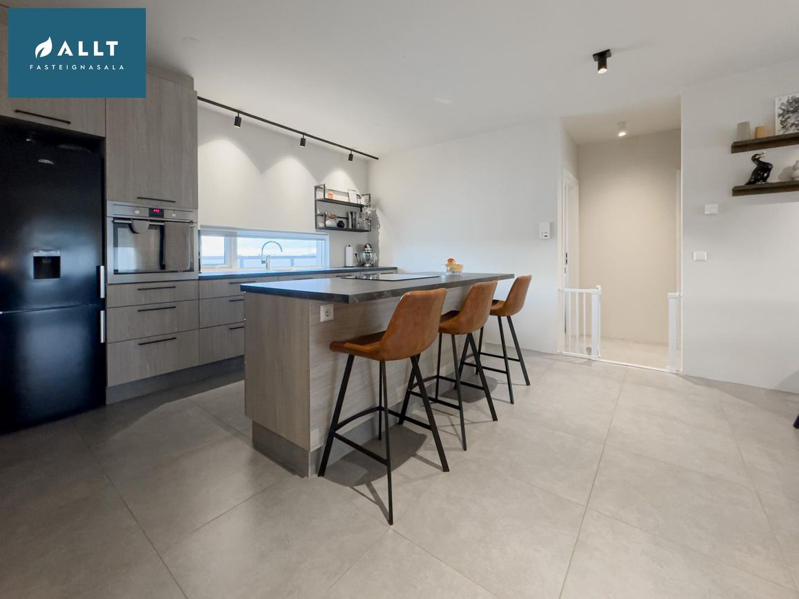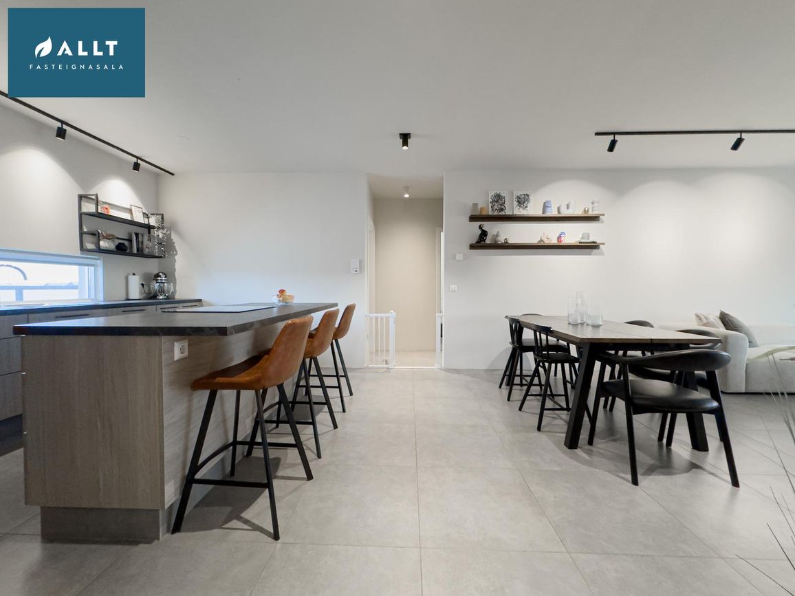 Eldhús: Stílhrein innrétting, innbyggð uppþvottavél og eyja með helluborði. Flísar á gólfi
