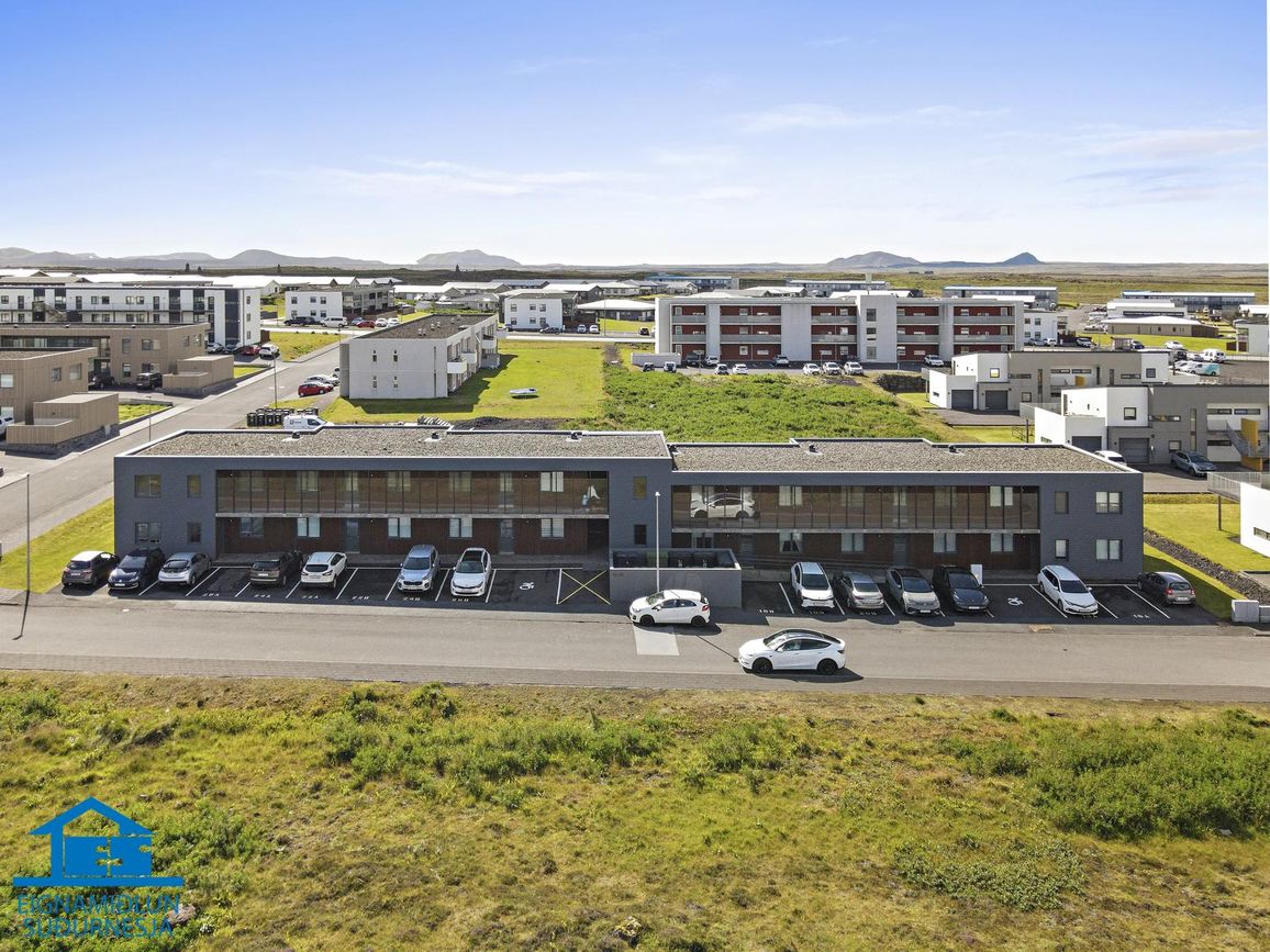 Húsið stendur á góðri lóð, með fjölda bílastæða, sem búið er að koma upp sameiginlegri hleðslustöð fyrir rafmagnsbíla.