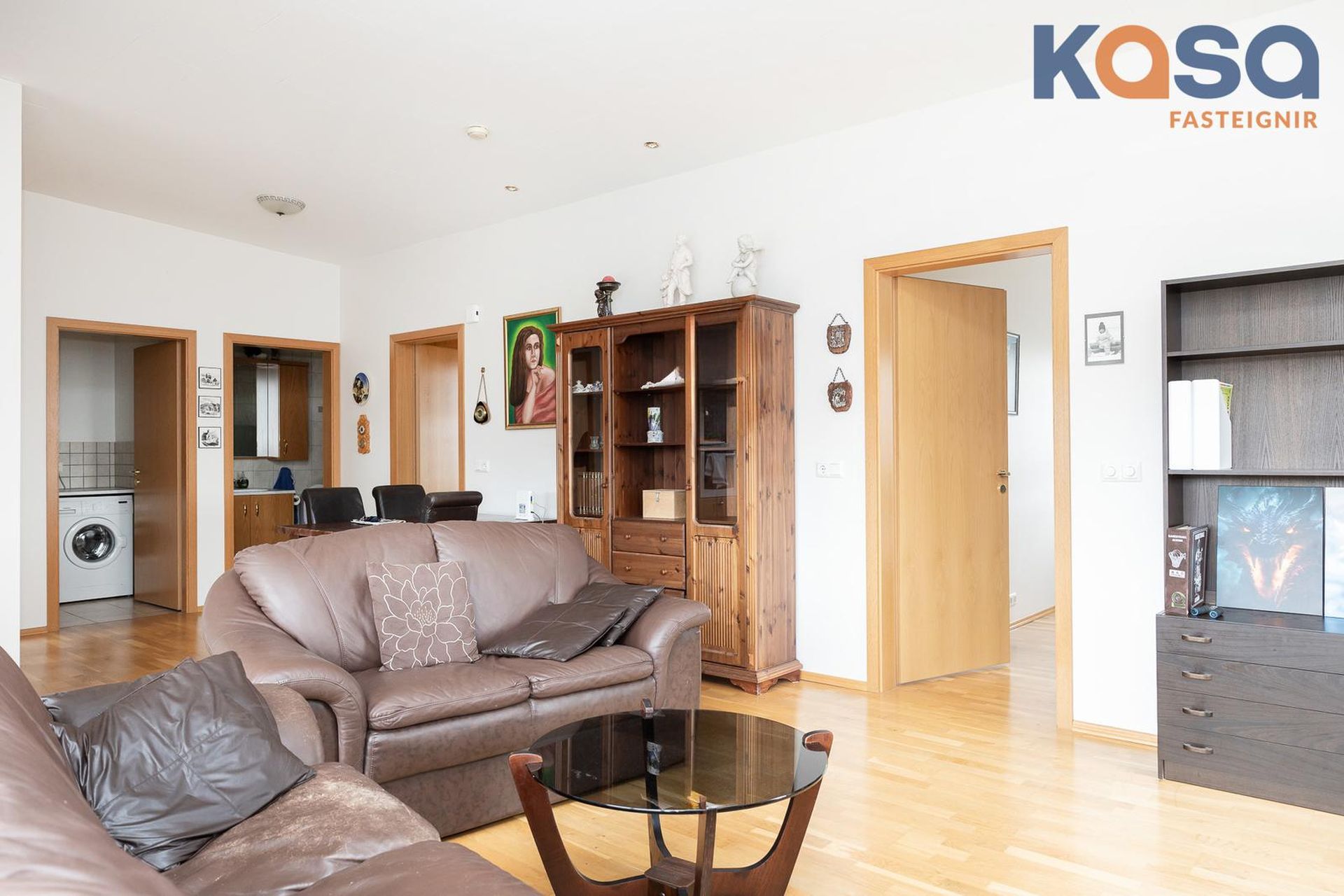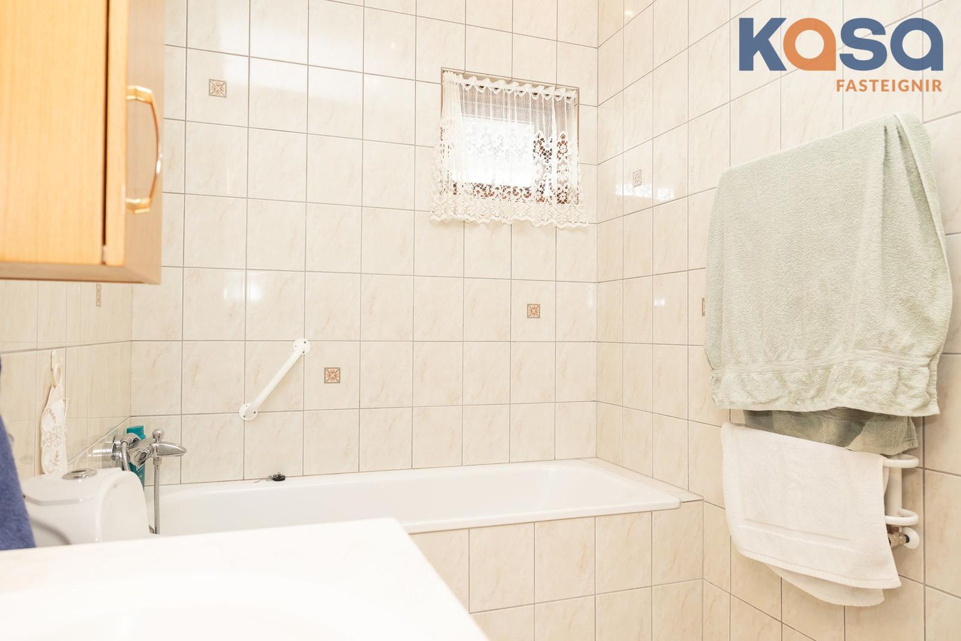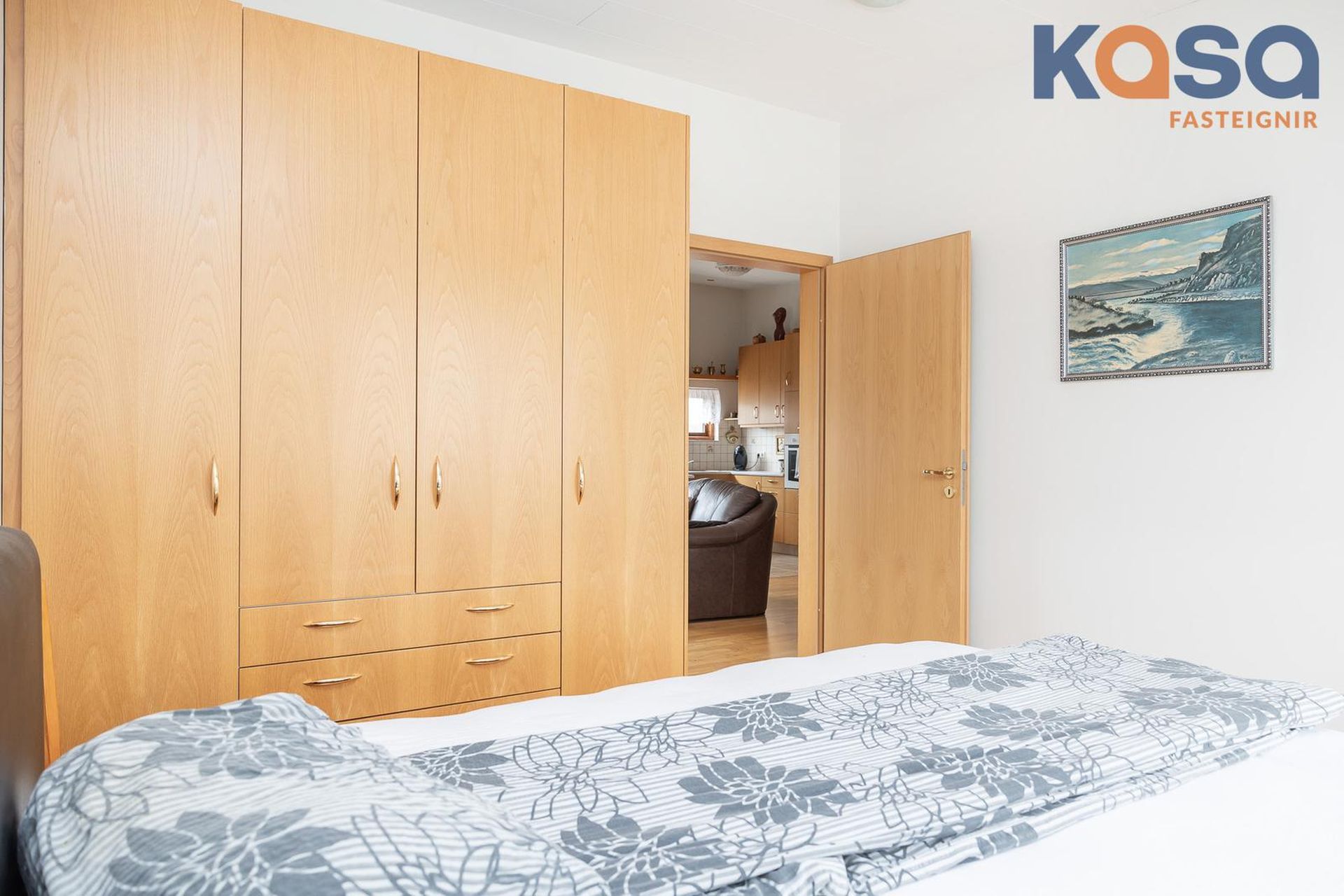 Eignin skiptist í forstofu, stofu, eldhús, baðherbergi, þvottahús, 2 svefnherbergi og rúmgóða geymslu. Geymslan er með glugga og gæti því nýst sem þriðja svefnherbergið/skrifstofa.Forstofa: Flísar á gólfi, rúmgóður fataskápur með skúffum.