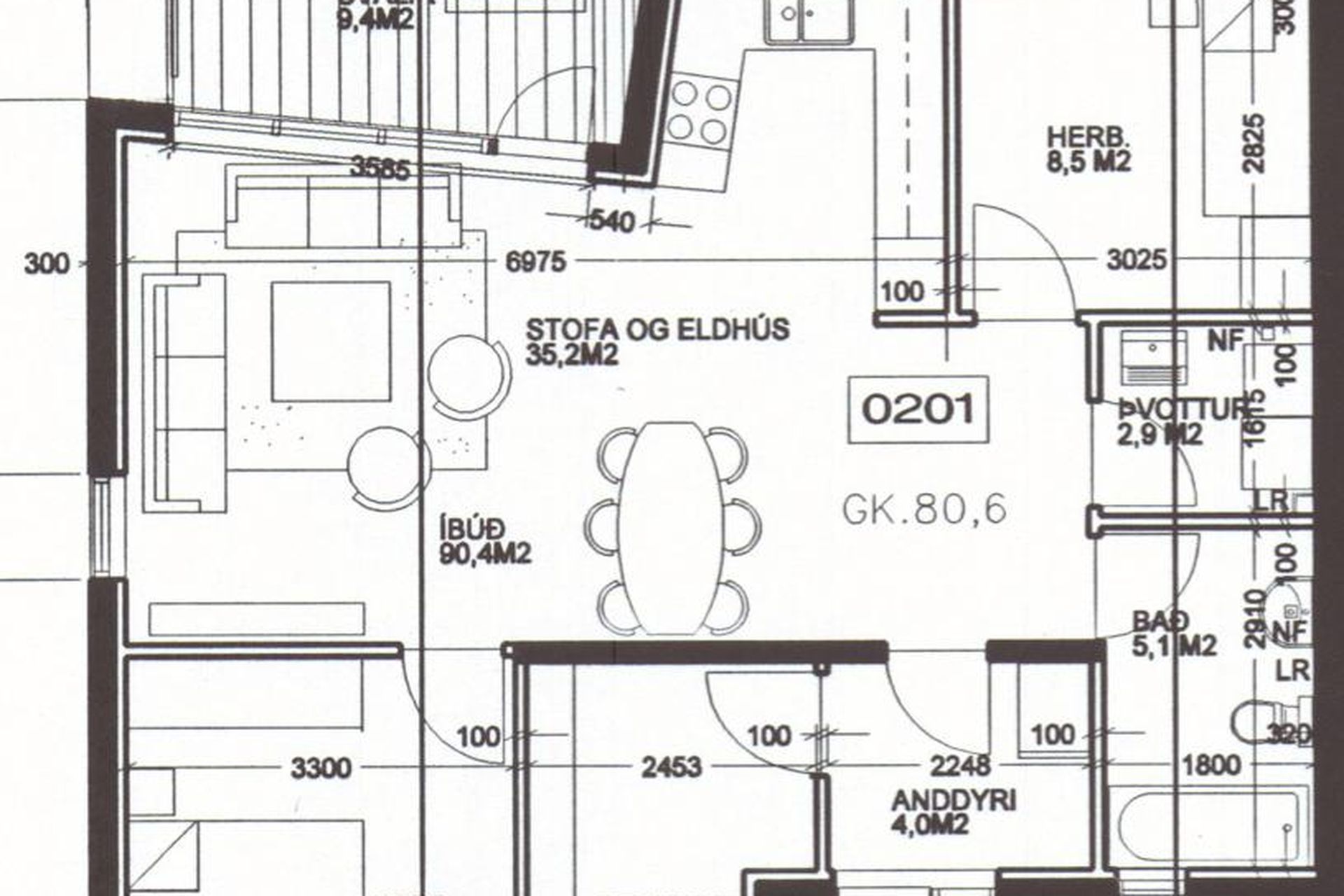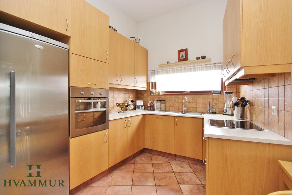 Eldhús: Eikar innrétting með plássi fyrir ísskáp og uppþvottavél. Bakaraofn í vinnuhæð. Flísar á gólfi og á milli skápa.