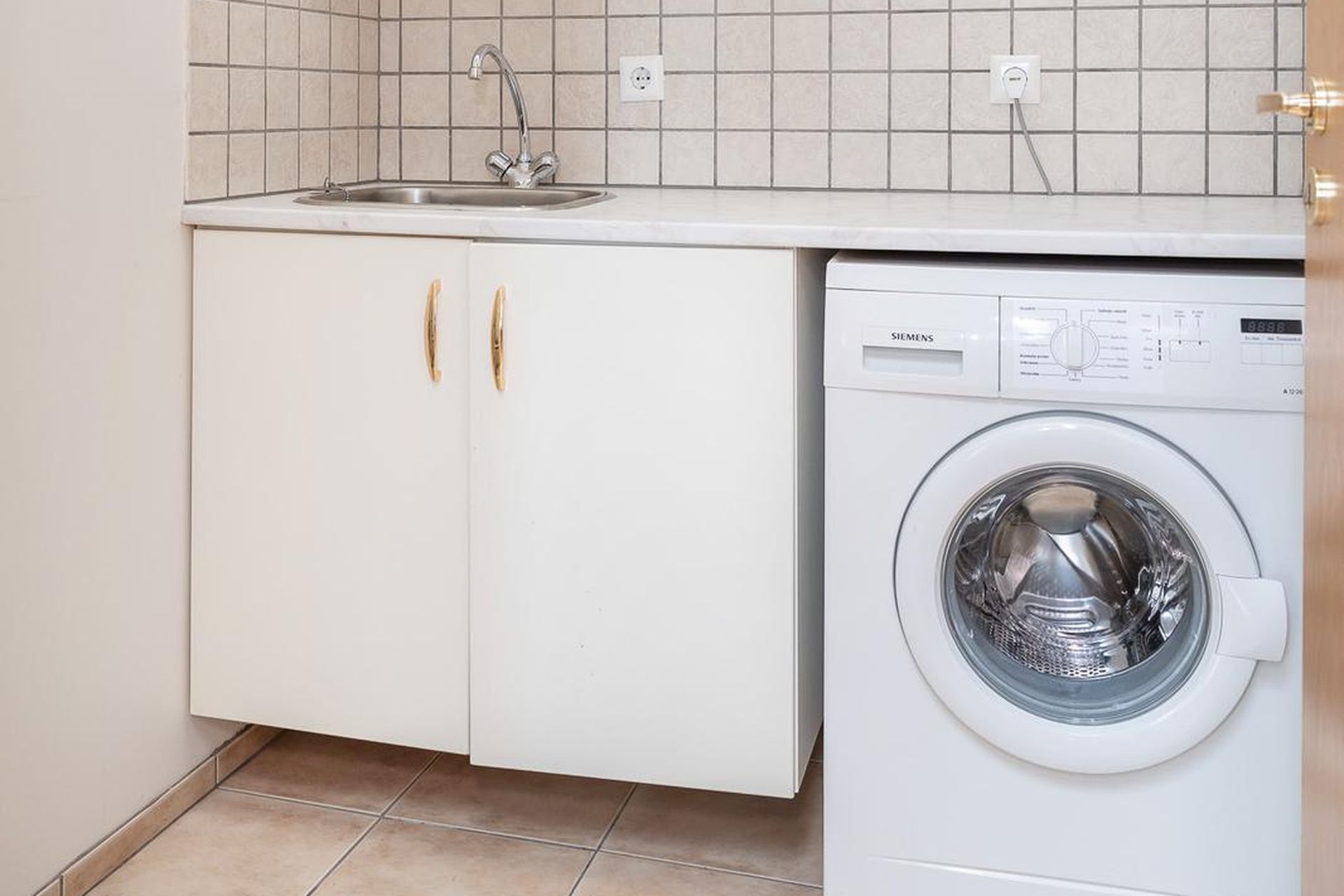 Þvottahús: Hvít innrétting með plássi fyrir þvottavél og þurrkara. Bekkjarplata með vaski. Flísar á gólfi og hluta af veggjum.