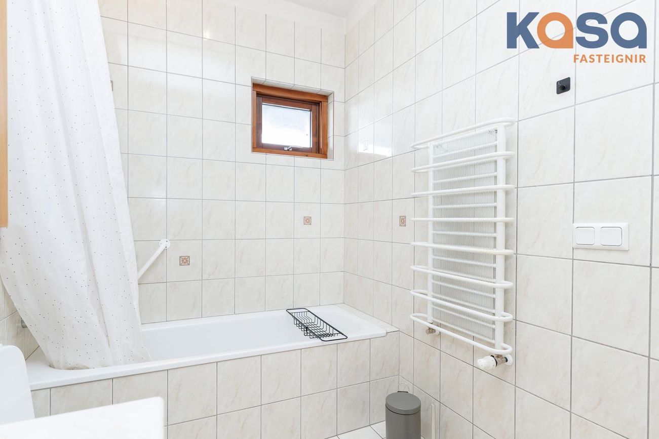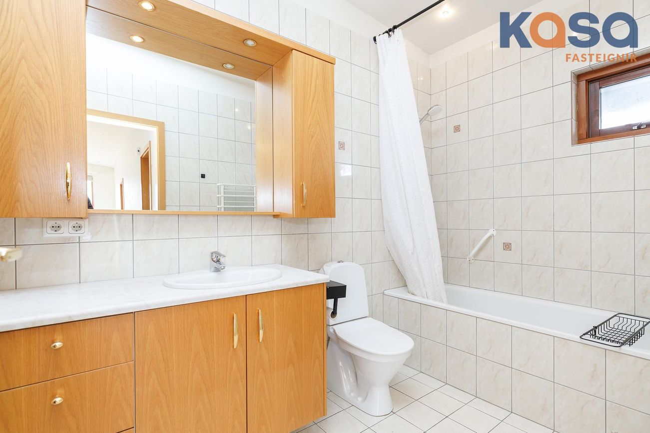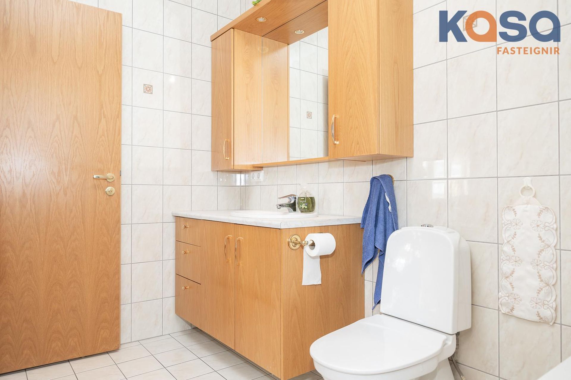 Baðherbergi: Eikar innrétting með skúffum og skápum. Baðkar með sturtutækjum, salerni og handklæða ofn. Flísalagt í hólf og gólf.