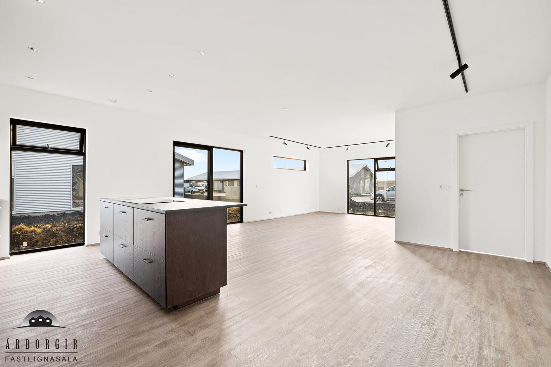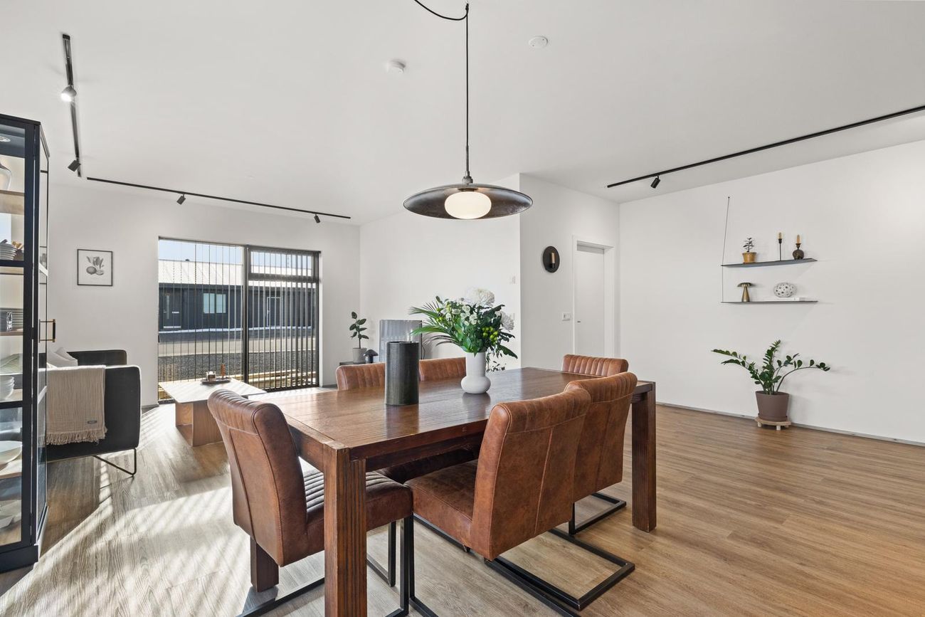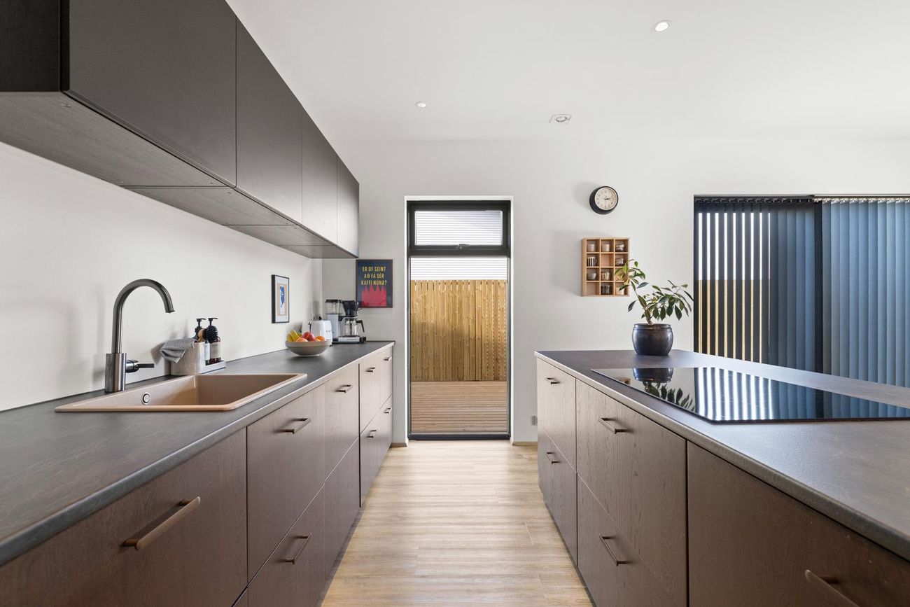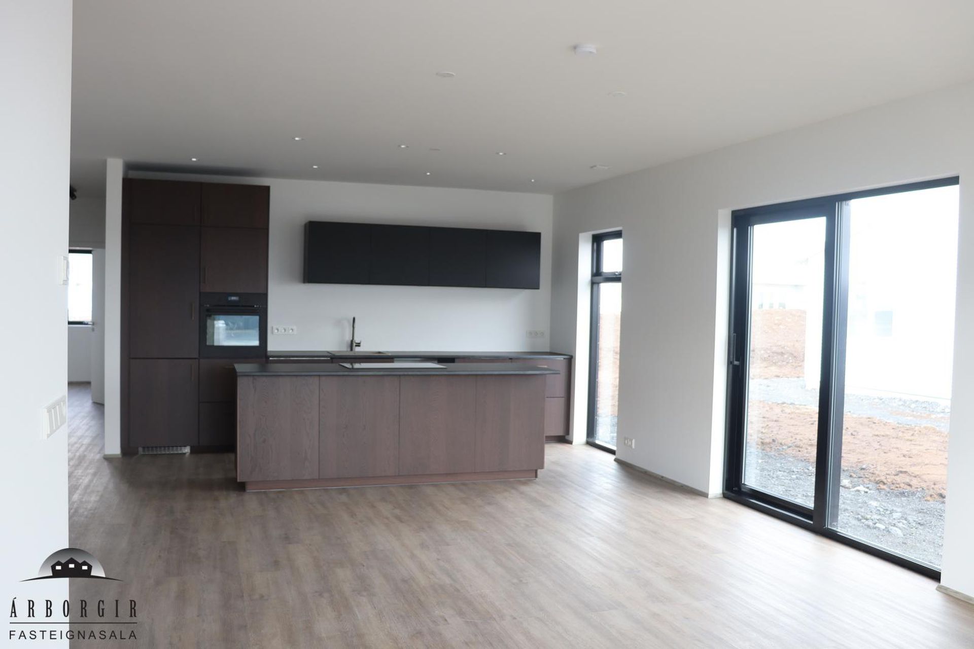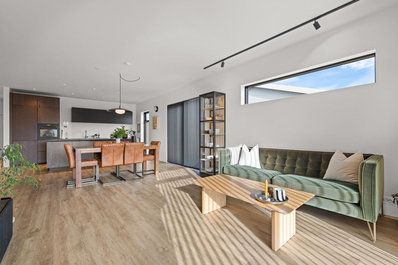 Alrými: Opið, bjart og rúmgott rými með stofu, borðstofu og eldhúsi. Vnilparket á gólfum og eldhúseyja með fallegum innréttingum. Hátt til lofts er í alrýminu. Rennihurð út á lóð er í Borðkrók. Stofan er björt og rúmgóð.
