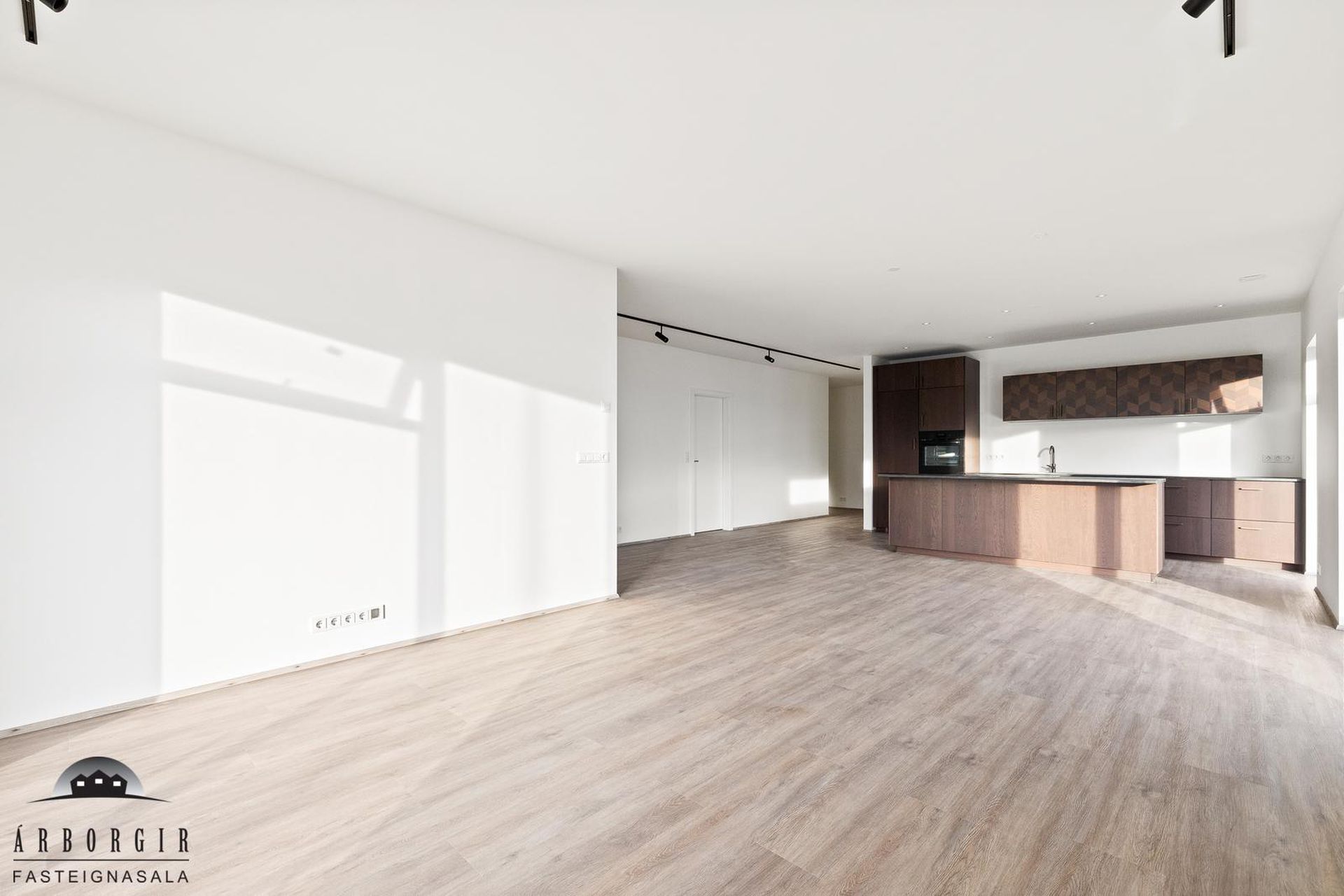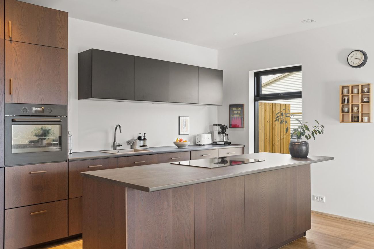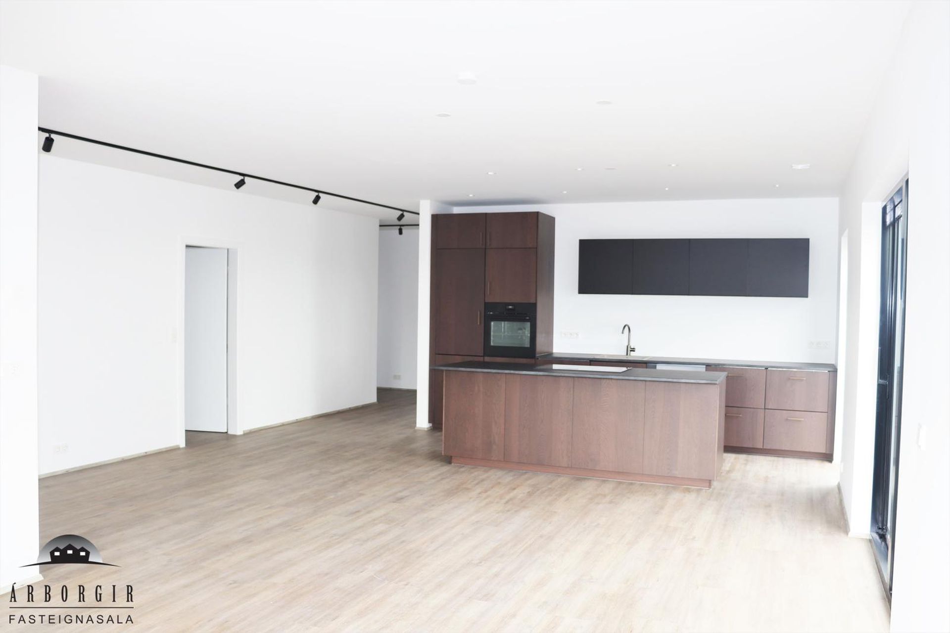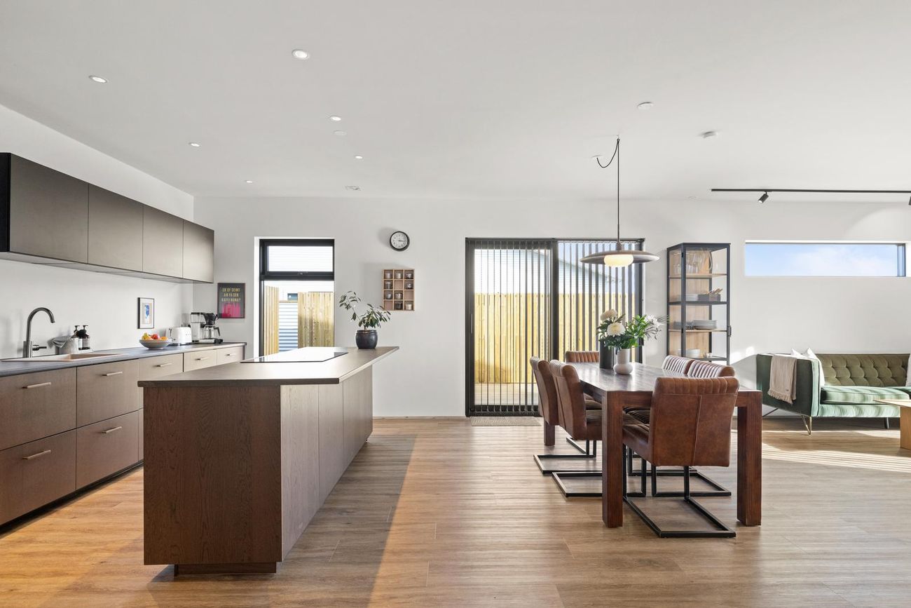 Alrými: Opið, bjart og rúmgott rými með stofu, borðstofu og eldhúsi. Vnilparket á gólfum og eldhúseyja með fallegum innréttingum. Hátt til lofts er í alrýminu. Rennihurð út á lóð er í Borðkrók. Stofan er björt og rúmgóð.