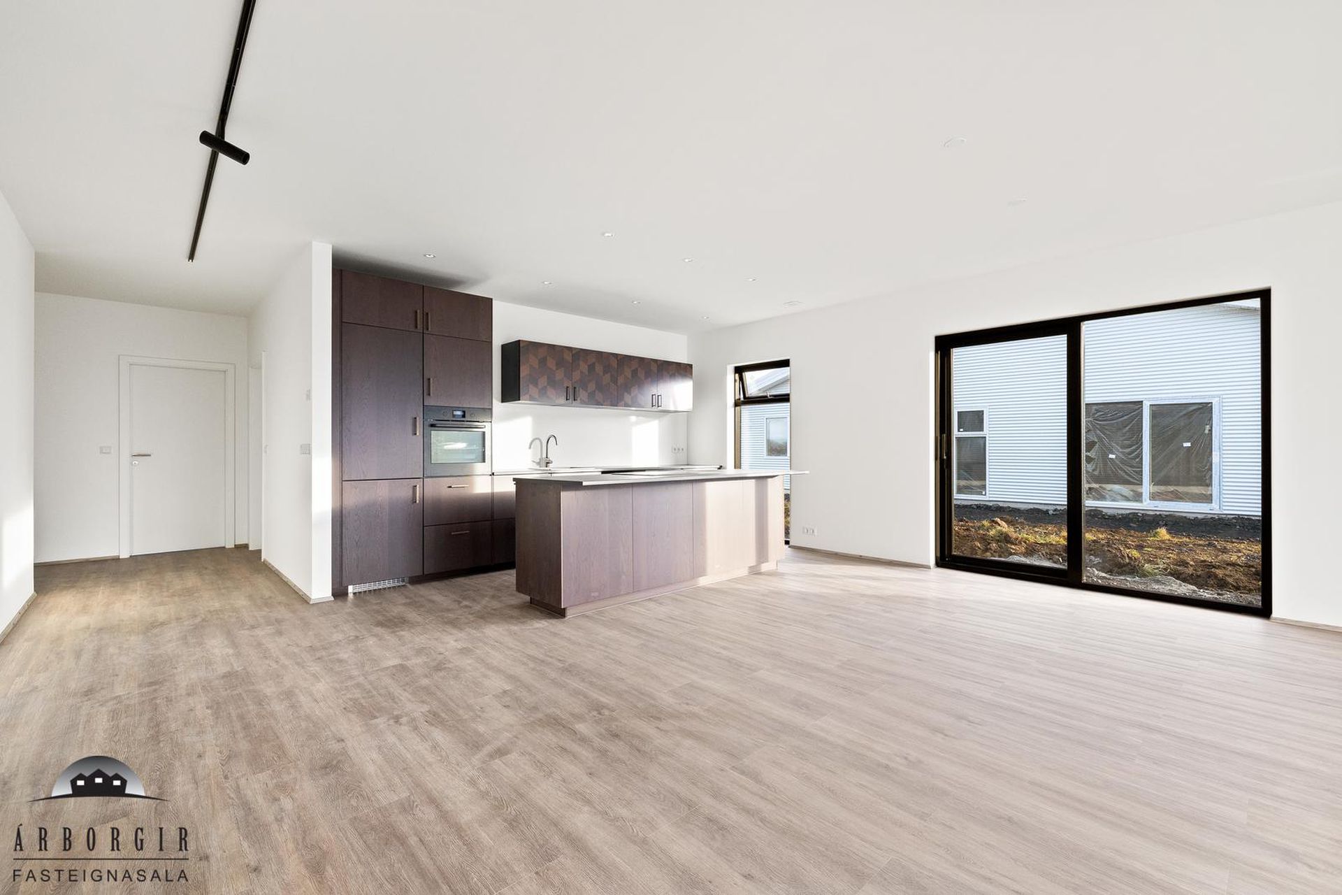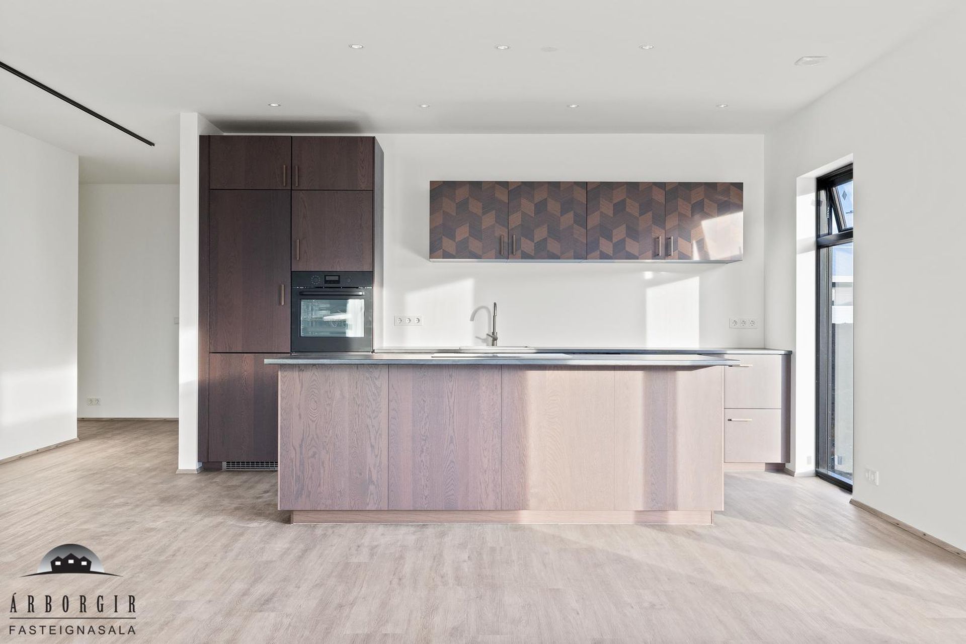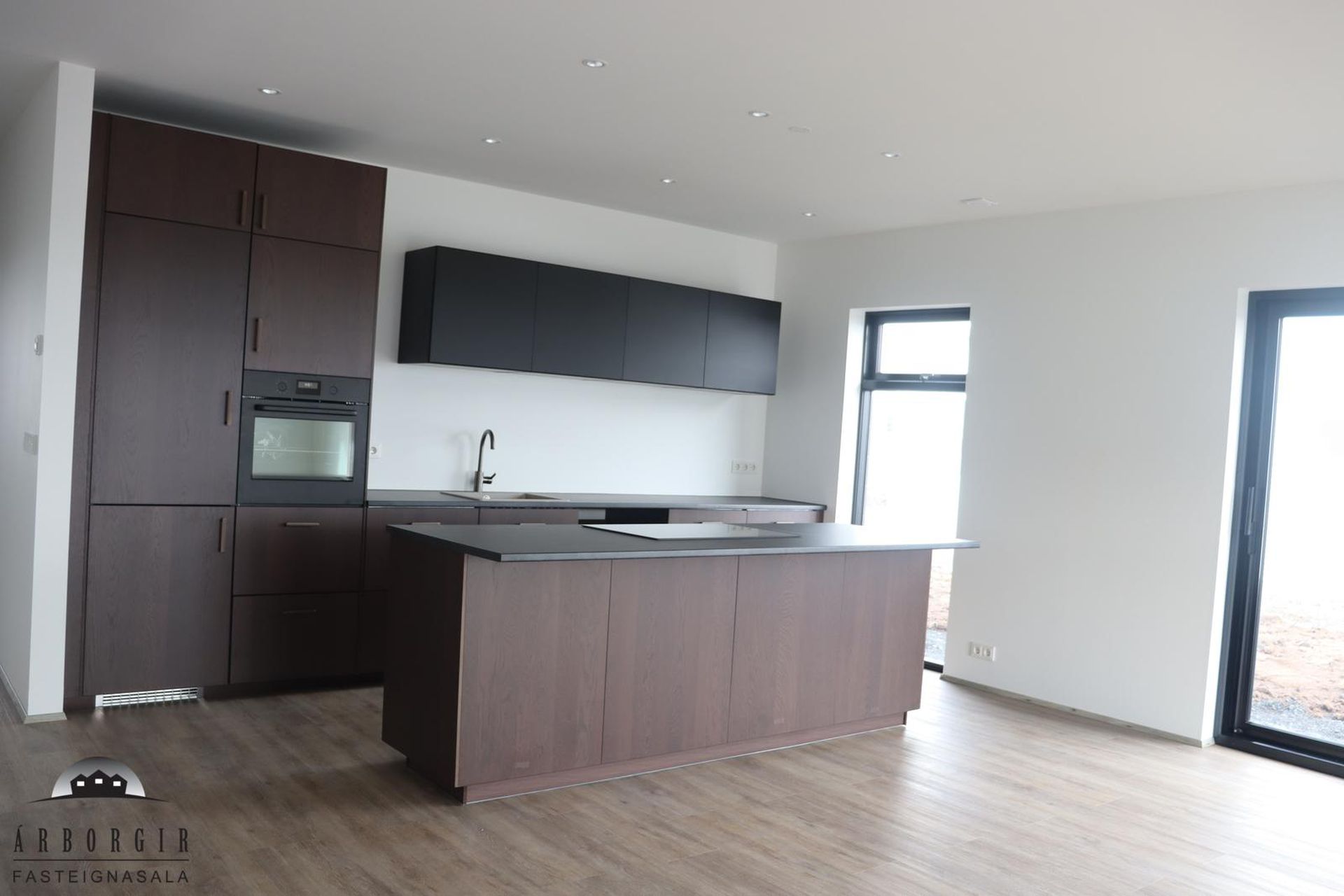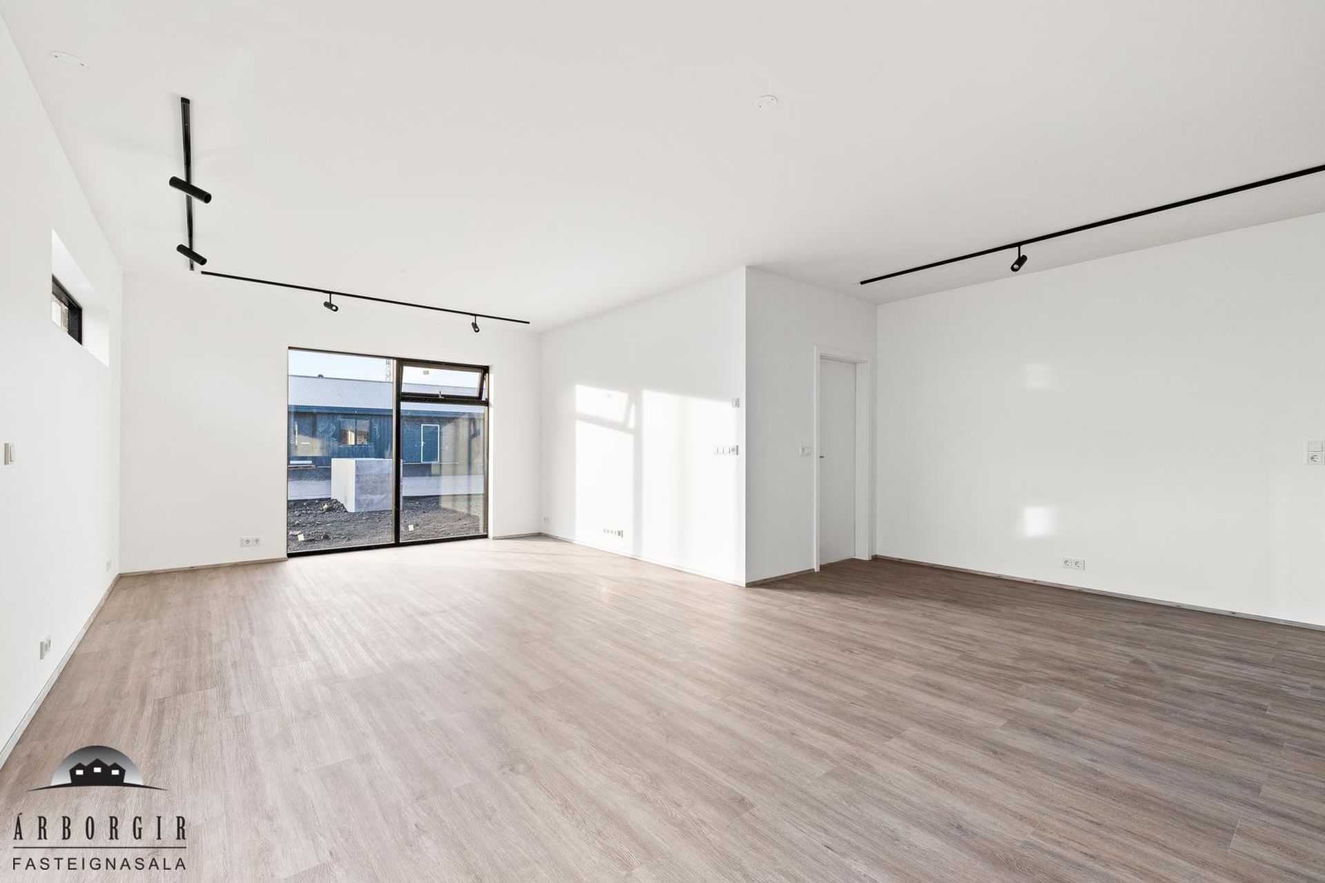Alrými: Opið, bjart og rúmgott rými með stofu, borðstofu og eldhúsi. Vnilparket á gólfum og eldhúseyja með fallegum innréttingum. Hátt til lofts er í alrýminu. Rennihurð út á lóð er í Borðkrók. Stofan er björt og rúmgóð.