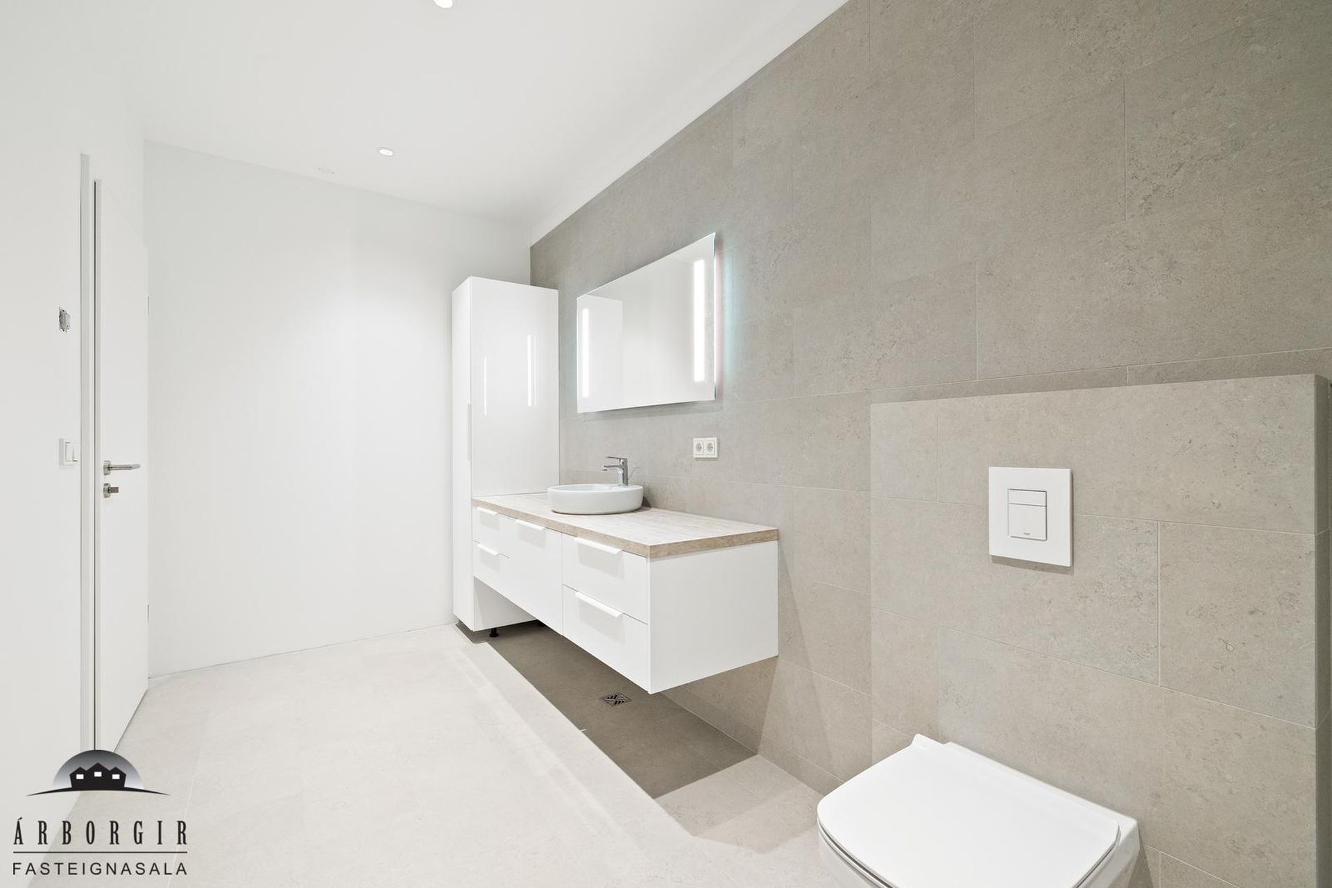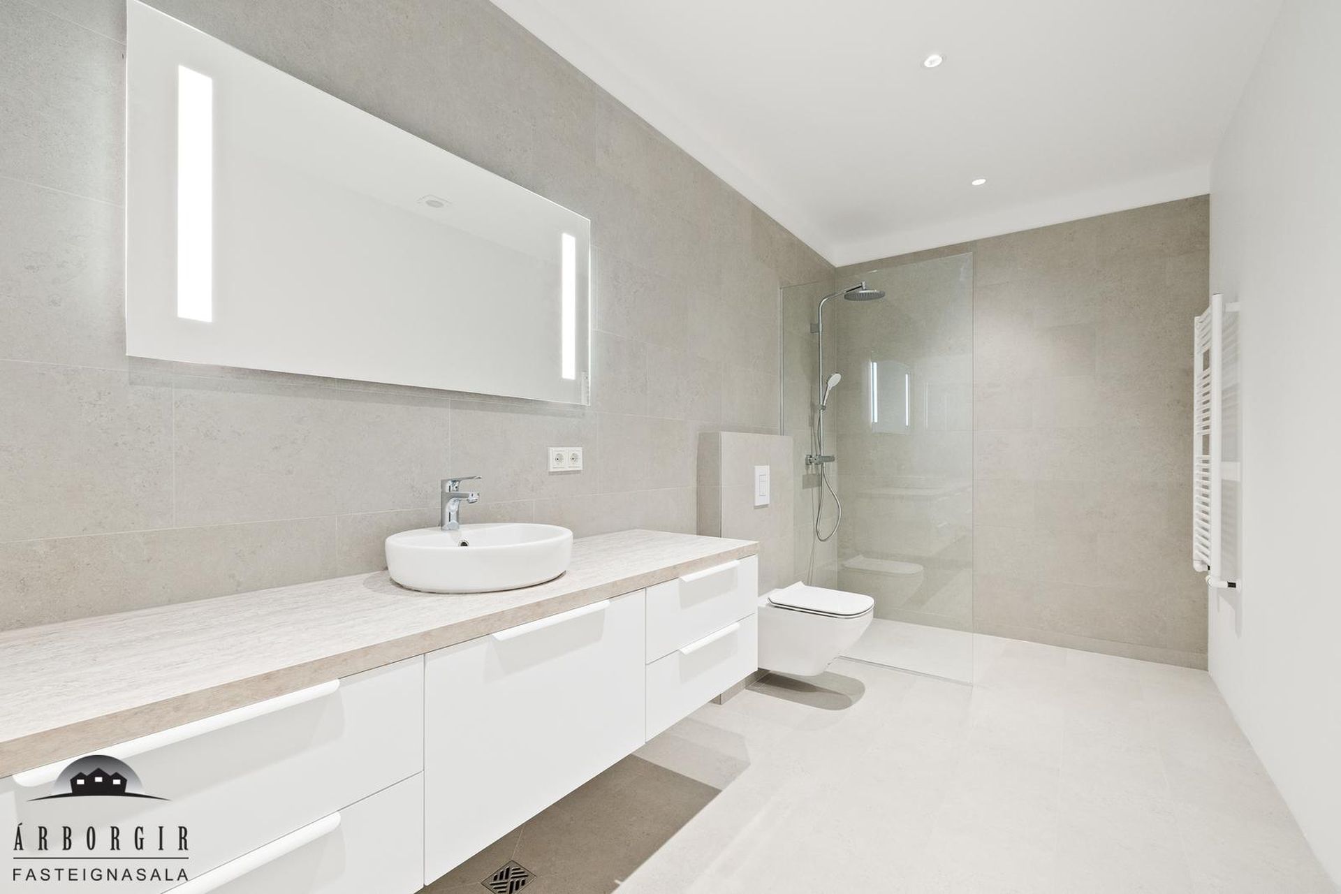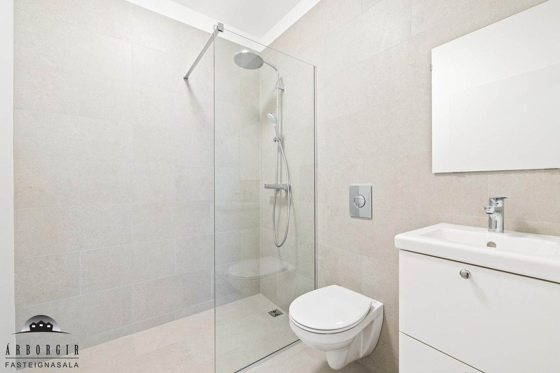 Aðalbaðherbergi: Er með walk in sturtu og góðum innréttingum, flísalagt á veggjum og gólfi.