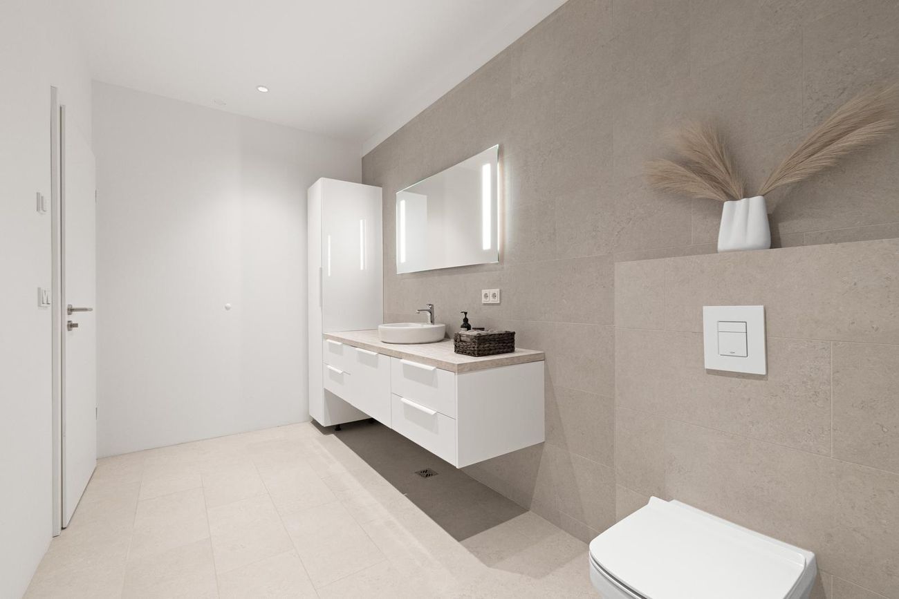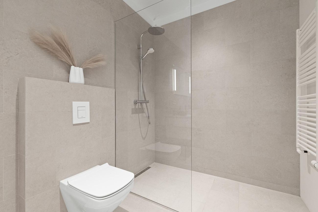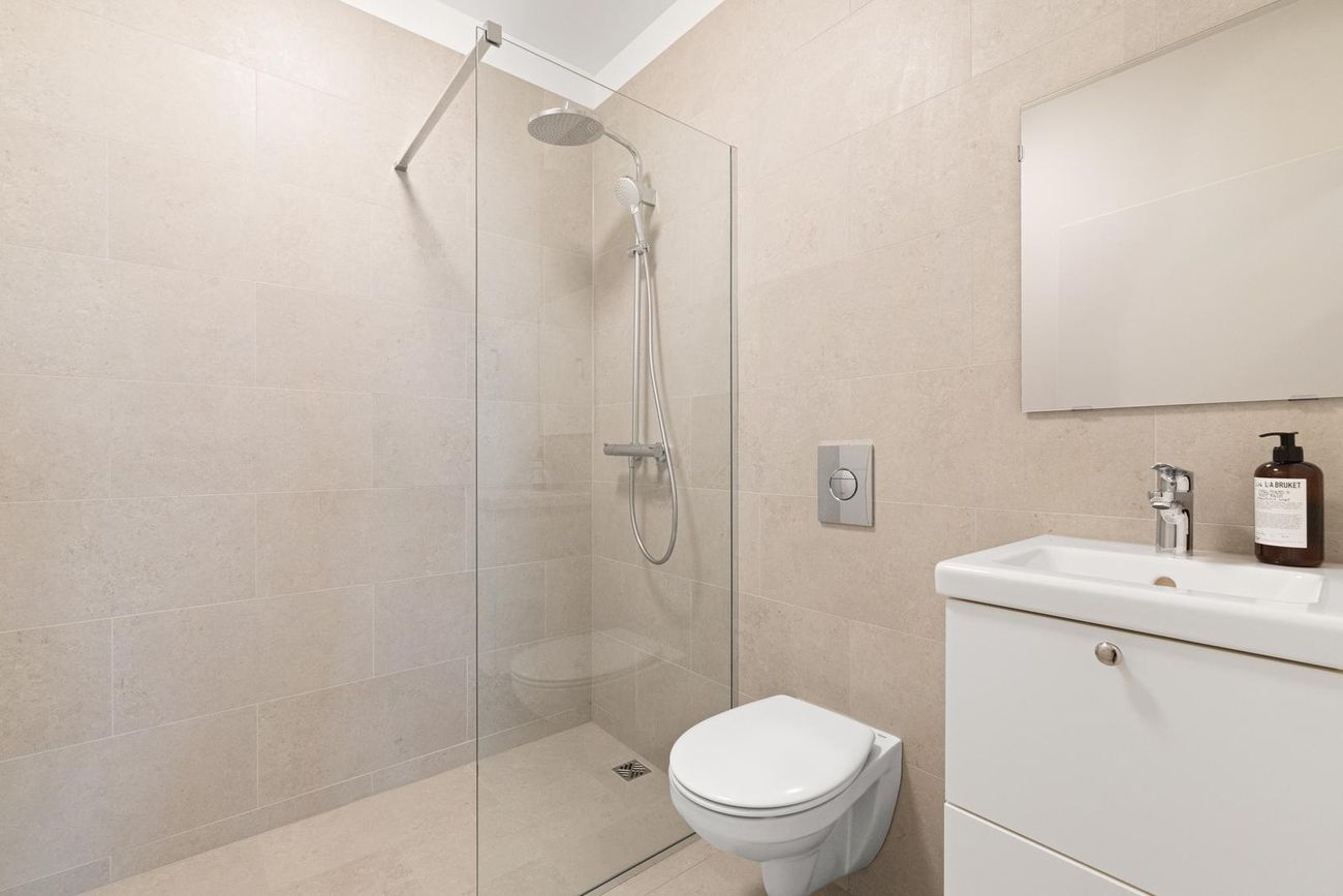 Aðalbaðherbergi: Er með walk in sturtu og góðum innréttingum, flísalagt á veggjum og gólfi.
