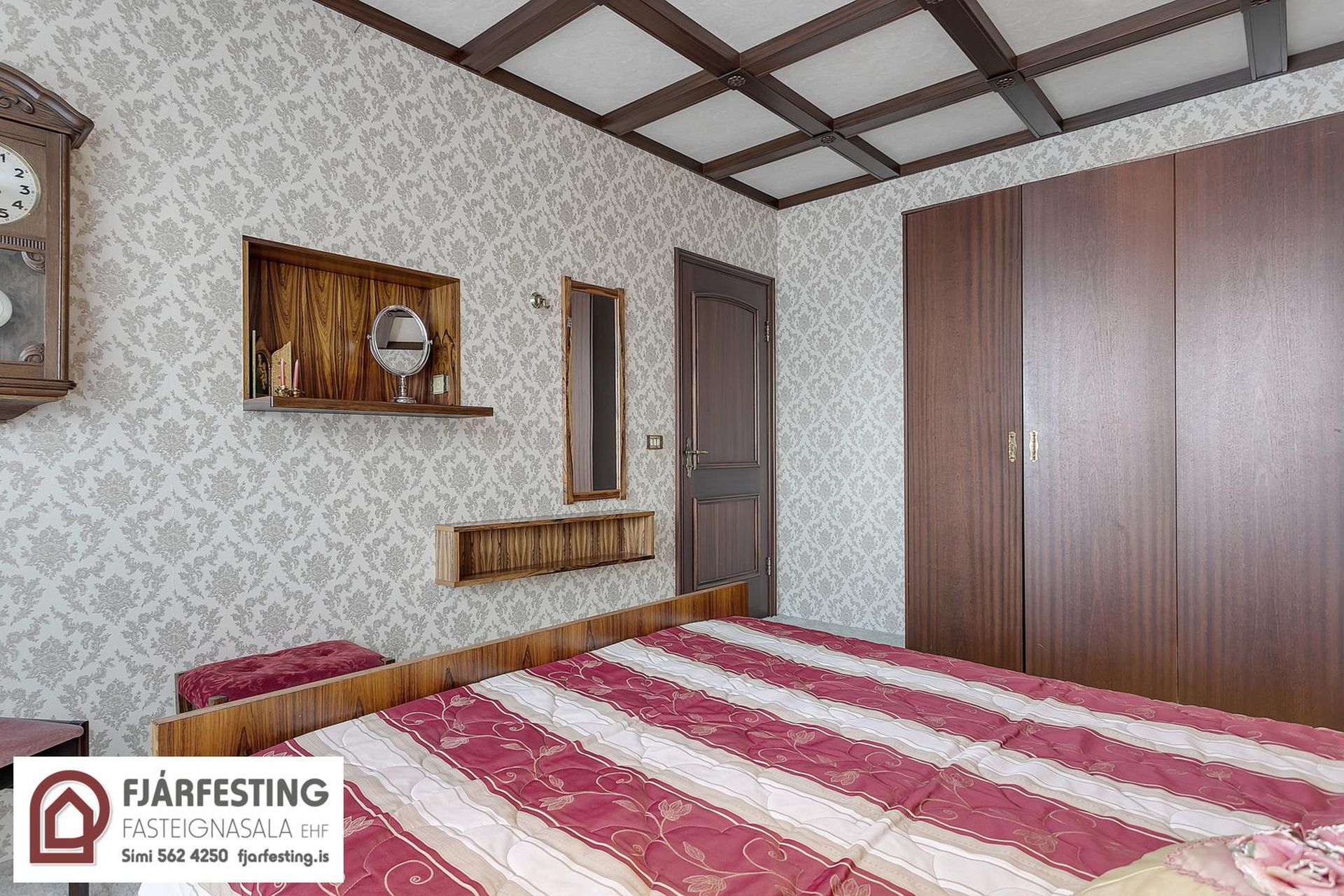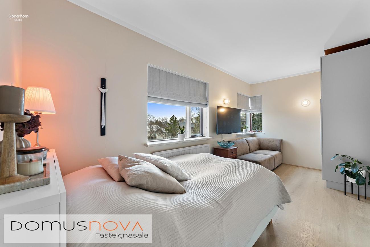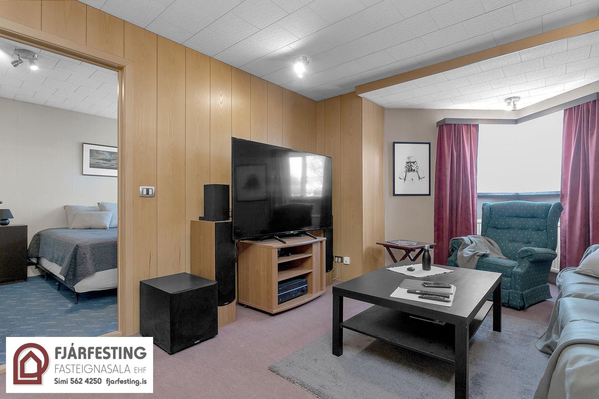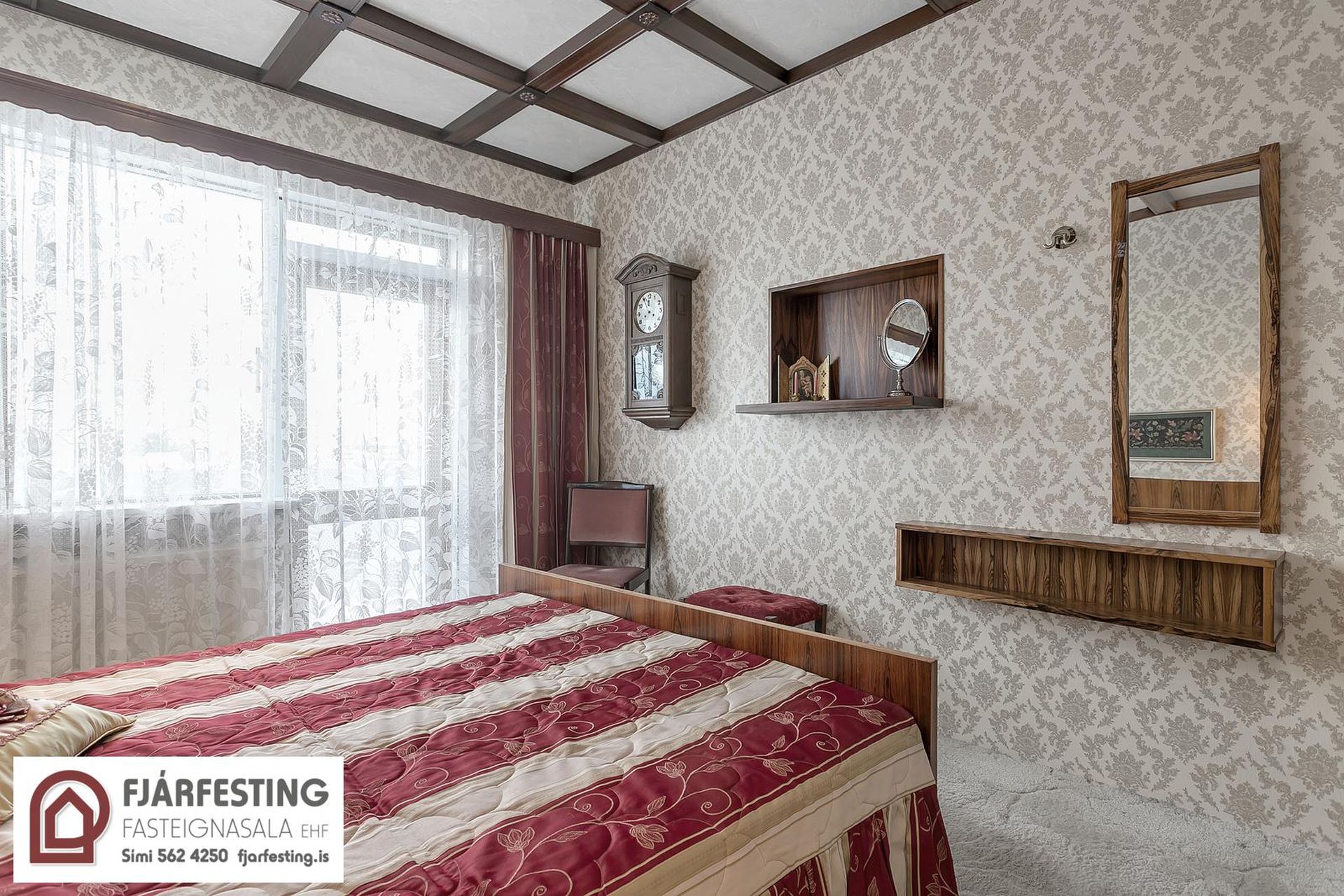 Tvö svefnherbergi á efri hæð. Eitt svefnherbergi í stúdíóíbúð og annað í 2 herbergja íbúð á neðri hæð.
