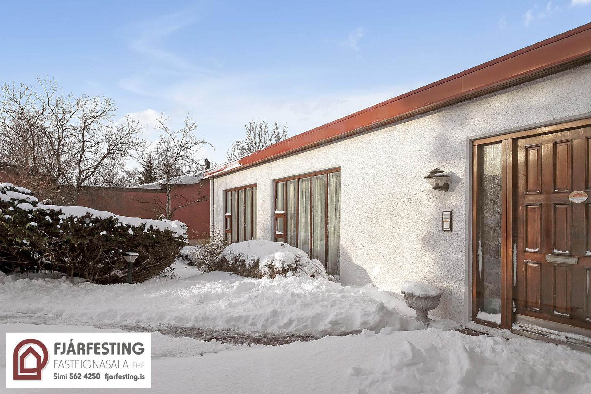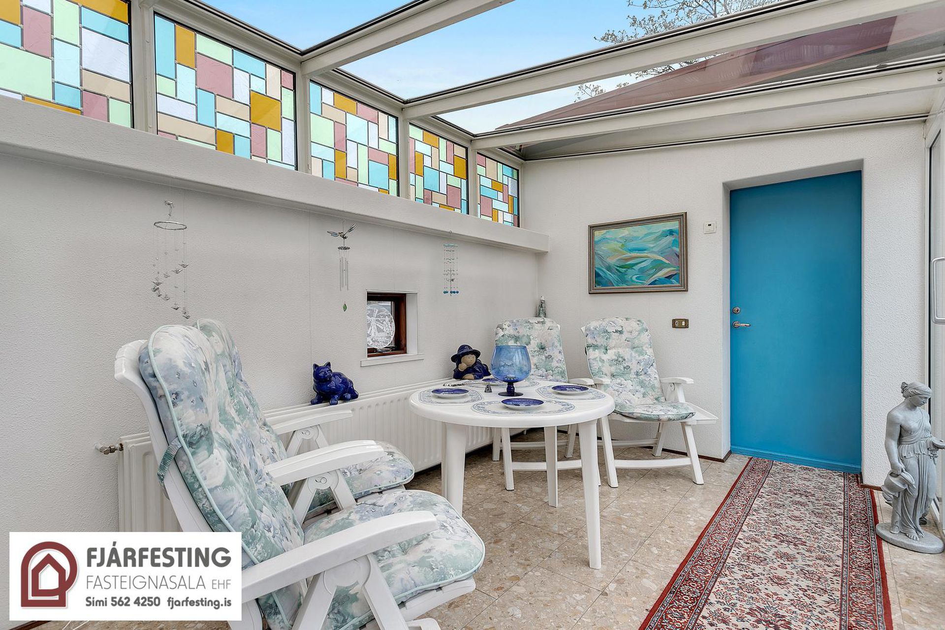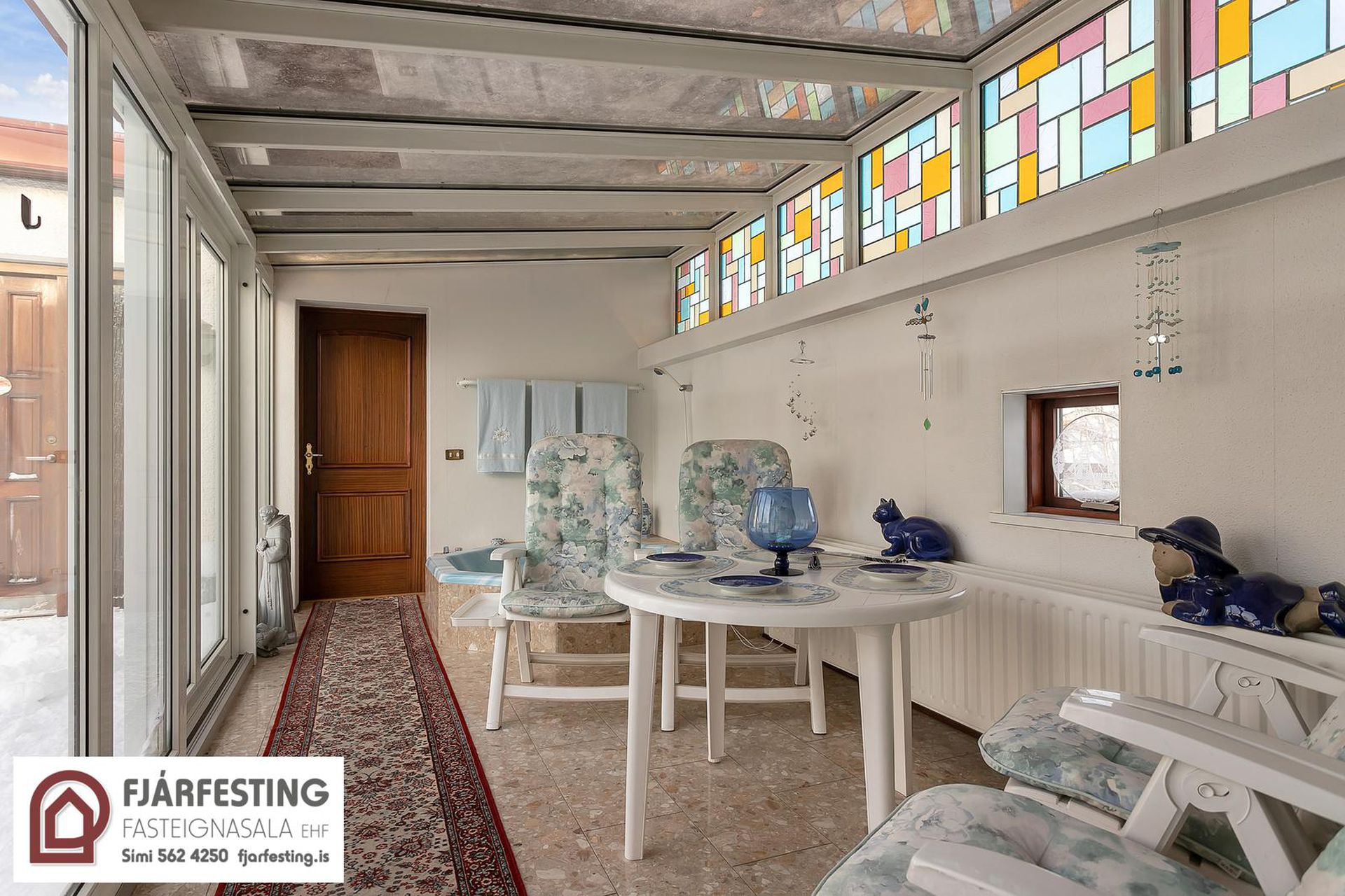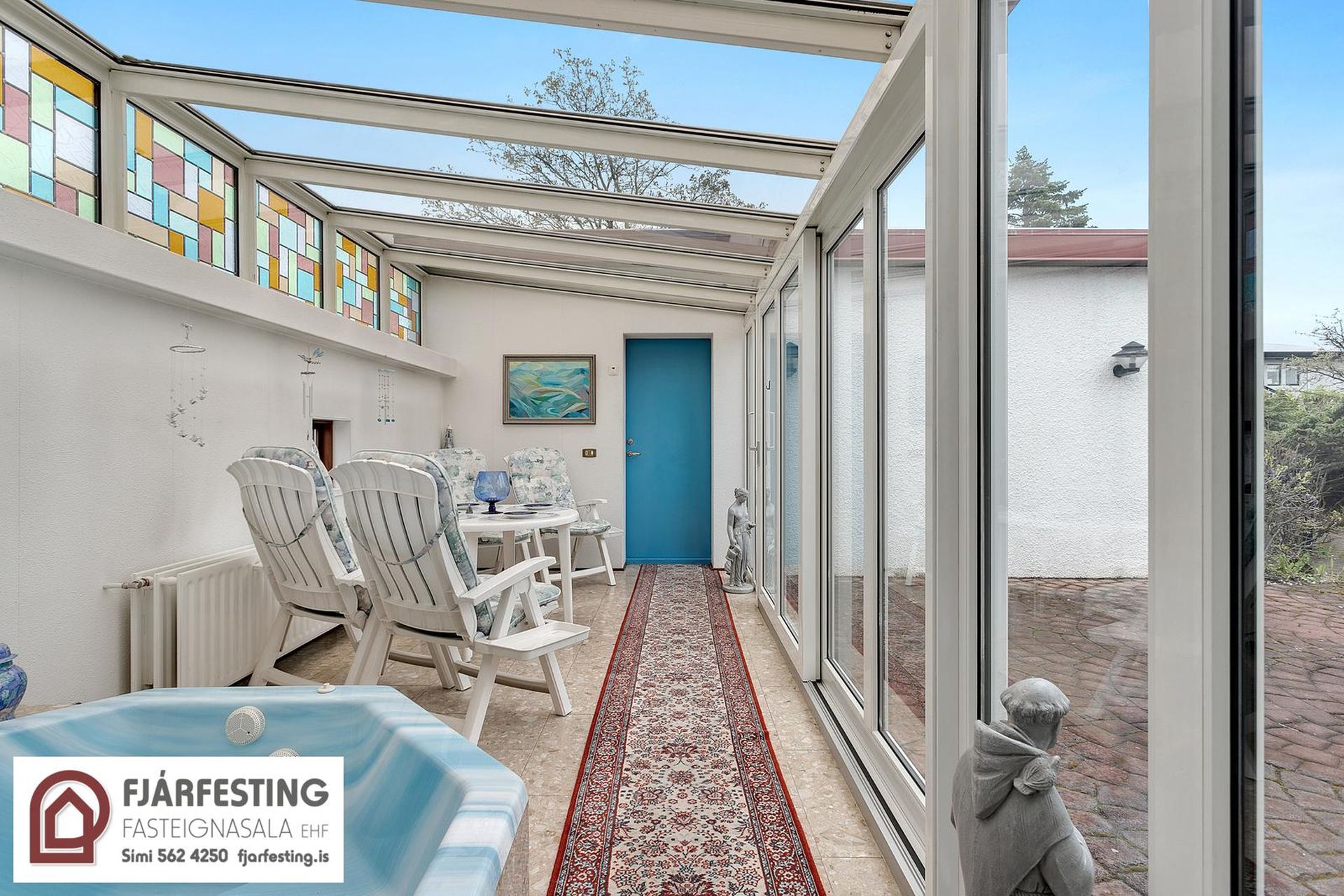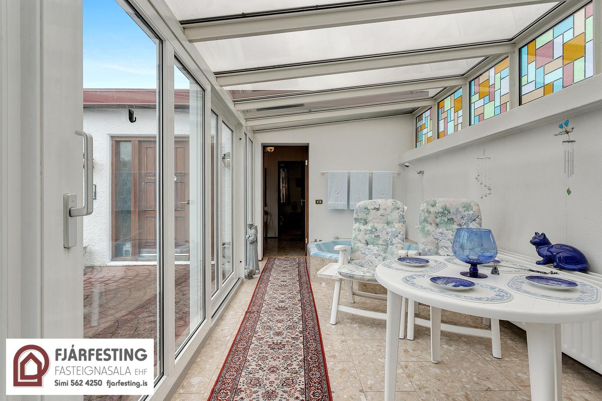 Stór garður til suðurs með góðu skjóli. Tveir sólskálar og nýjar lagnir fyrir heitan pott.