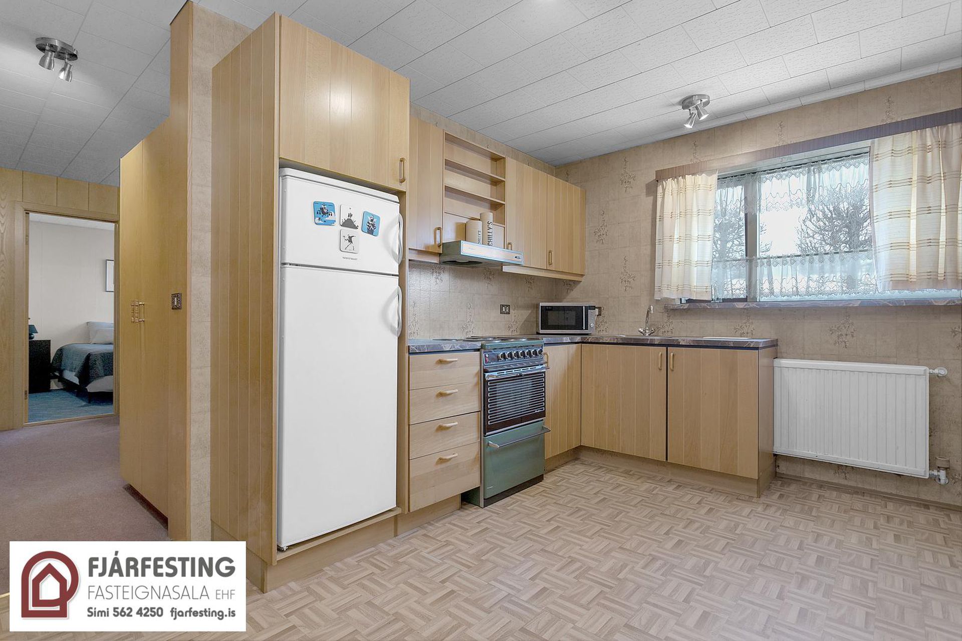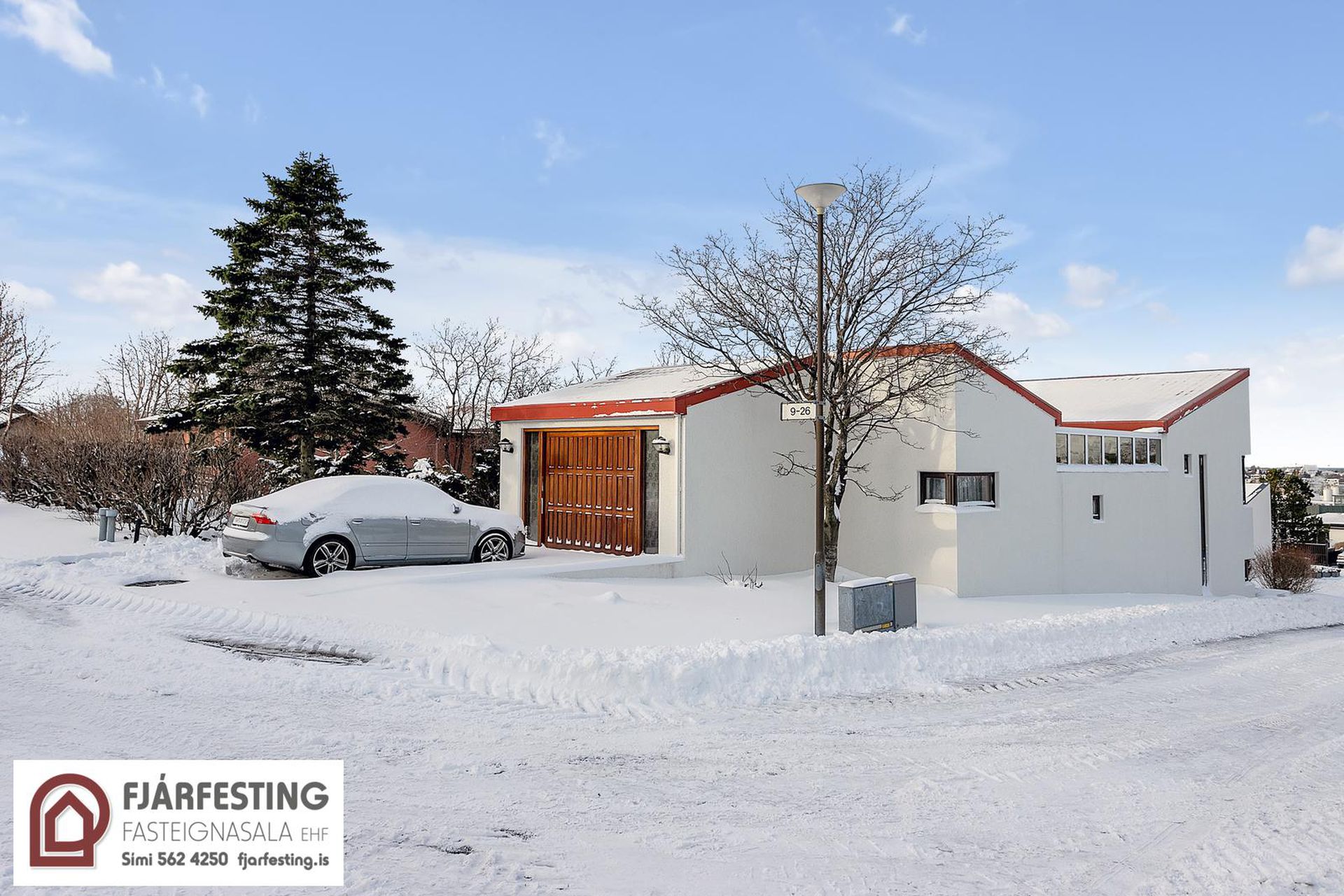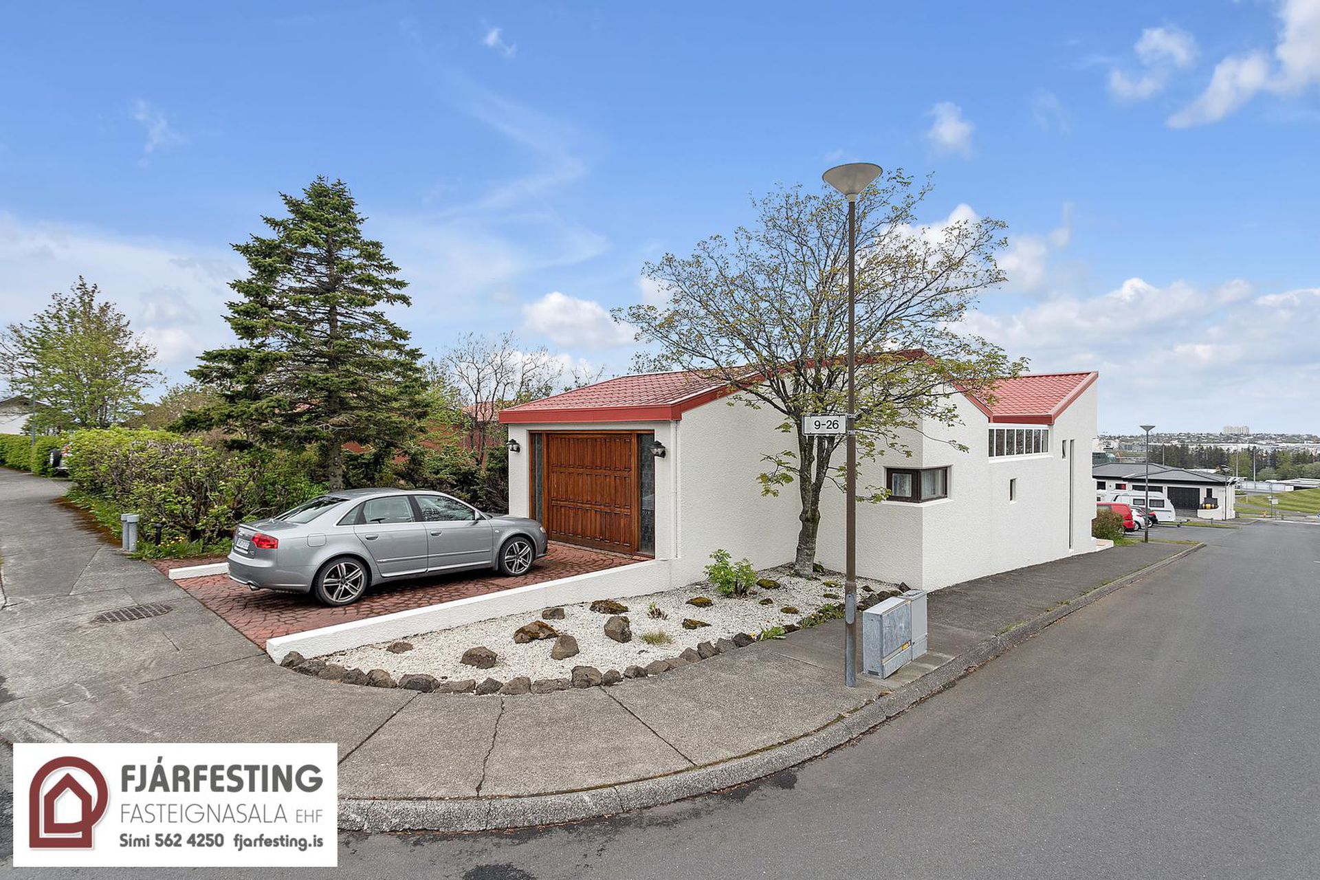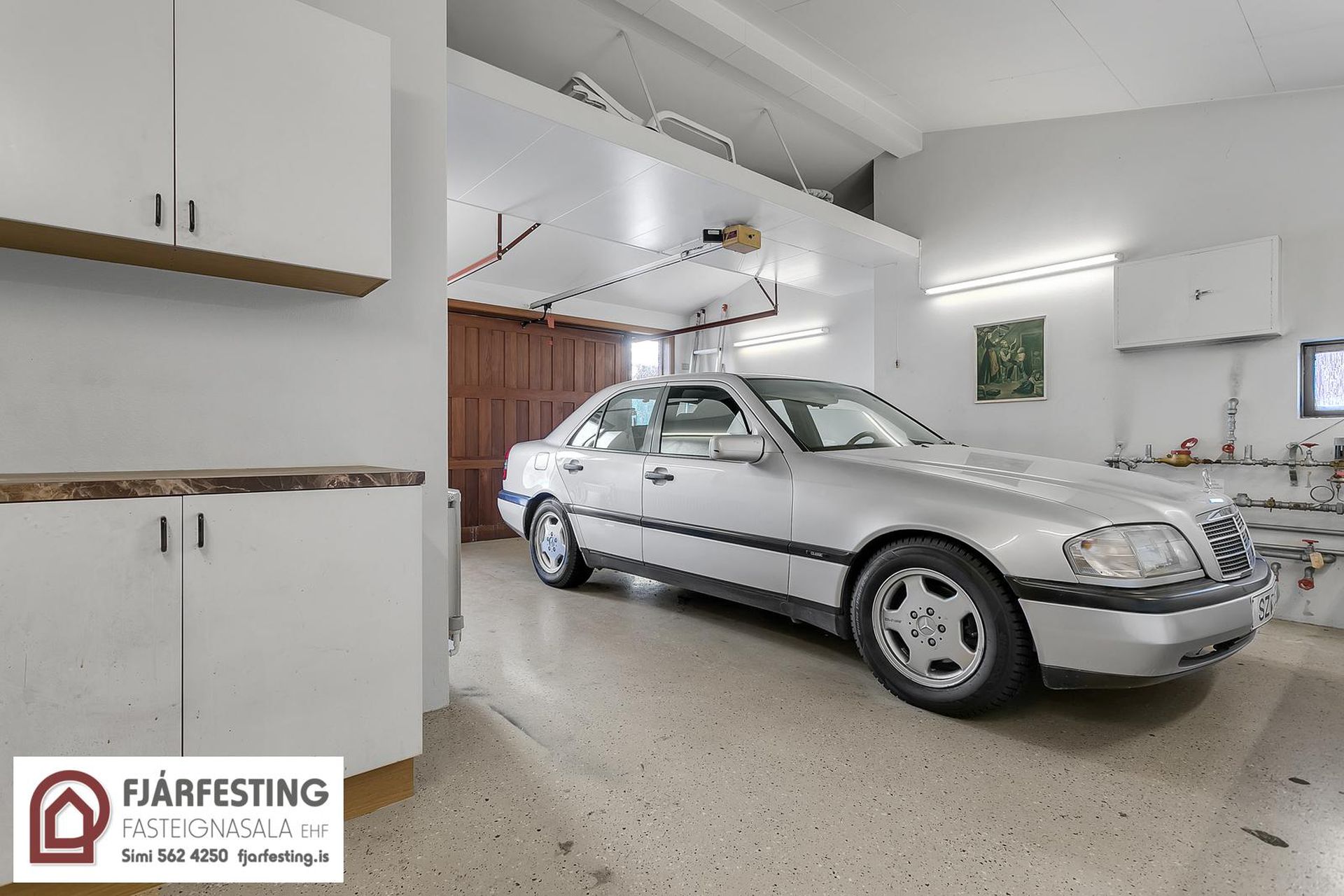 Bílskúr 42,8 fm með geymslum og einfaldri hurð. Bílastæði fyrir framan húsið.