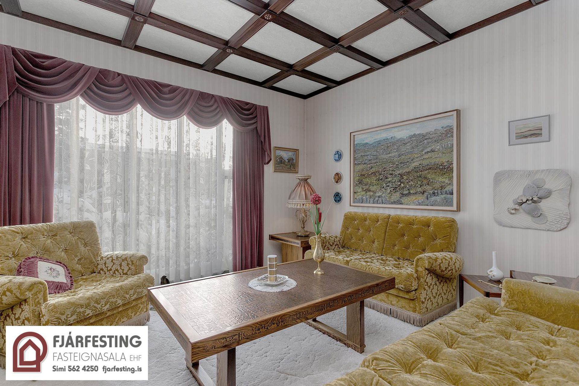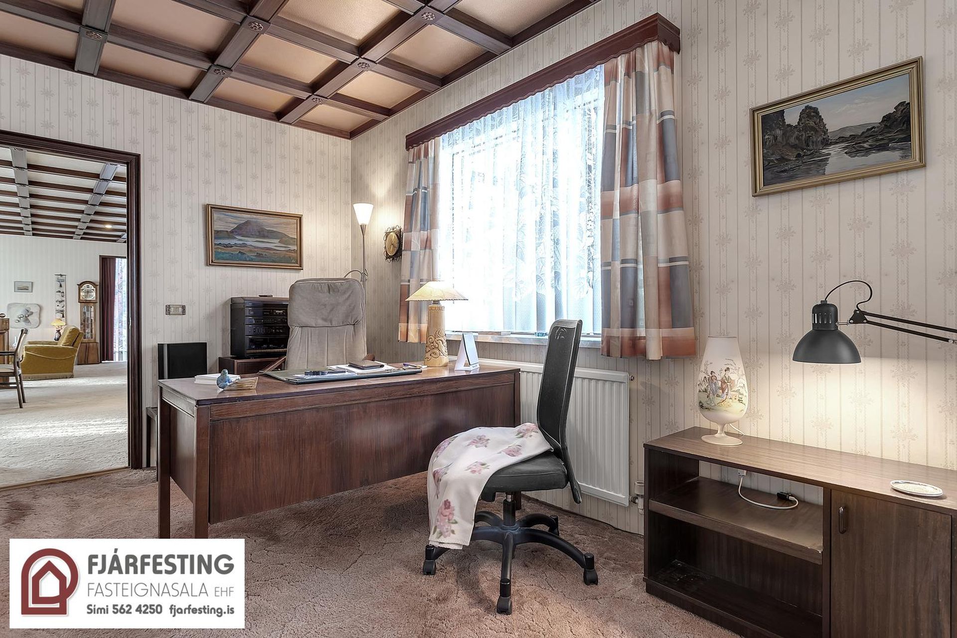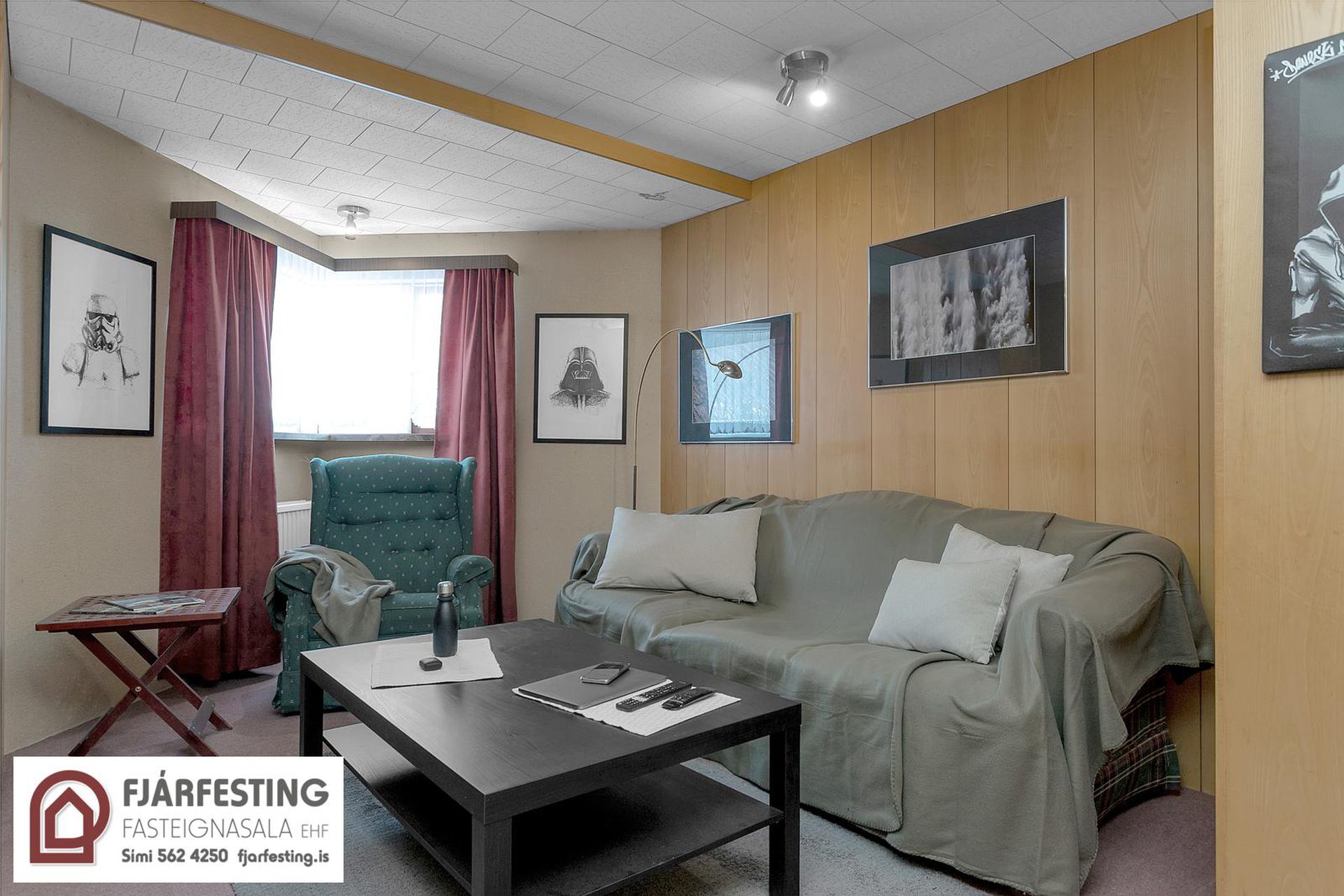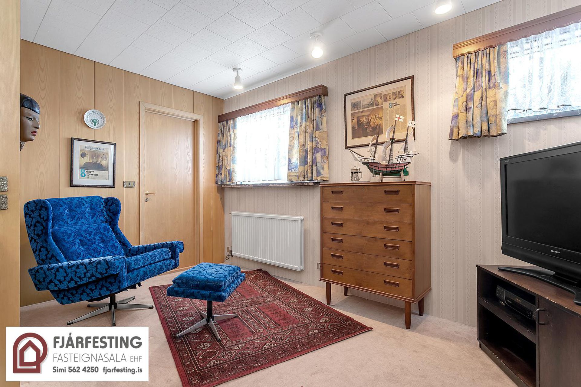Bílskúr 42,8 fm með geymslum og einfaldri hurð. Bílastæði fyrir framan húsið.