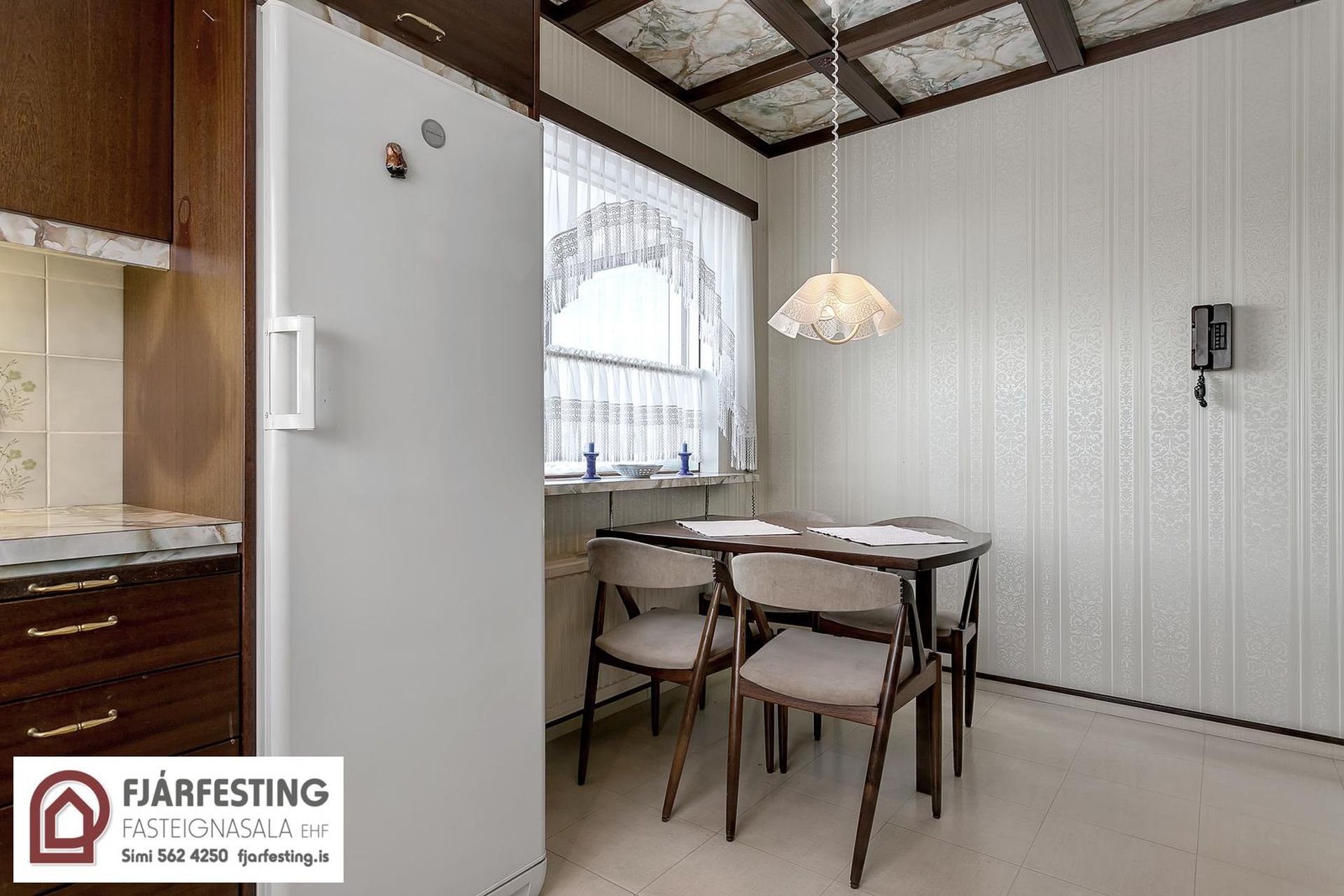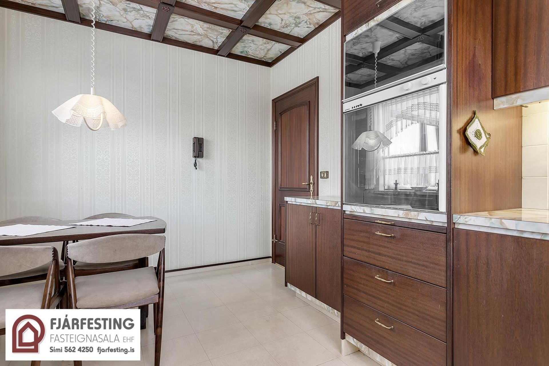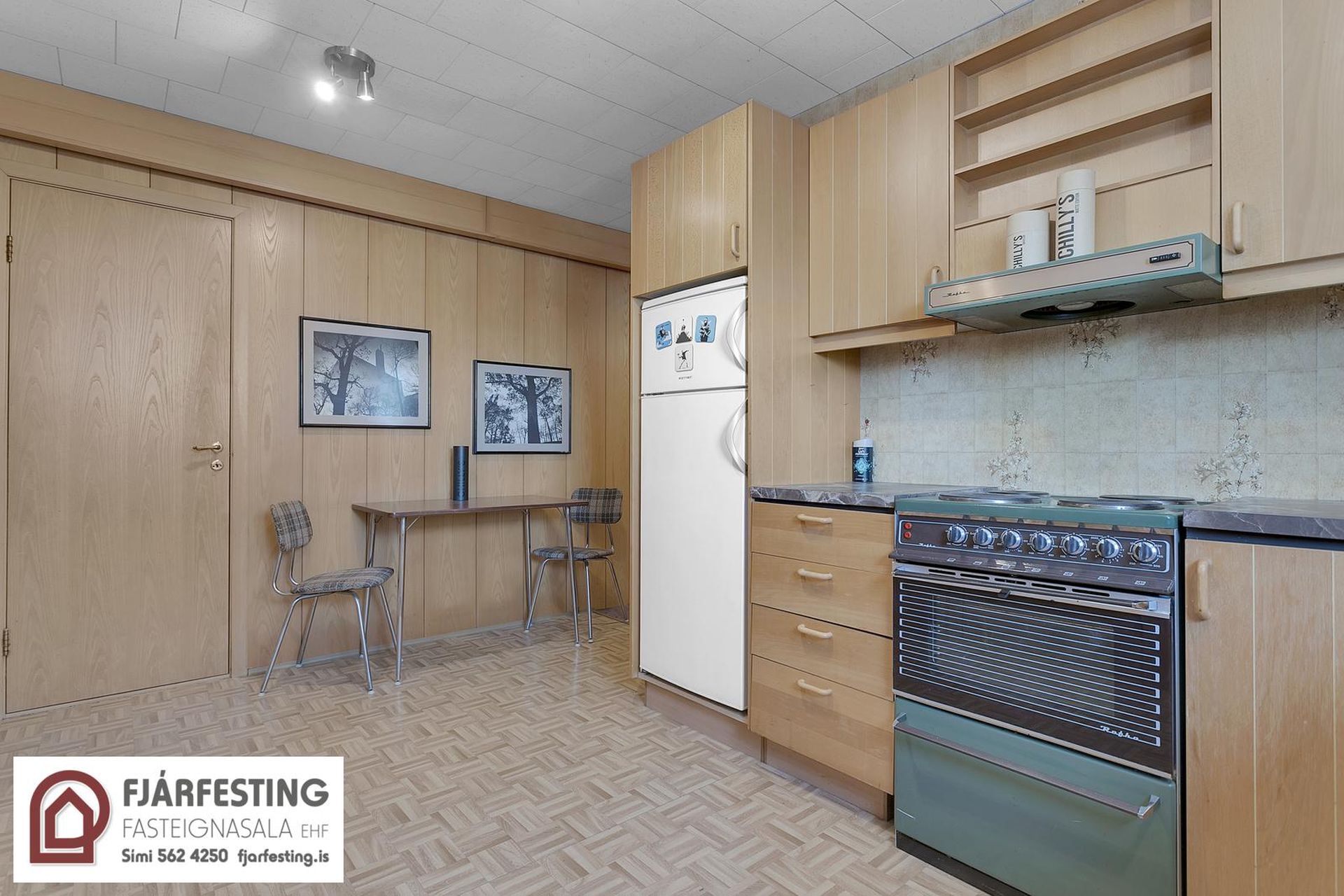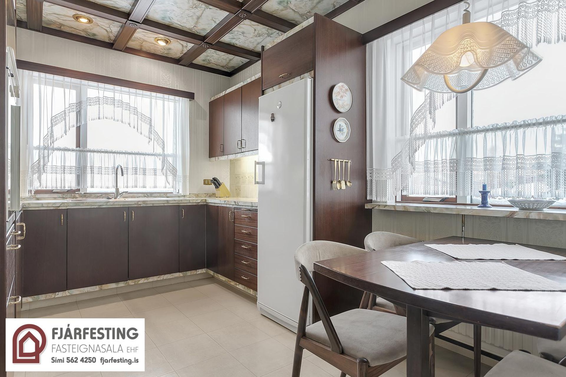 Endurnýjað eldhús á efri hæð með nýjum innréttingum og parketgólfi. Gipsplötur í lofti ókláraðar.