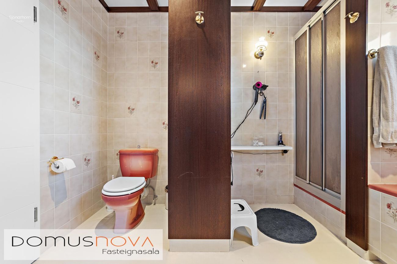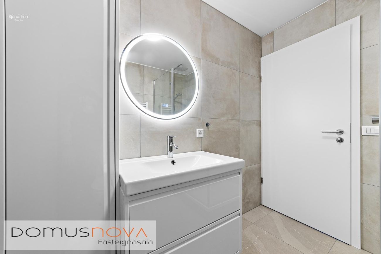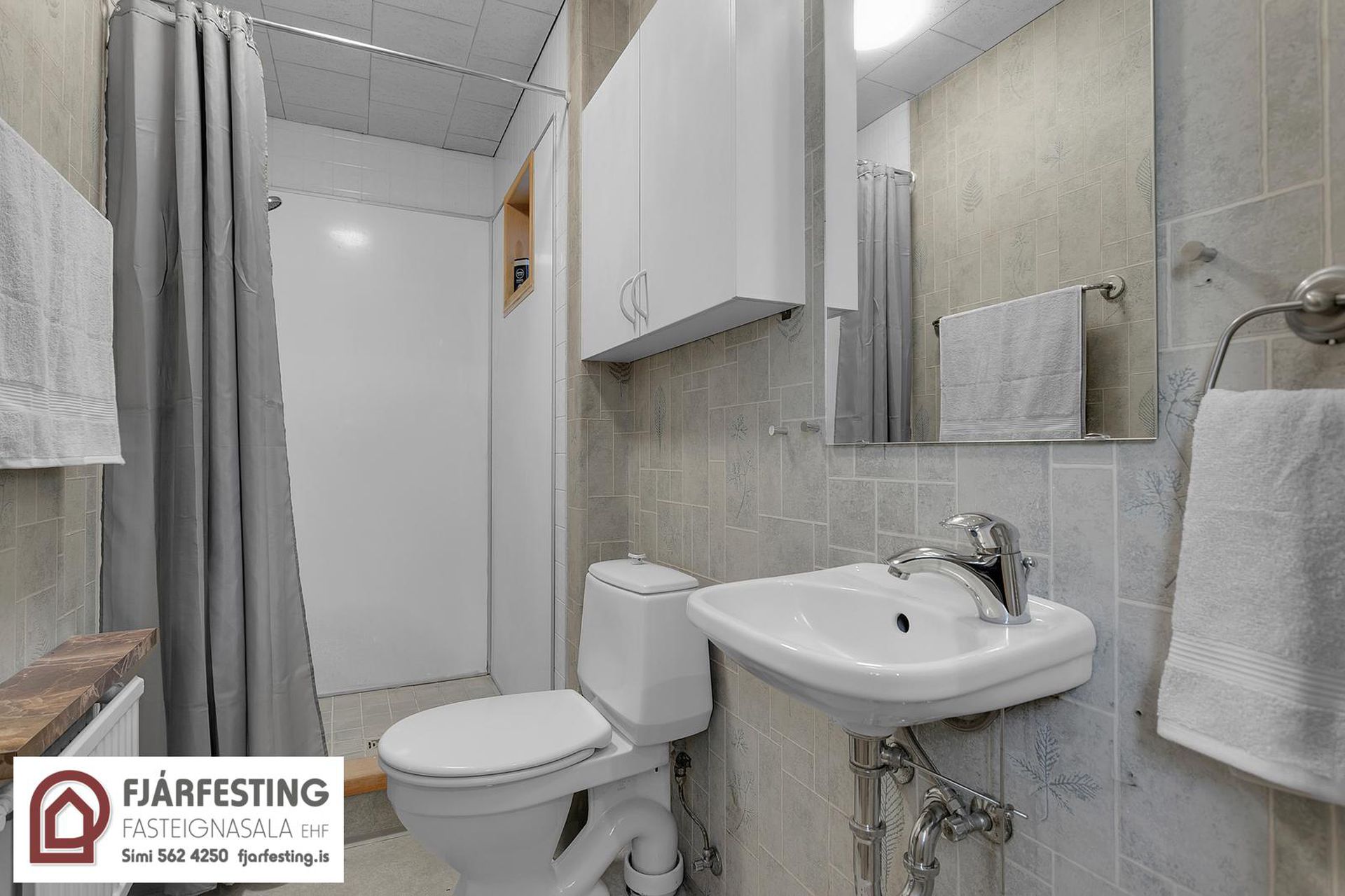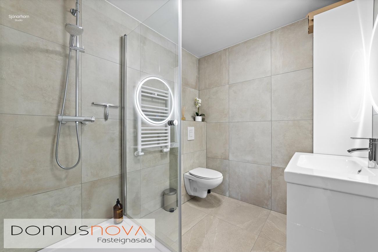 Baðherbergi á efri hæð og í báðum neðri íbúðum með sturtum. Tenging fyrir þvottavél og þurrkara í baðherbergi stúdíóíbúðar.