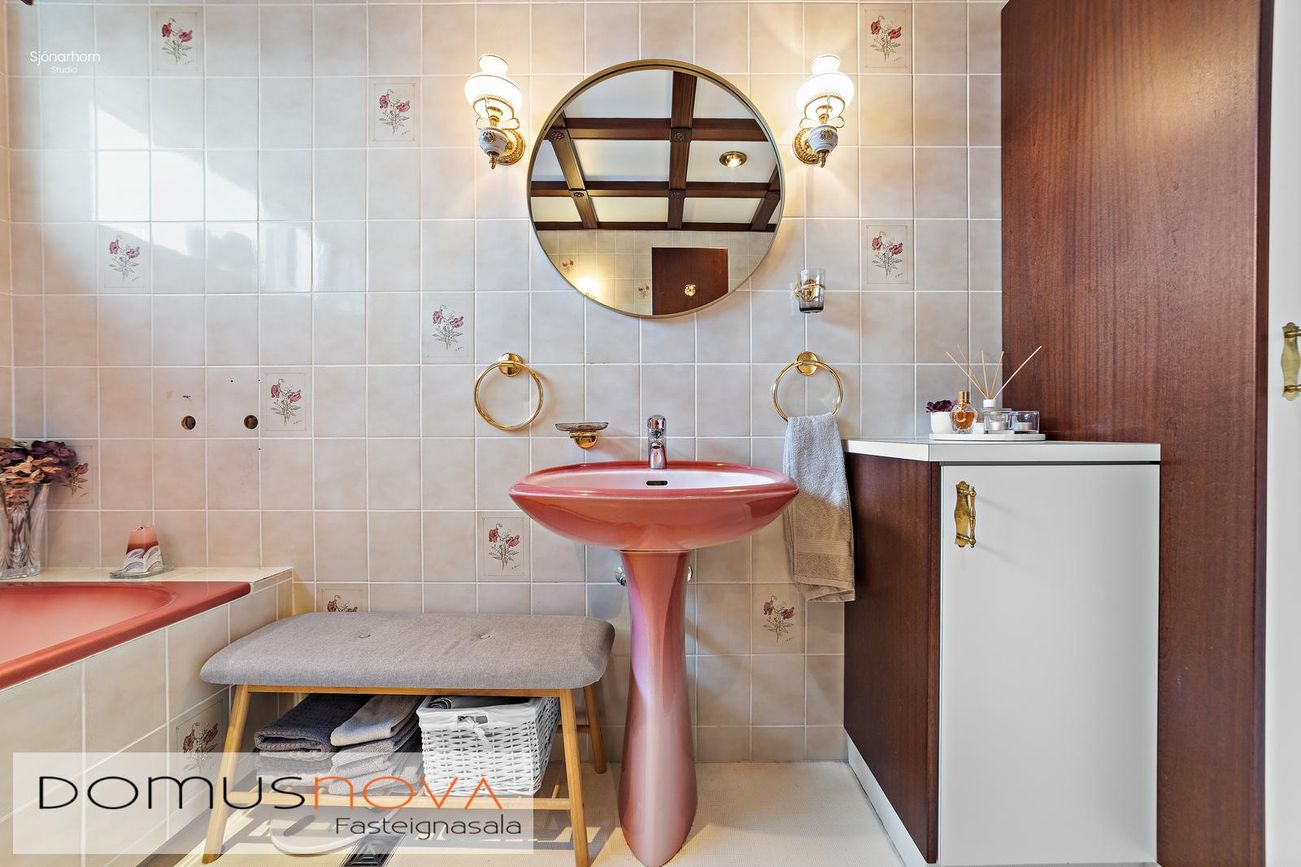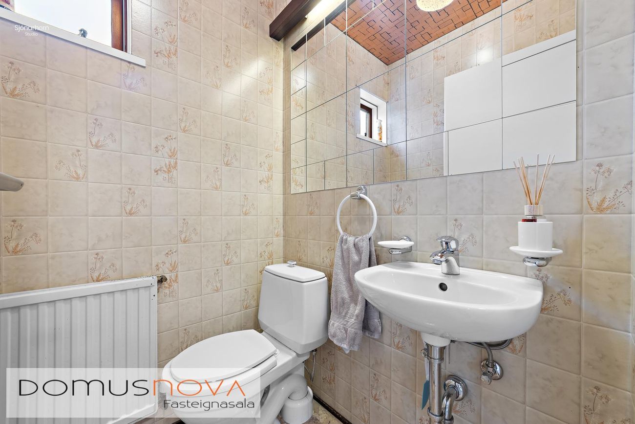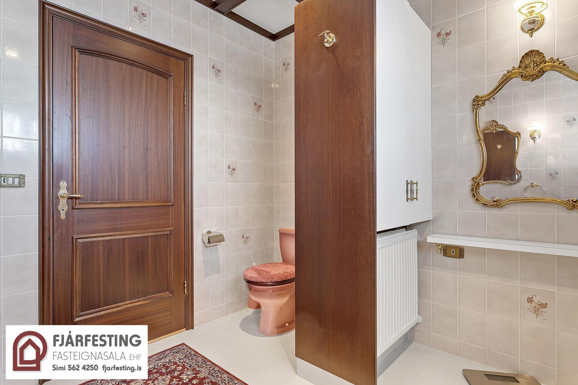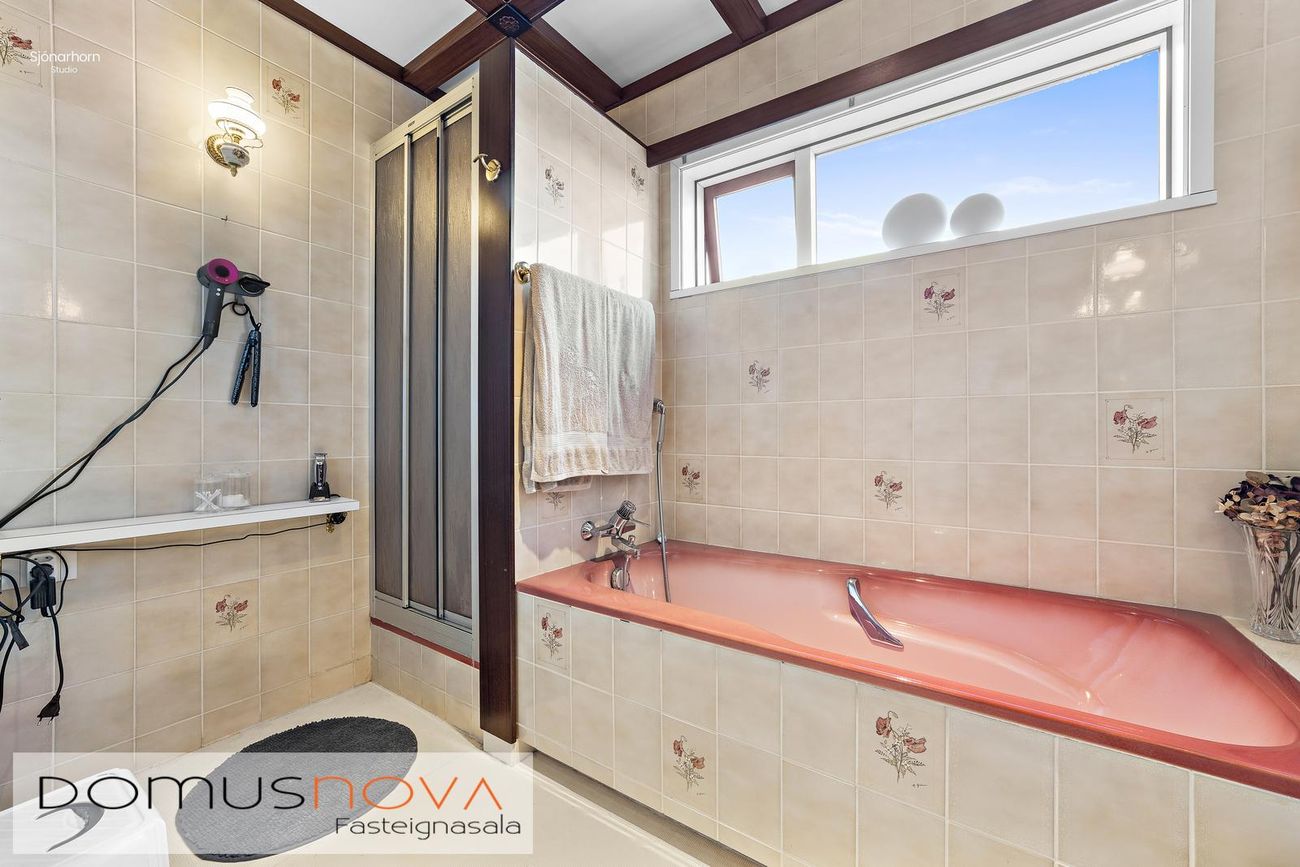 Baðherbergi á efri hæð og í báðum neðri íbúðum með sturtum. Tenging fyrir þvottavél og þurrkara í baðherbergi stúdíóíbúðar.