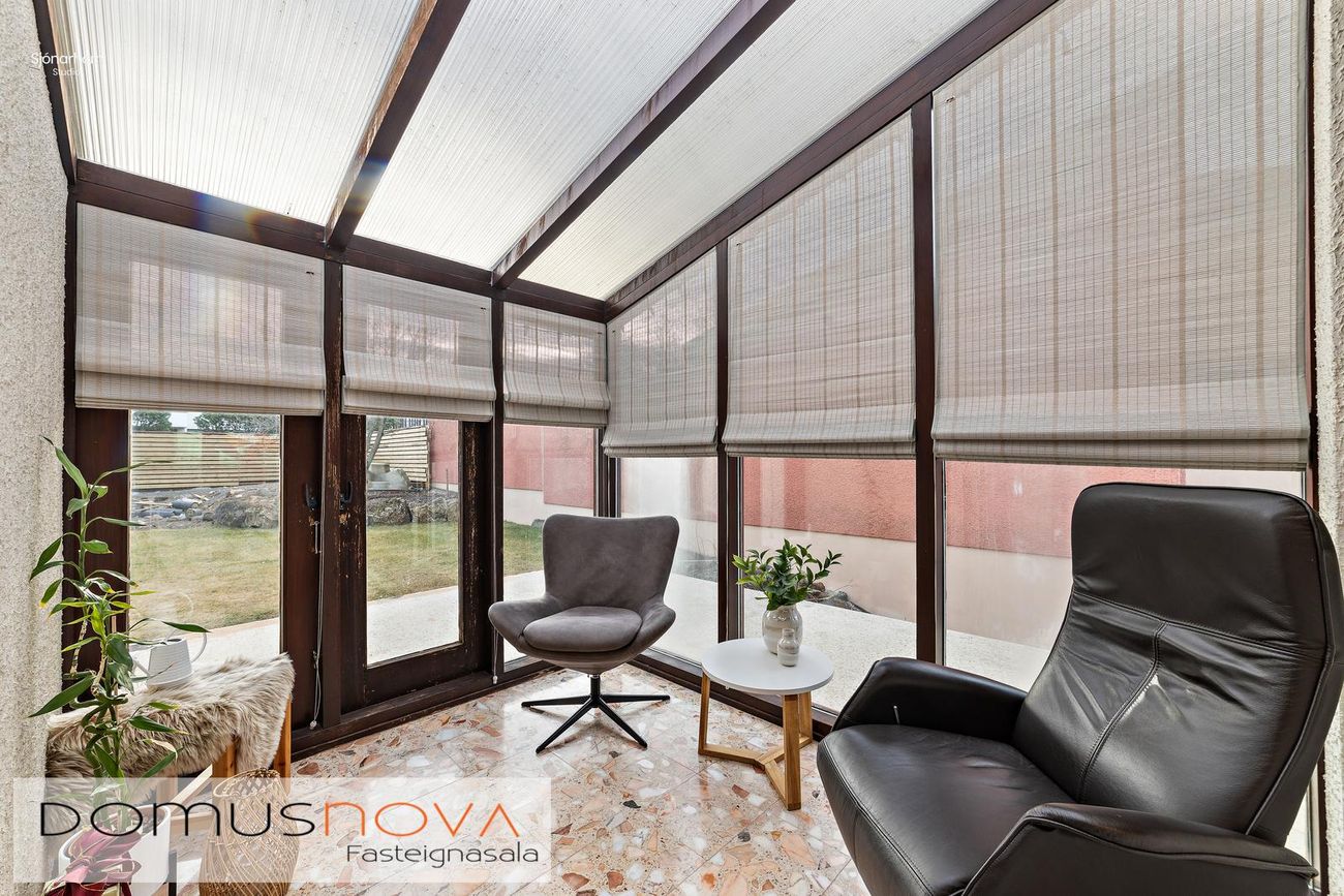 Parketgólf á efri hæð, gipsplötur í lofti og nýjar þakplötur á sólskála.