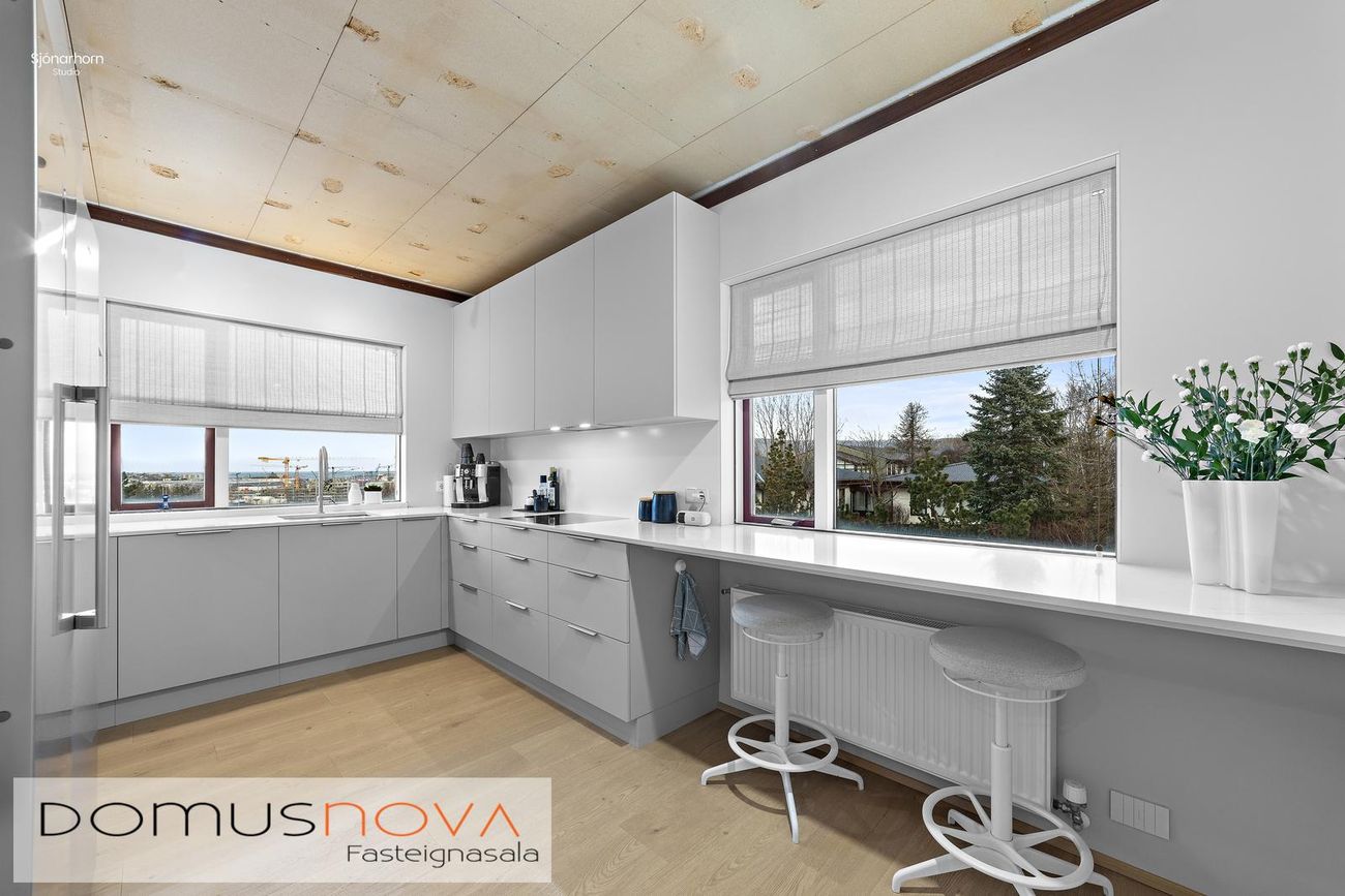 Einbýlishús 274,5 fm með 2 aukaíbúðir (65 fm og 40 fm). Bílskúr 42,9 fm. Nýlega endurnýjað eldhús, parketgólf og kerfi. Glæsilegt útsýni og stór garður.