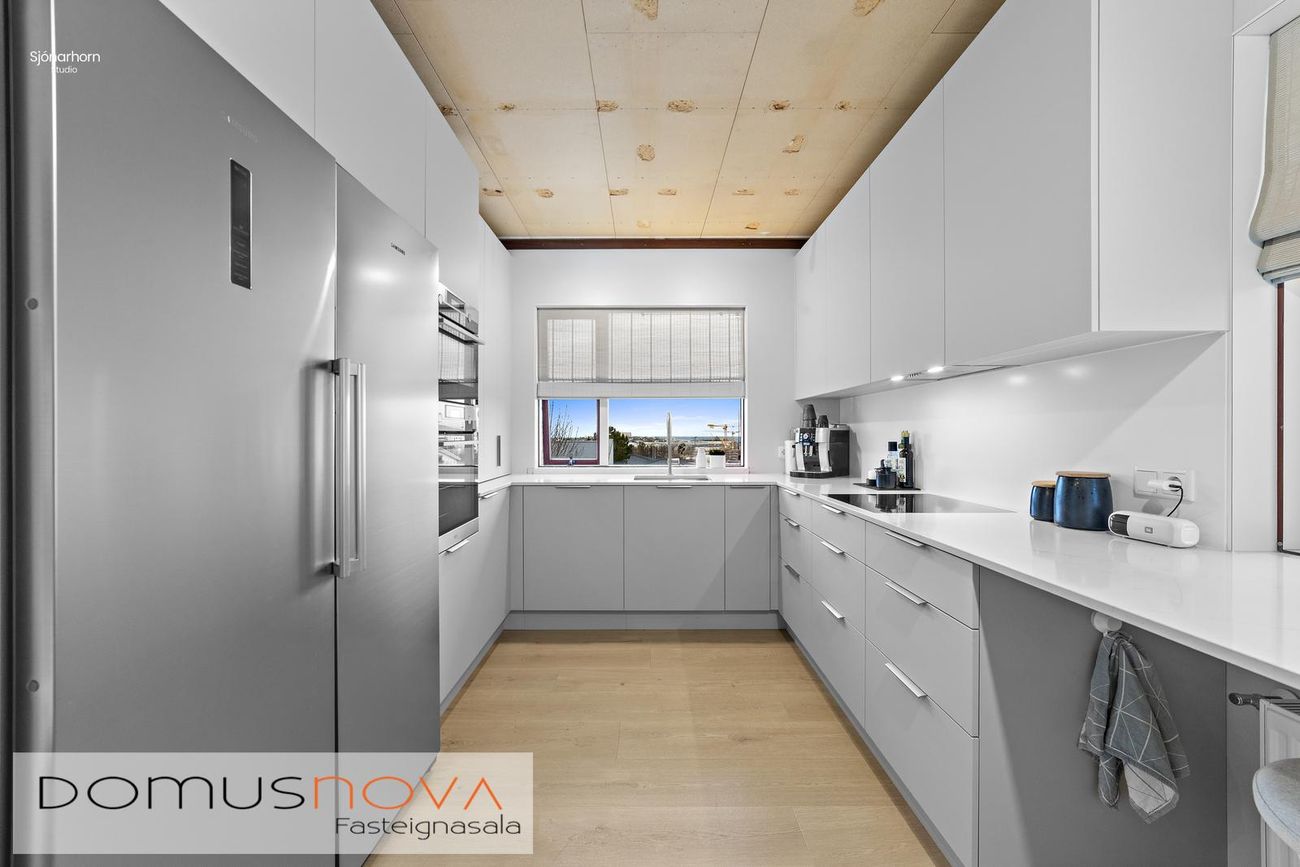 Endurnýjað eldhús á efri hæð með nýjum innréttingum og parketgólfi. Gipsplötur í lofti ókláraðar.