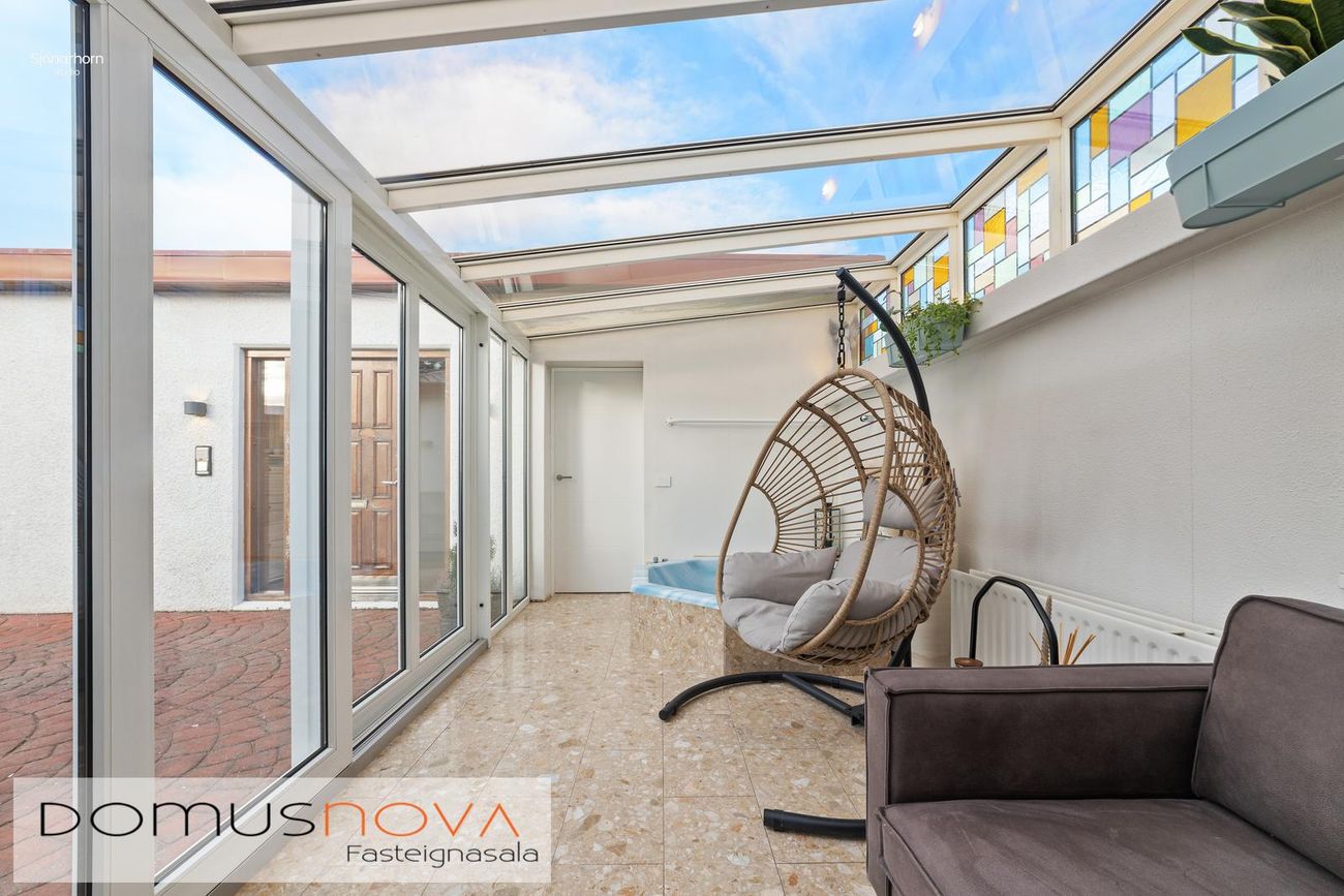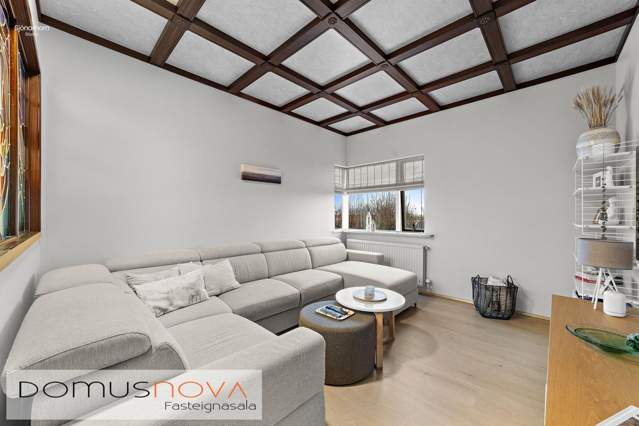 Parketgólf á efri hæð, gipsplötur í lofti og nýjar þakplötur á sólskála.